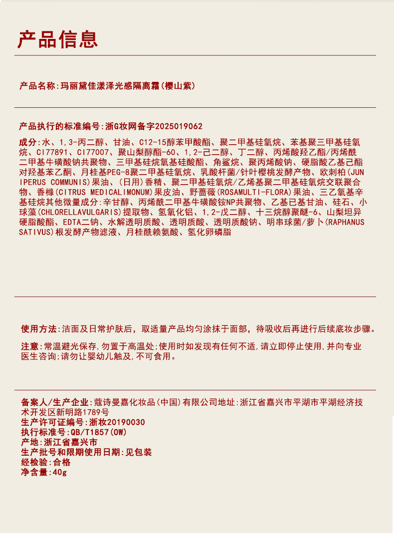 玛丽黛佳漾泽光感隔离霜(樱山紫)40ml【30174403】