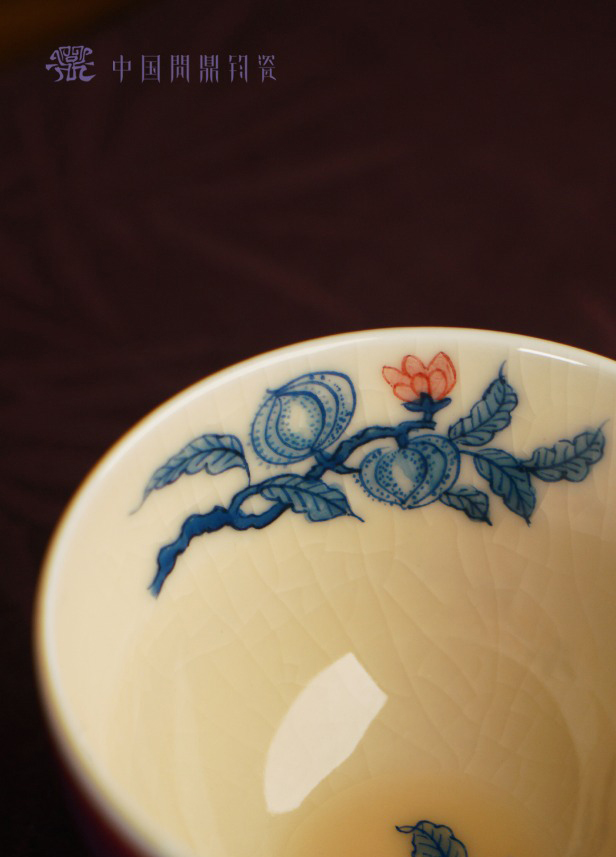 问鼎汝瓷鼎峰柴窑月白观月杯(梵红描金狮子绣球)