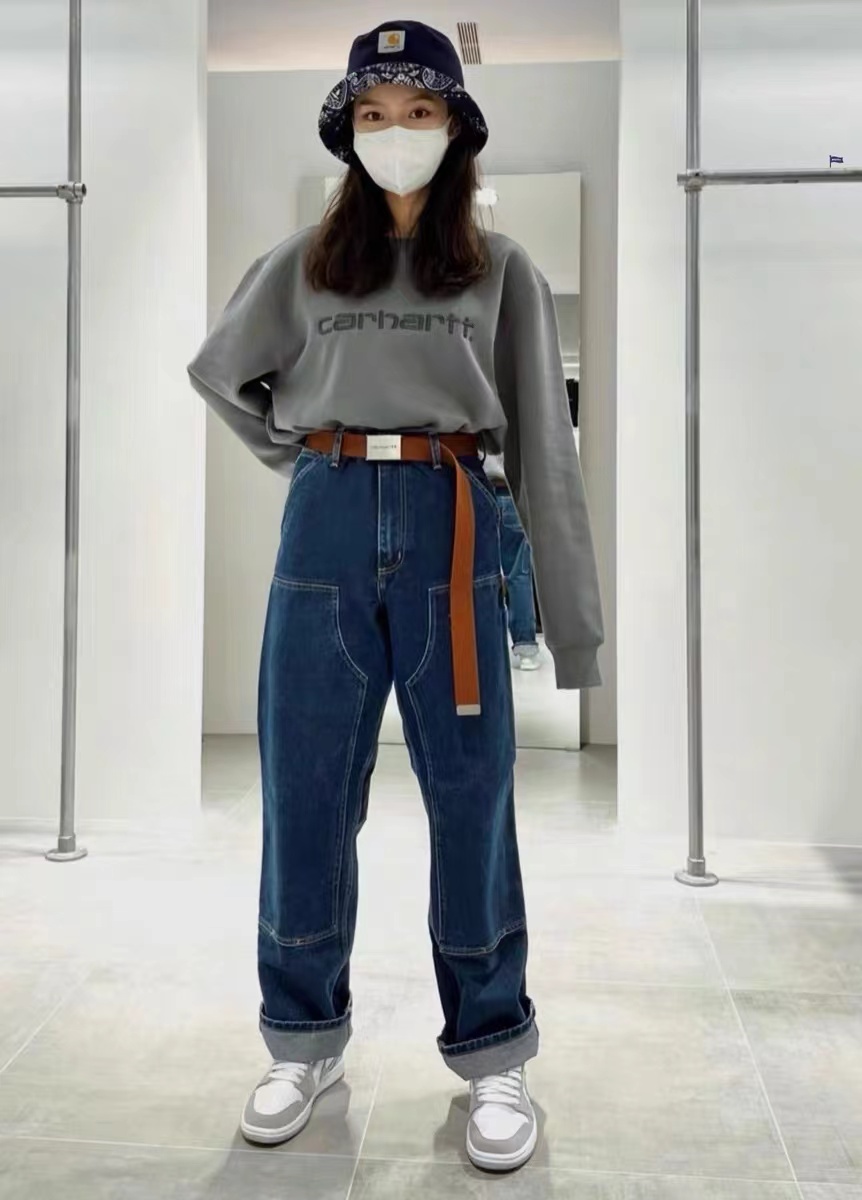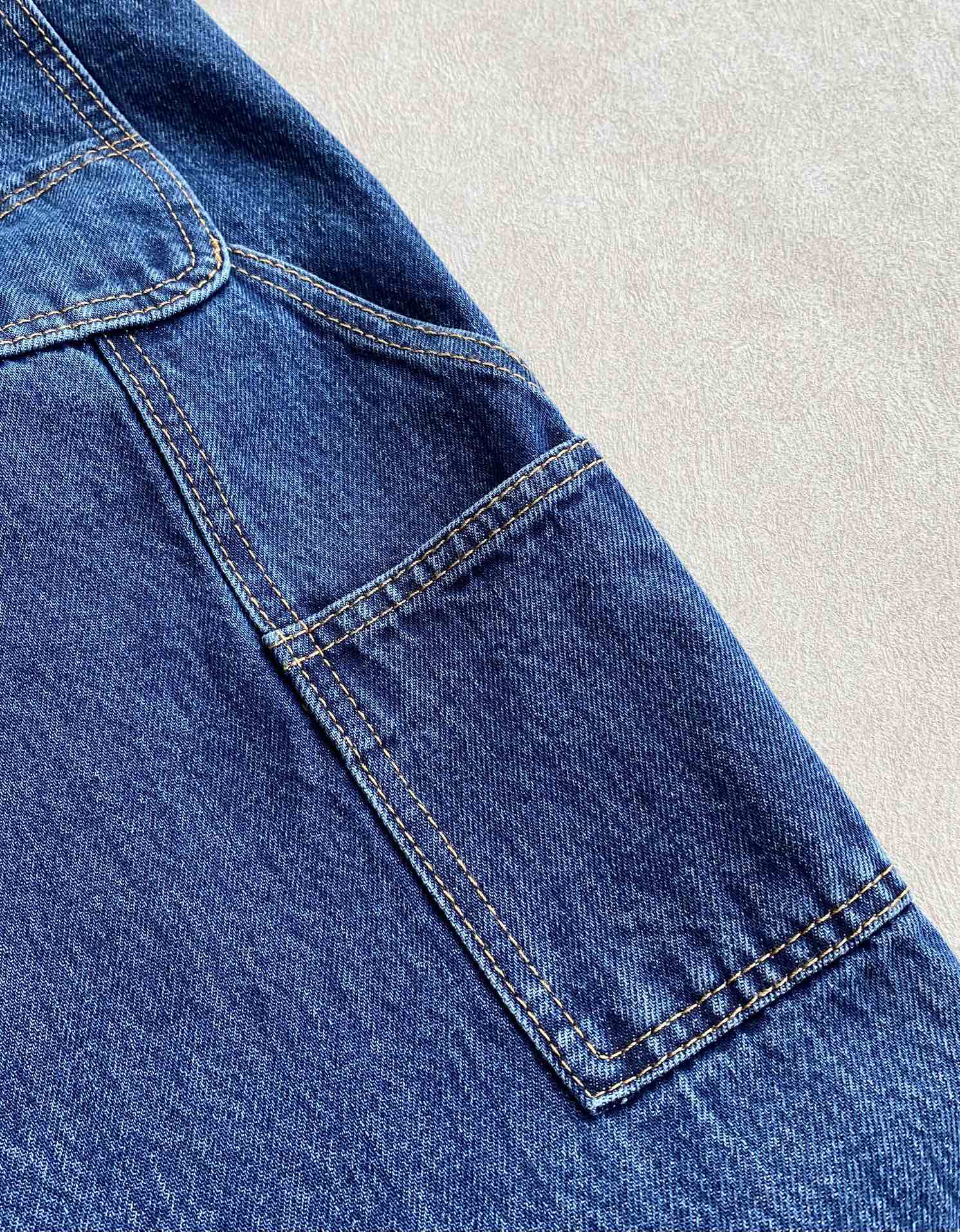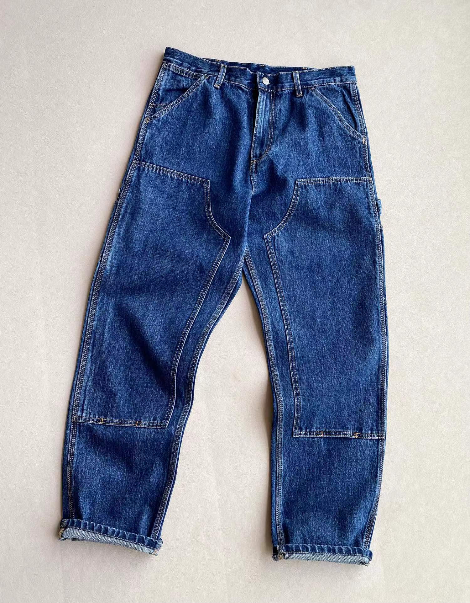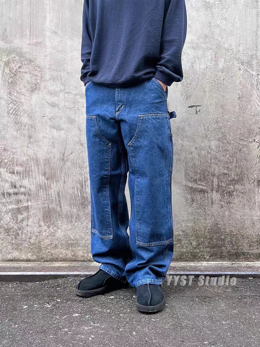 精典方形LOGO多口袋石洗宽松直筒工装牛仔裤 重磅牛仔伐木双膝裤刘文机场秀上身,男女都可以轻松穿搭,版型正立体度nice 帅气又有个性!面料采用 机棉牛仔布 13.5oz重磅纯棉丹宁 经过水洗质感更好,不是邦邦硬的,柔软又有韧性。膝盖处双侧增加耐磨度。套结缝线 三层走线缝合~ 大力提升工装质感。版型 宽松直筒版型 常规无松紧扣子+拉链开合 无松紧。有腰环可系腰带。
