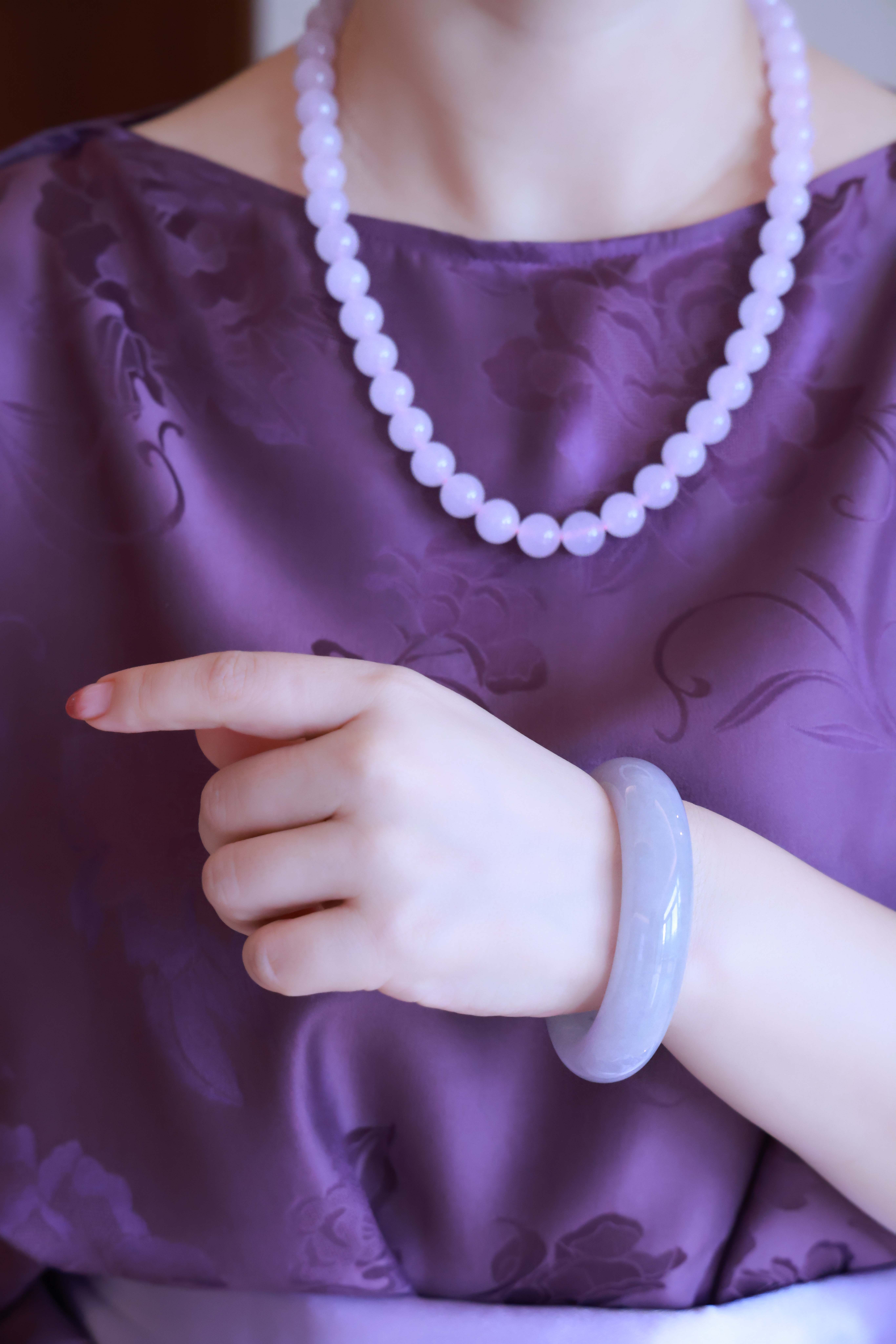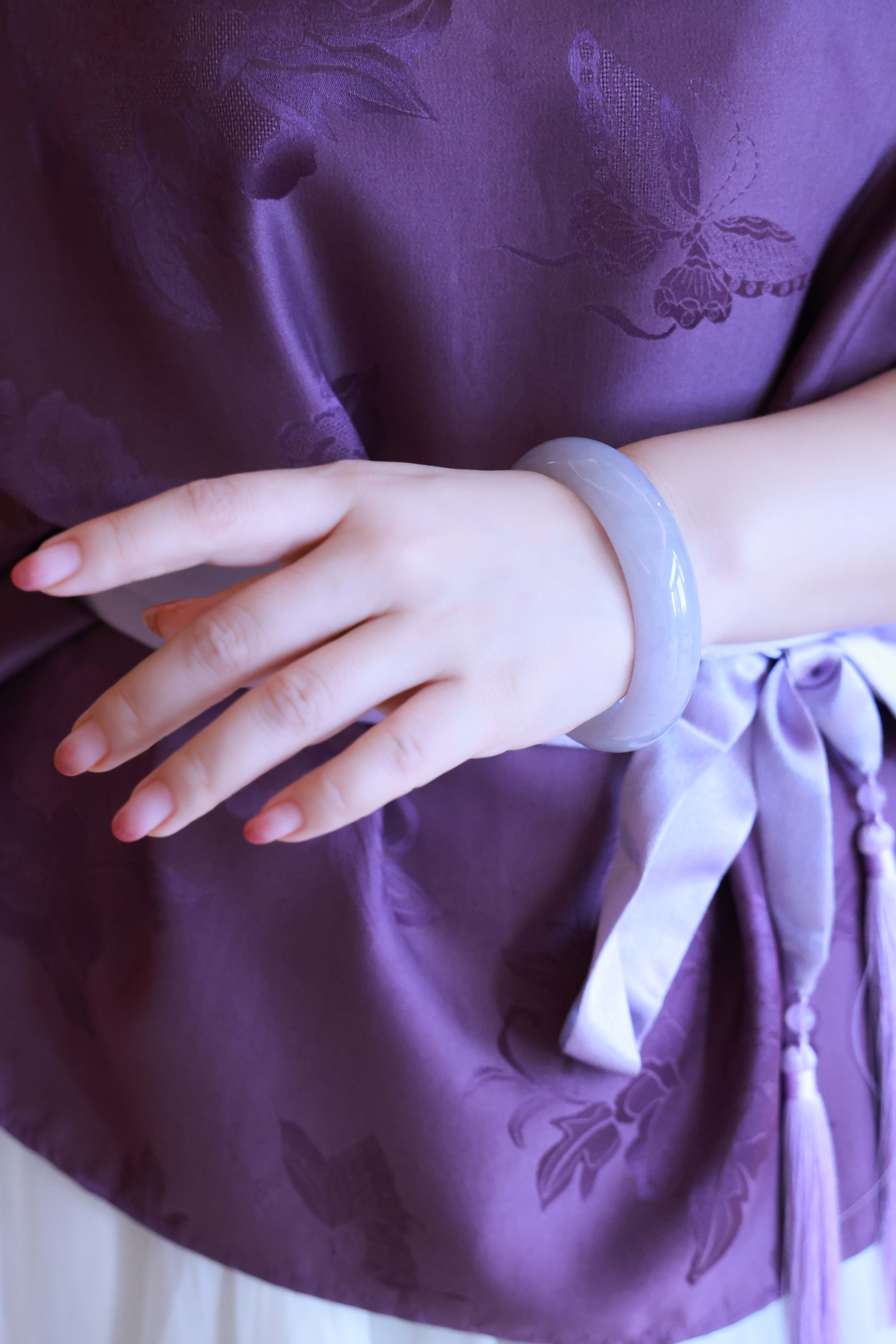 质地润泽的翡翠手镯,清雅的淡紫色,上有淡淡飘黄,大气宽版平安镯,佩戴舒适。手镯寓意“卓尔不群”、“一生圆满”,每个东方女人,一生都该拥有一只属于自己的玉镯。