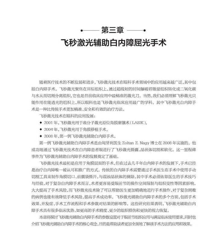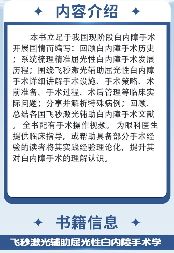 本书立足于我国现阶段白内障手术开展国情而编写:回顾白内障手术历史;系统梳理精准屈光性白内障手术发展历程;围绕飞秒激光辅助屈光性白内障手术详细讲解手术设施、手术策略、术前准备、手术过程、术后管理等临床实际问题;分享并解析特殊病例;回顾、总结各国飞秒激光辅助白内障手术文献。 全书配有手术操作视频。 为眼科医生提供临床指导,或帮助具备部分手术经验的读者将其实践经验理论化,提升其对白内障手术的理解认识。