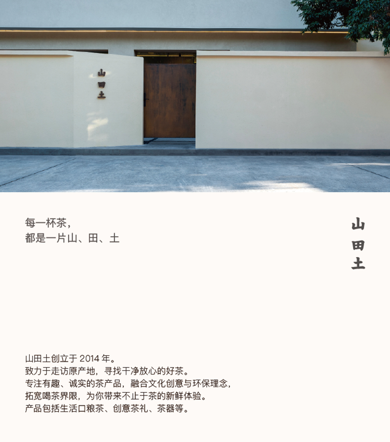 山田土是一个茶品牌。致力于走访茶区,寻找地方茶。亲眼看,亲口尝,将心比心挑选优质原料、把关工艺、审评质量,以有趣的方式呈现一杯干净好茶,让你饮用安心,感官愉悦。 产品包括:日常口粮茶,节庆茶礼,茶器