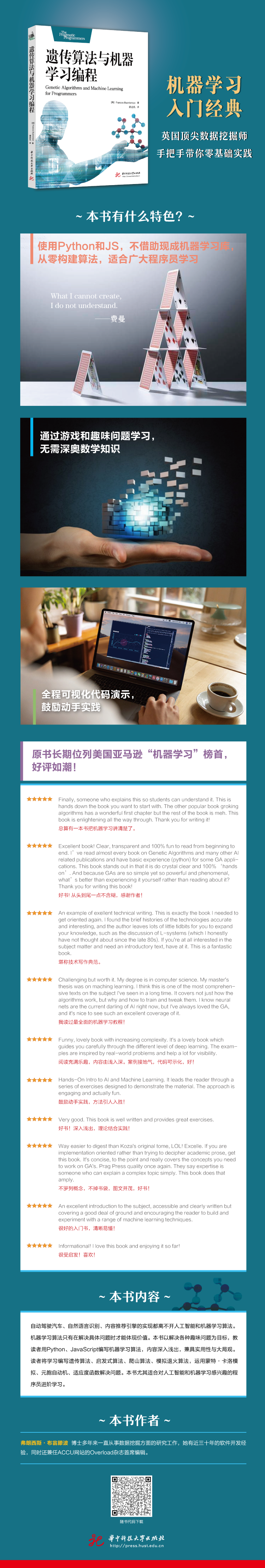 自动驾驶汽车、自然语言识别、内容推荐引擎的实现都离不开人工智能和机器学习算法。机器学习算法只有在解决具体问题时才能体现价值。本书以解决各种趣味问题为目标,教读者用Python、JavaScript、C++编写机器学习算法,内容深入浅出,兼具实用性与大局观。读者将学习编写遗传算法、启发式算法、爬山算法、模拟退火算法,运用蒙特·卡洛模拟、点格自动机、适应函数解决问题。本书尤其适合对人工智能和机器学习感兴趣的程序员进阶学习。