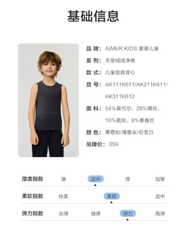 【春上新】8楼爱慕儿童Aimer Kids中性天使绒绒净痕宽肩背心AK311K612,吊牌价359元