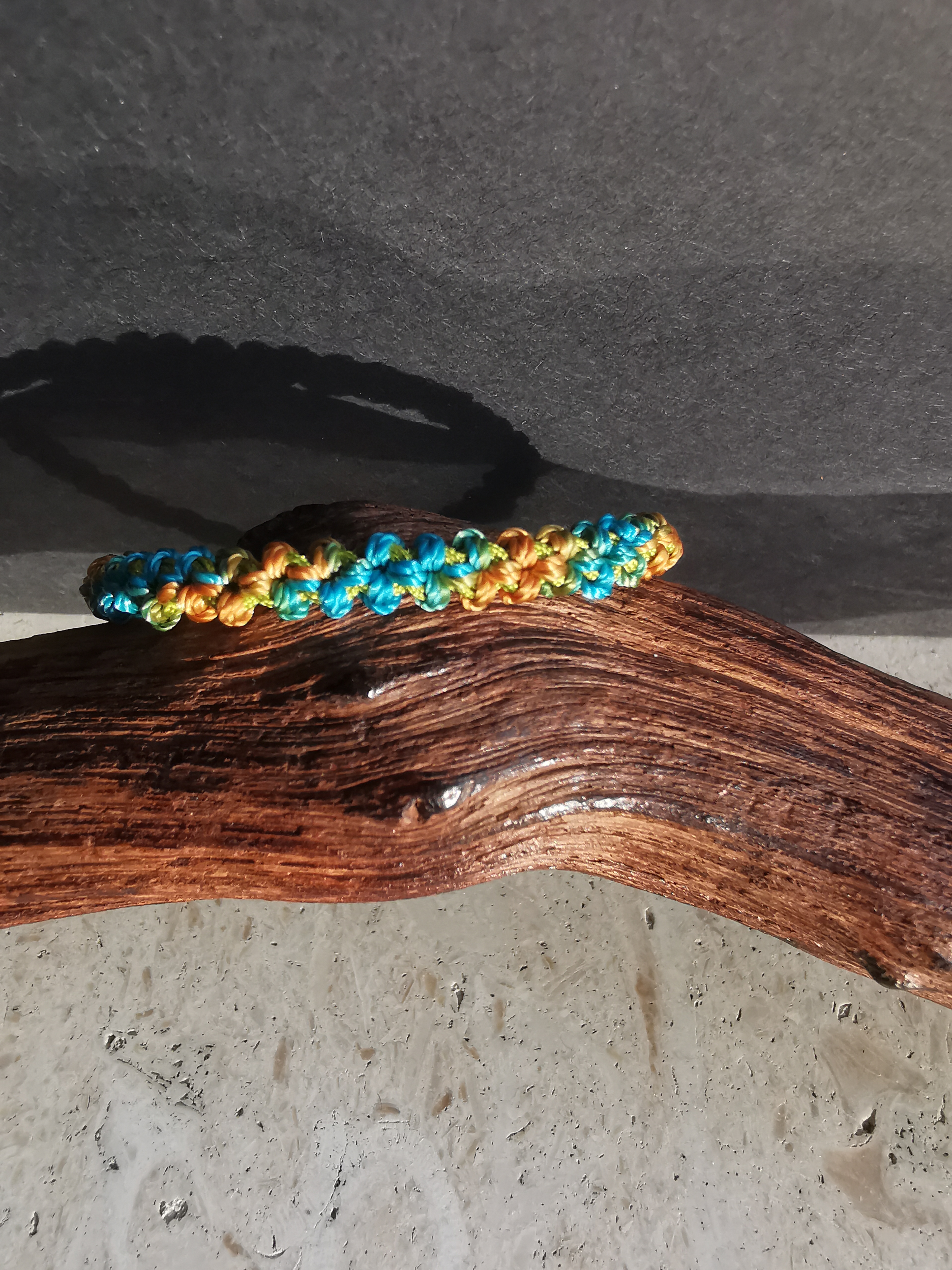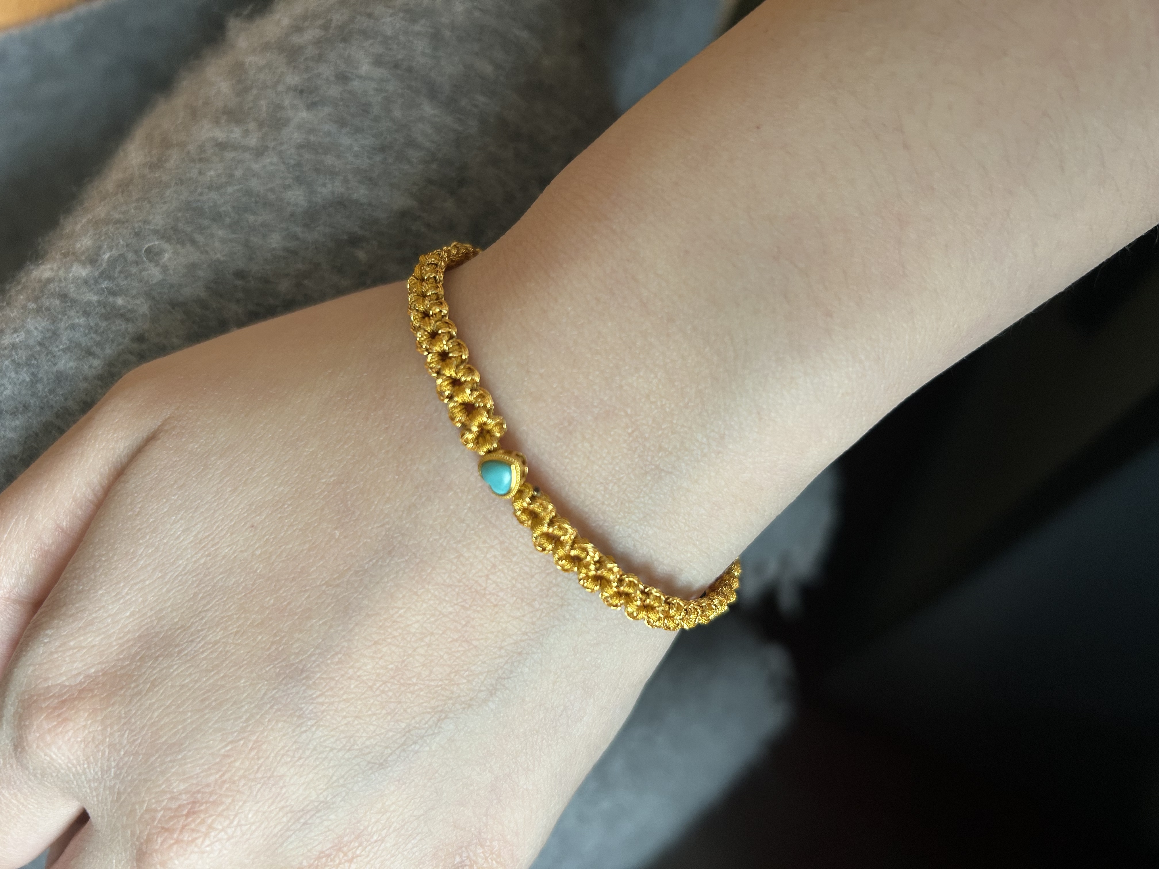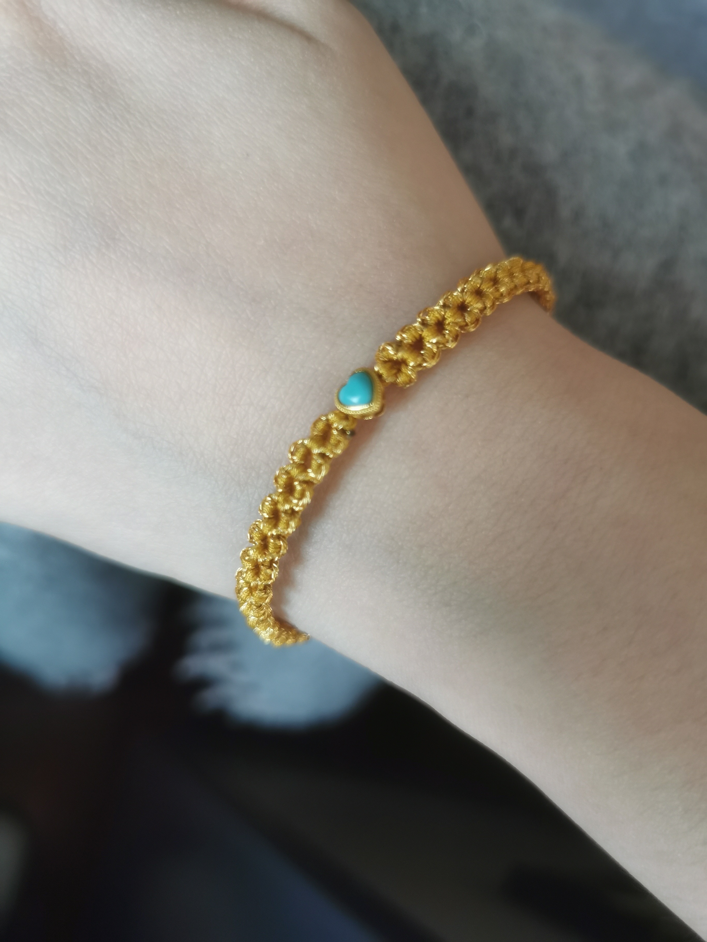 精选925银镶嵌绿松小爱心及绿松小珠各一颗。纯手工精心编织中国结金黄桃花。最大手围18cm。