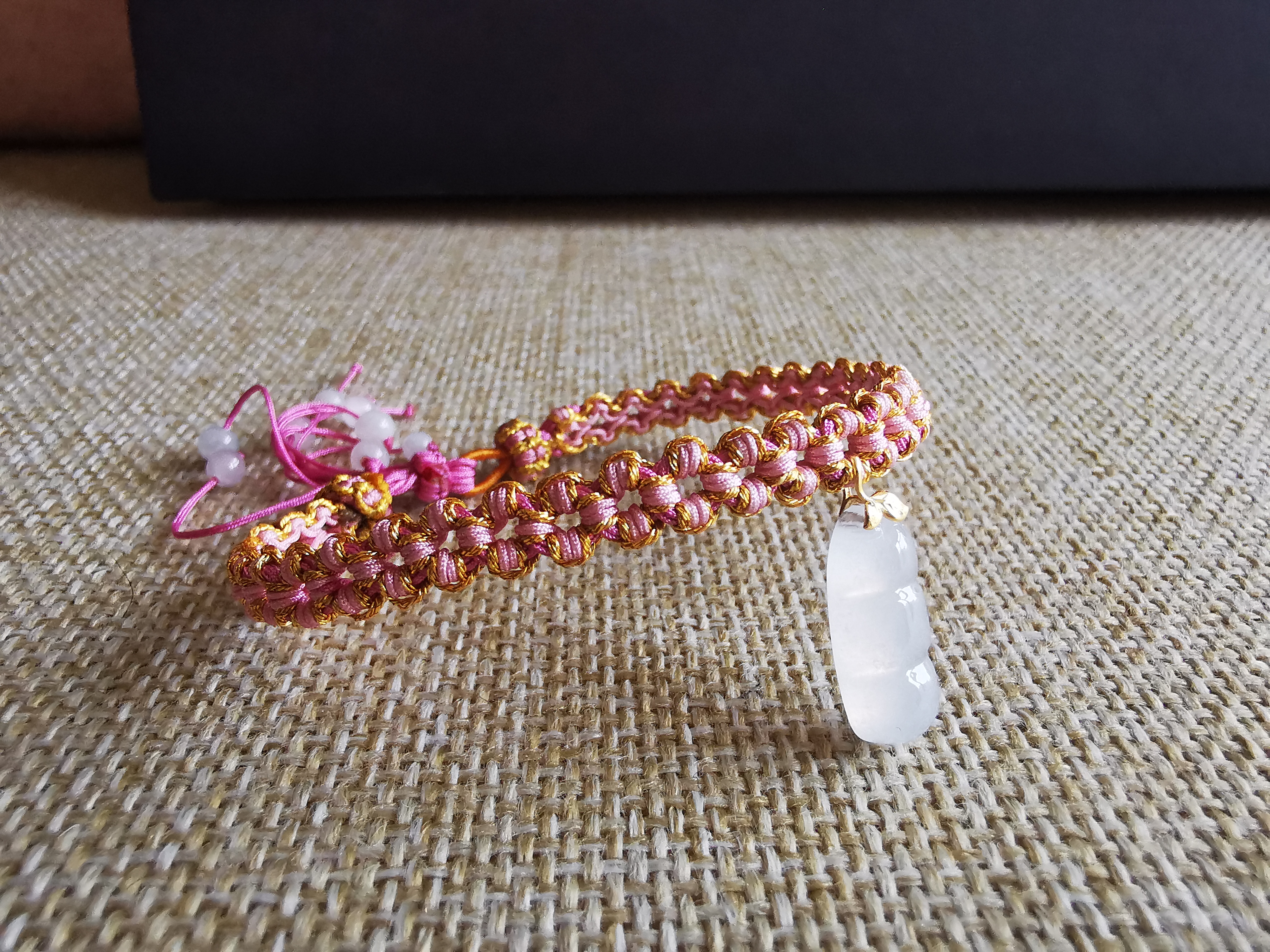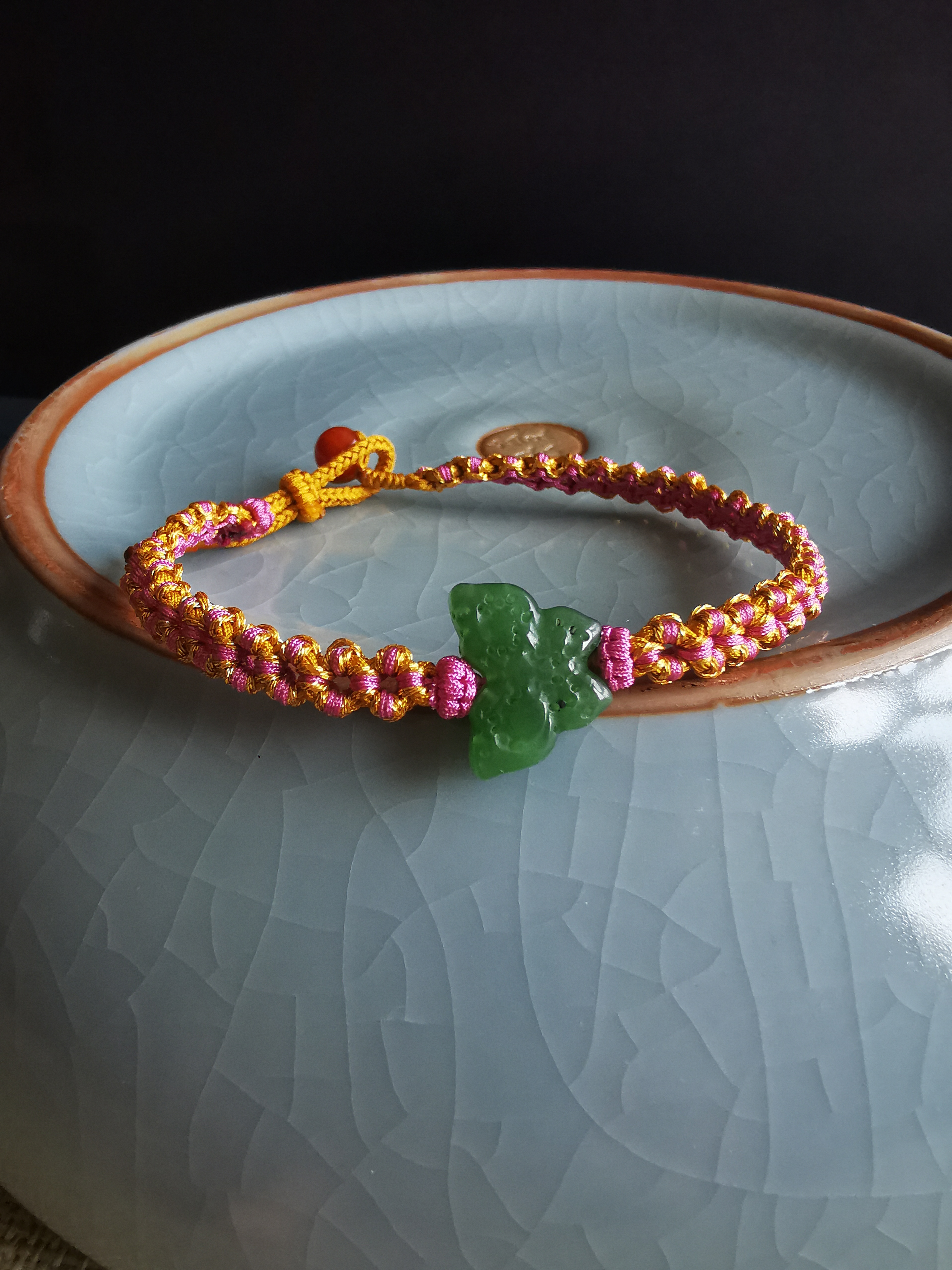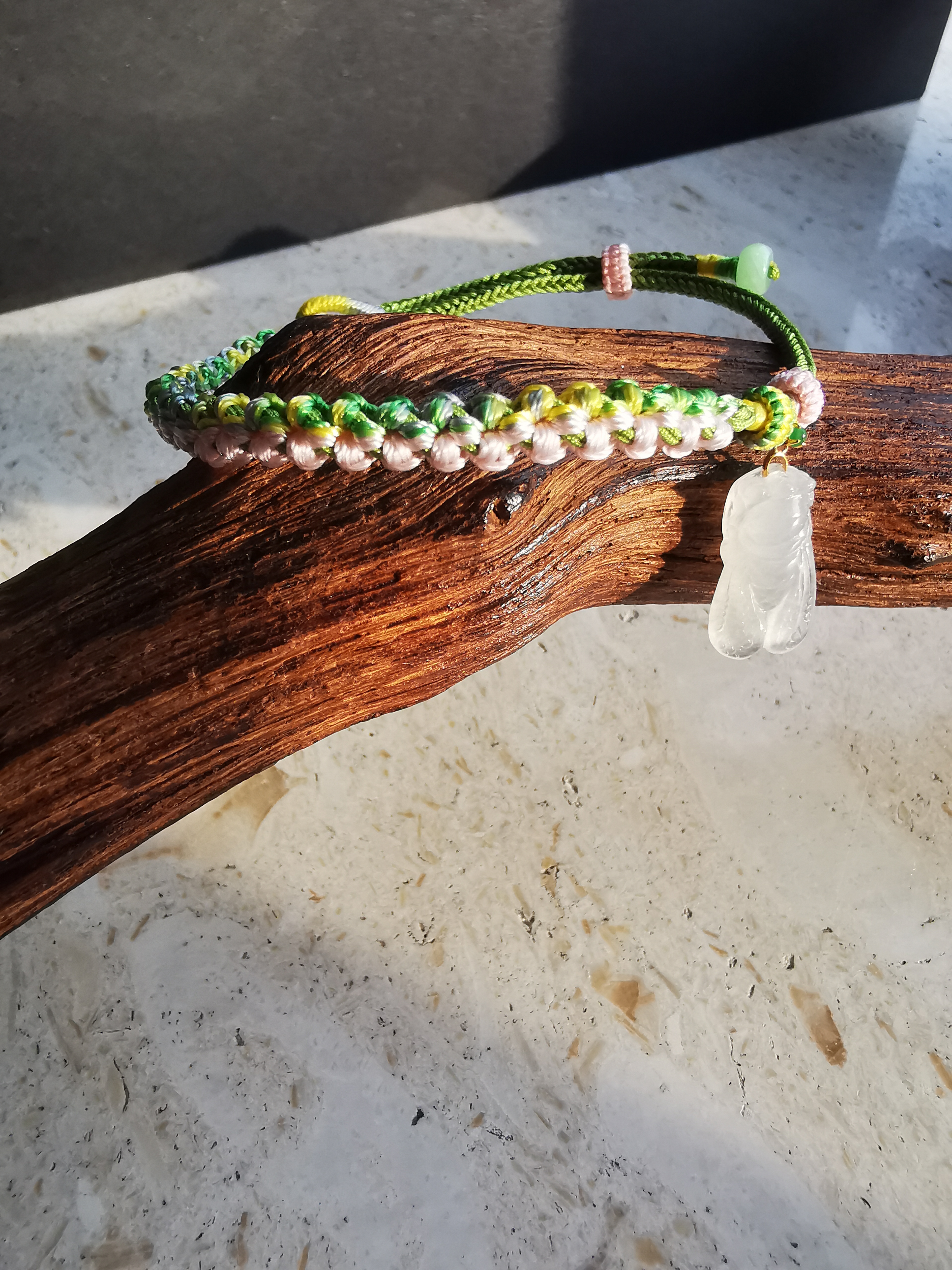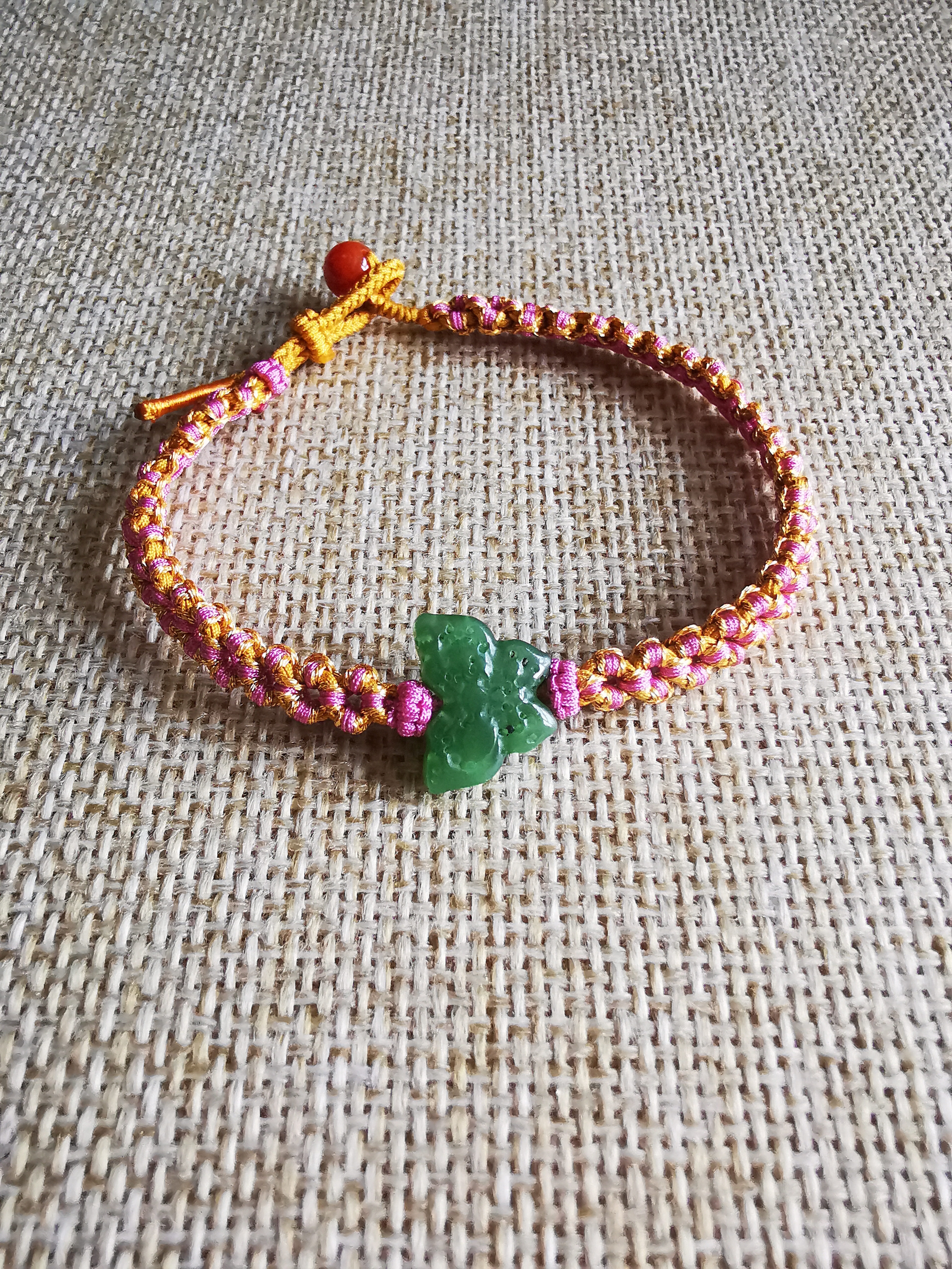 精选碧玉蝴蝶及南红小桶珠各一颗。纯手工精心编织中国结深粉桃花。
