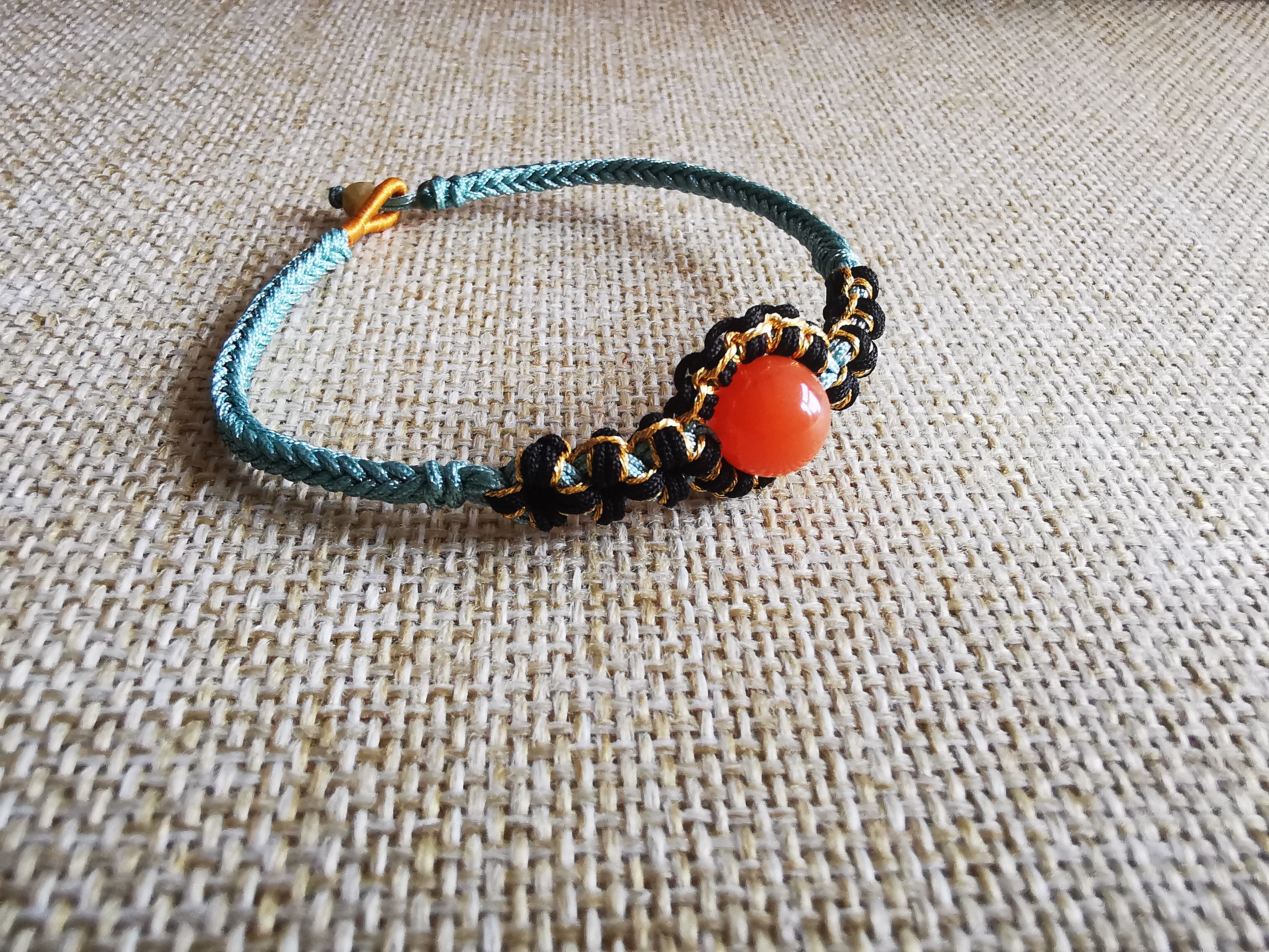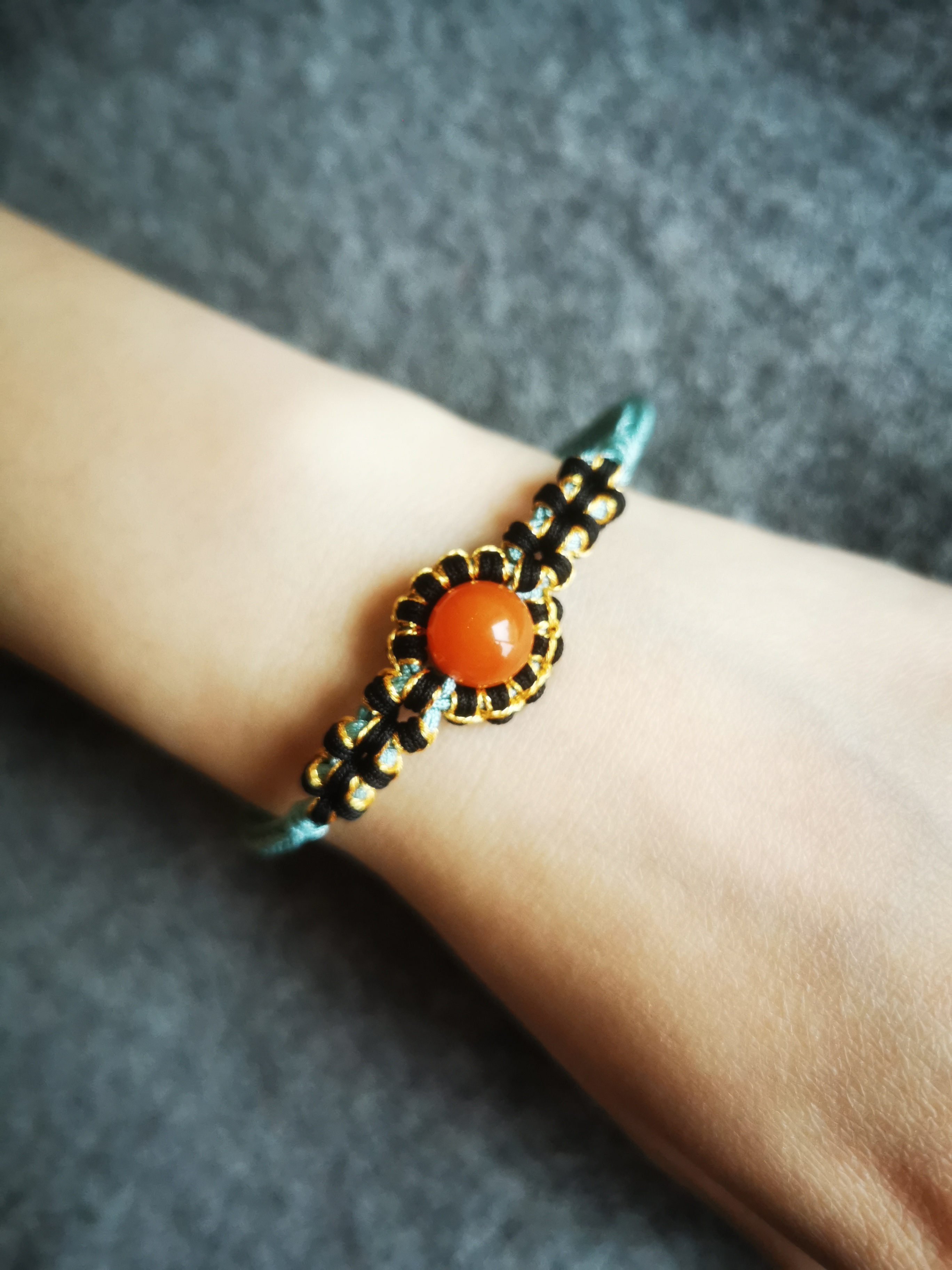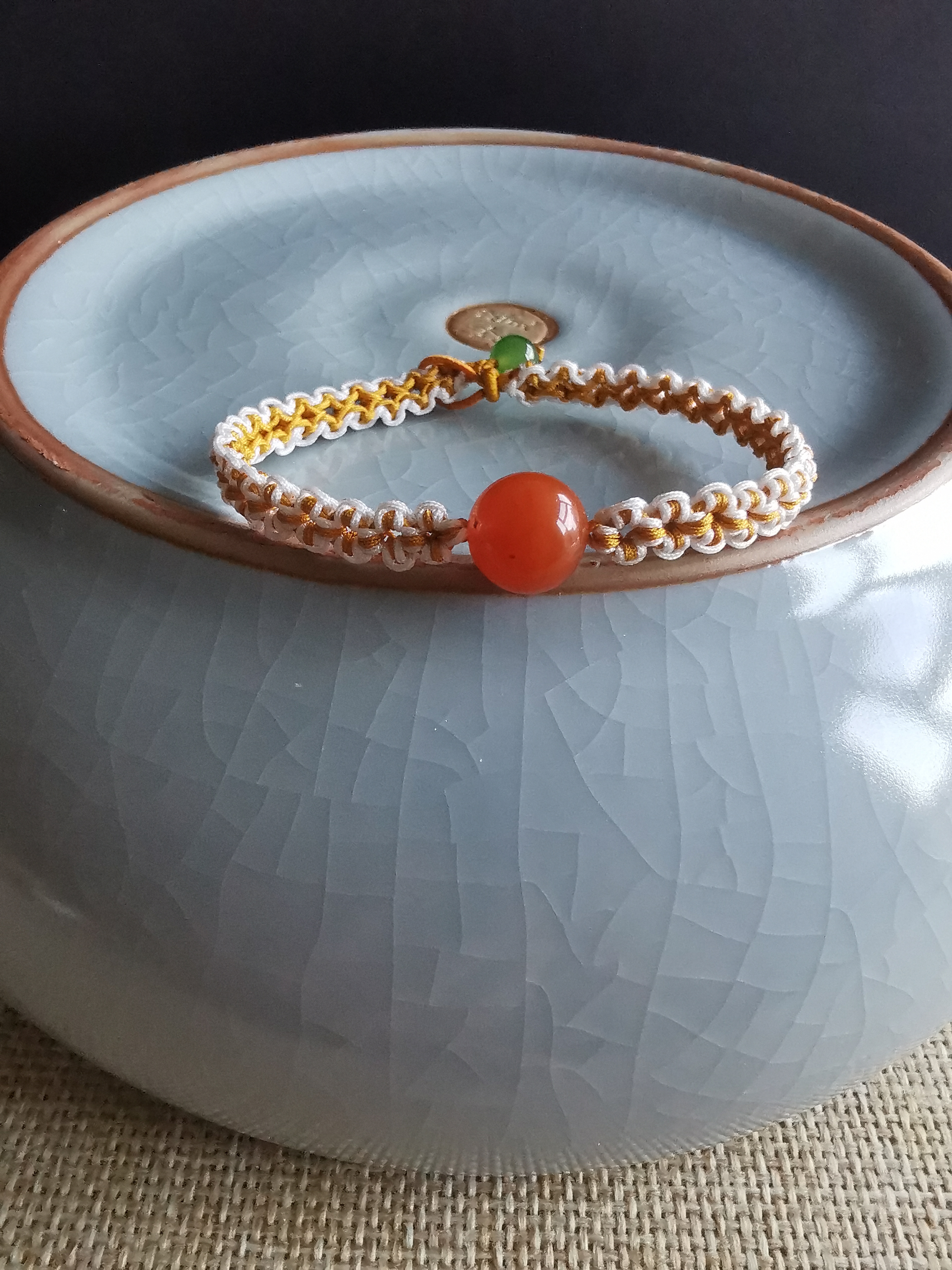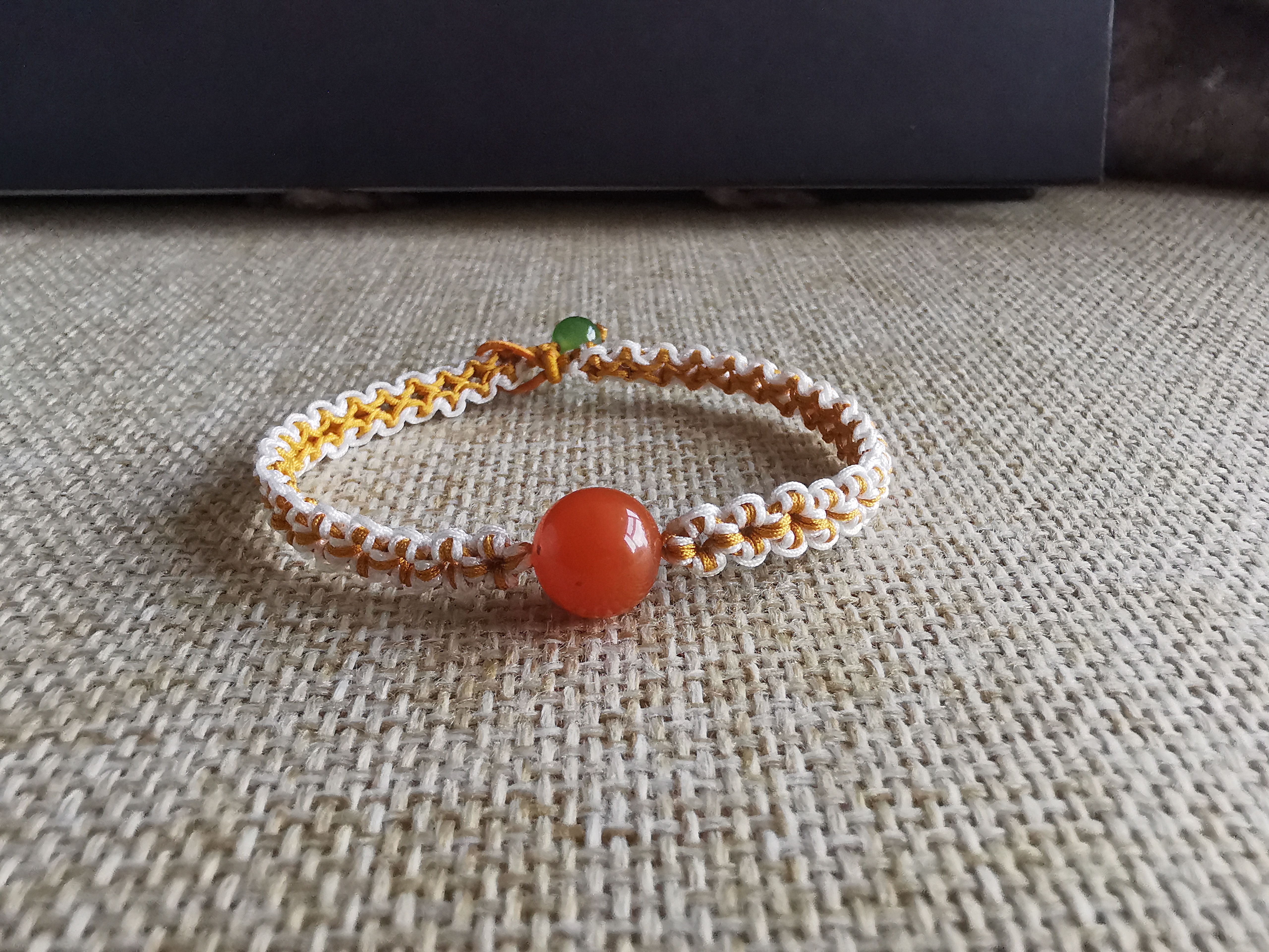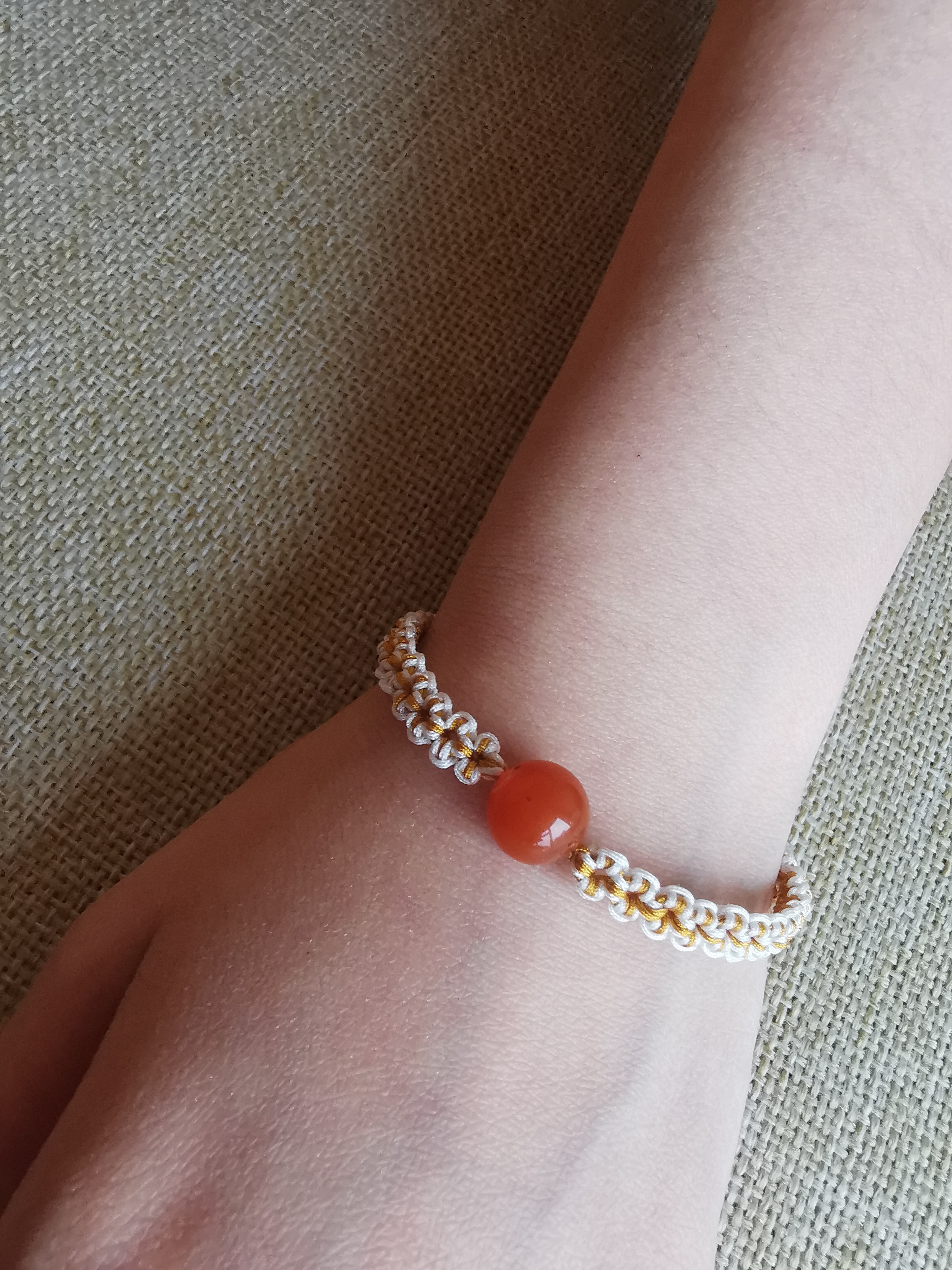 精选南红约10.5mm圆珠一颗,约6∽8mm碧玉一颗。纯手工精心编织中国结黄白桃花。最大手围17cm。