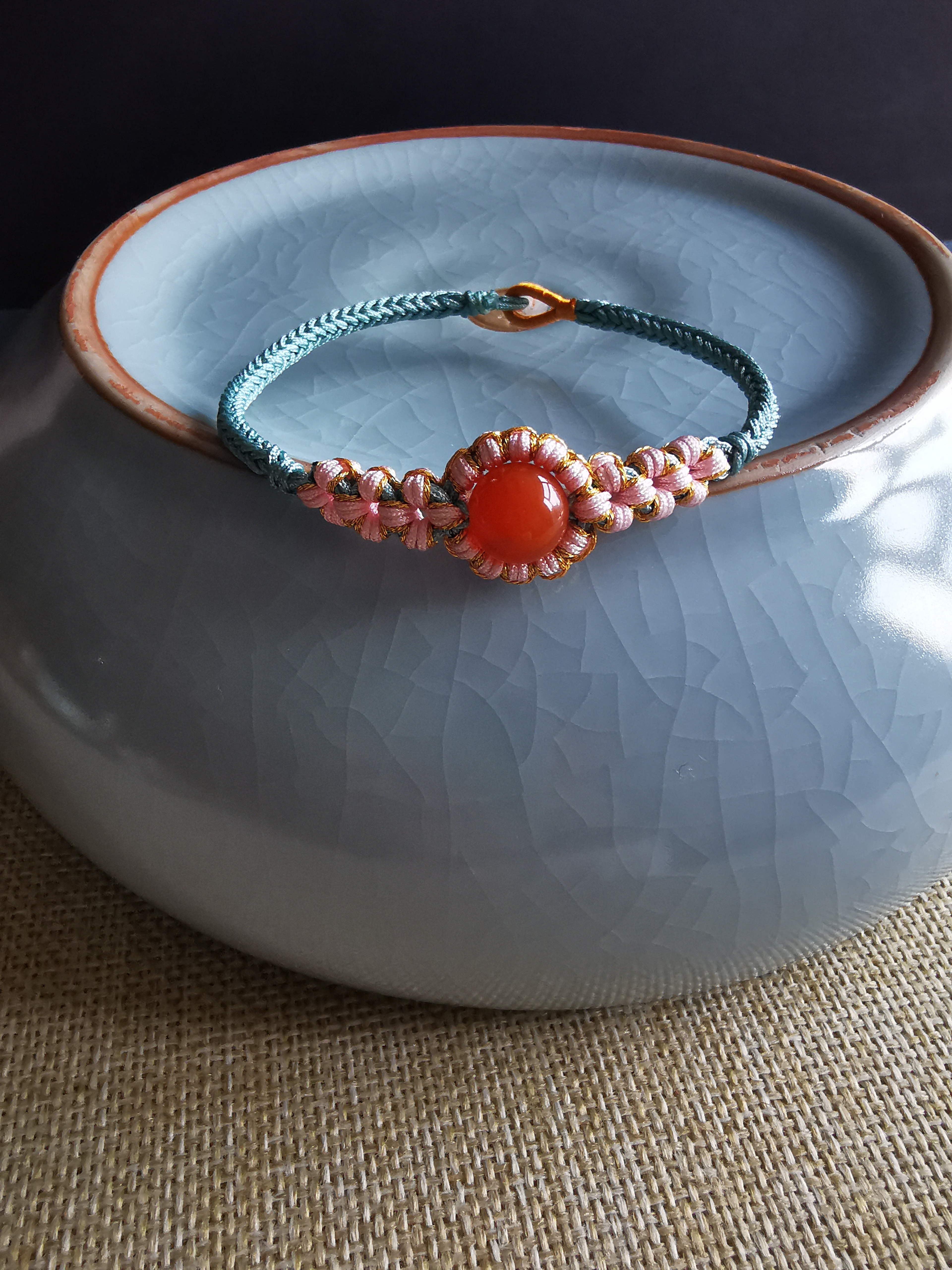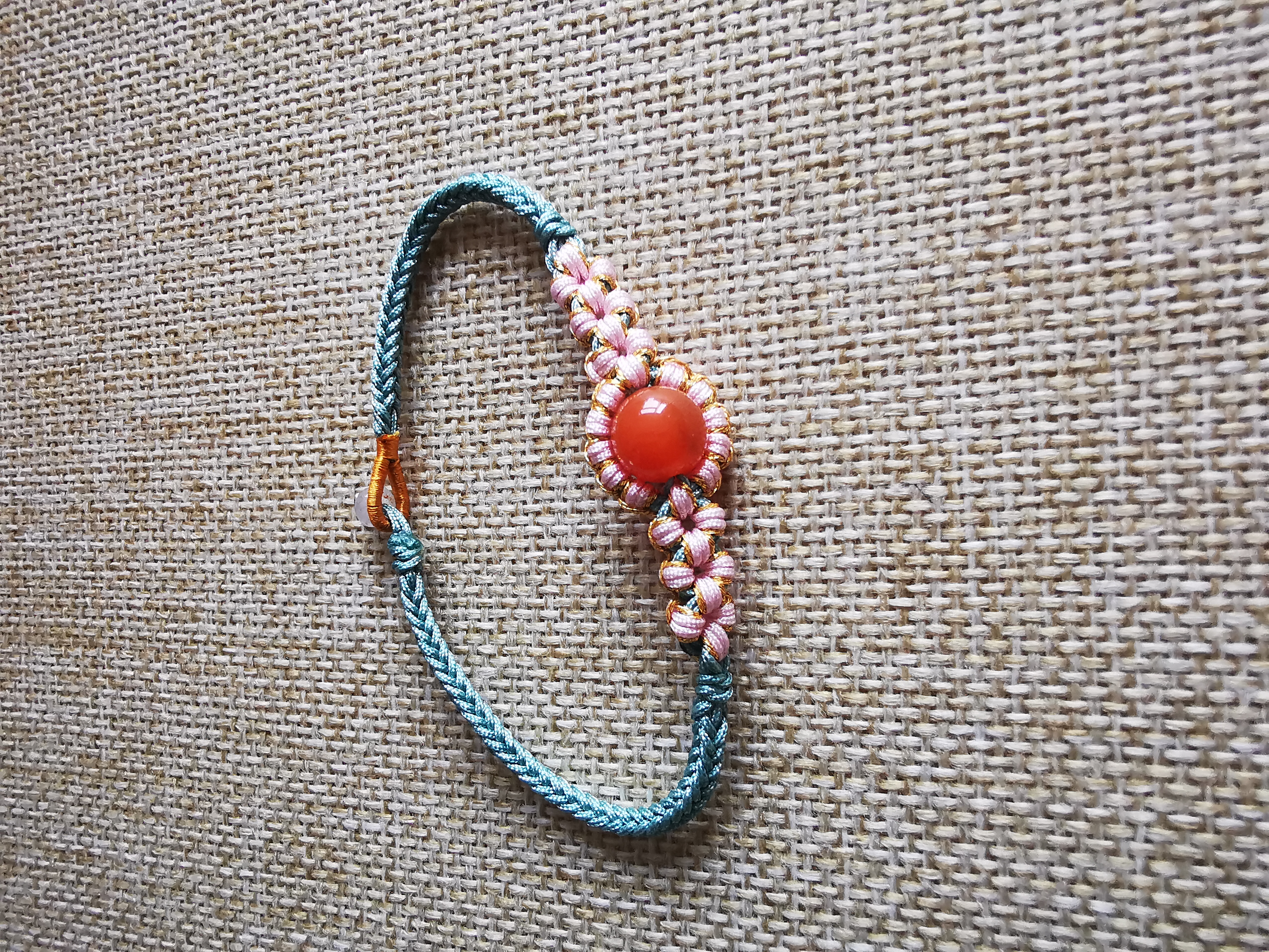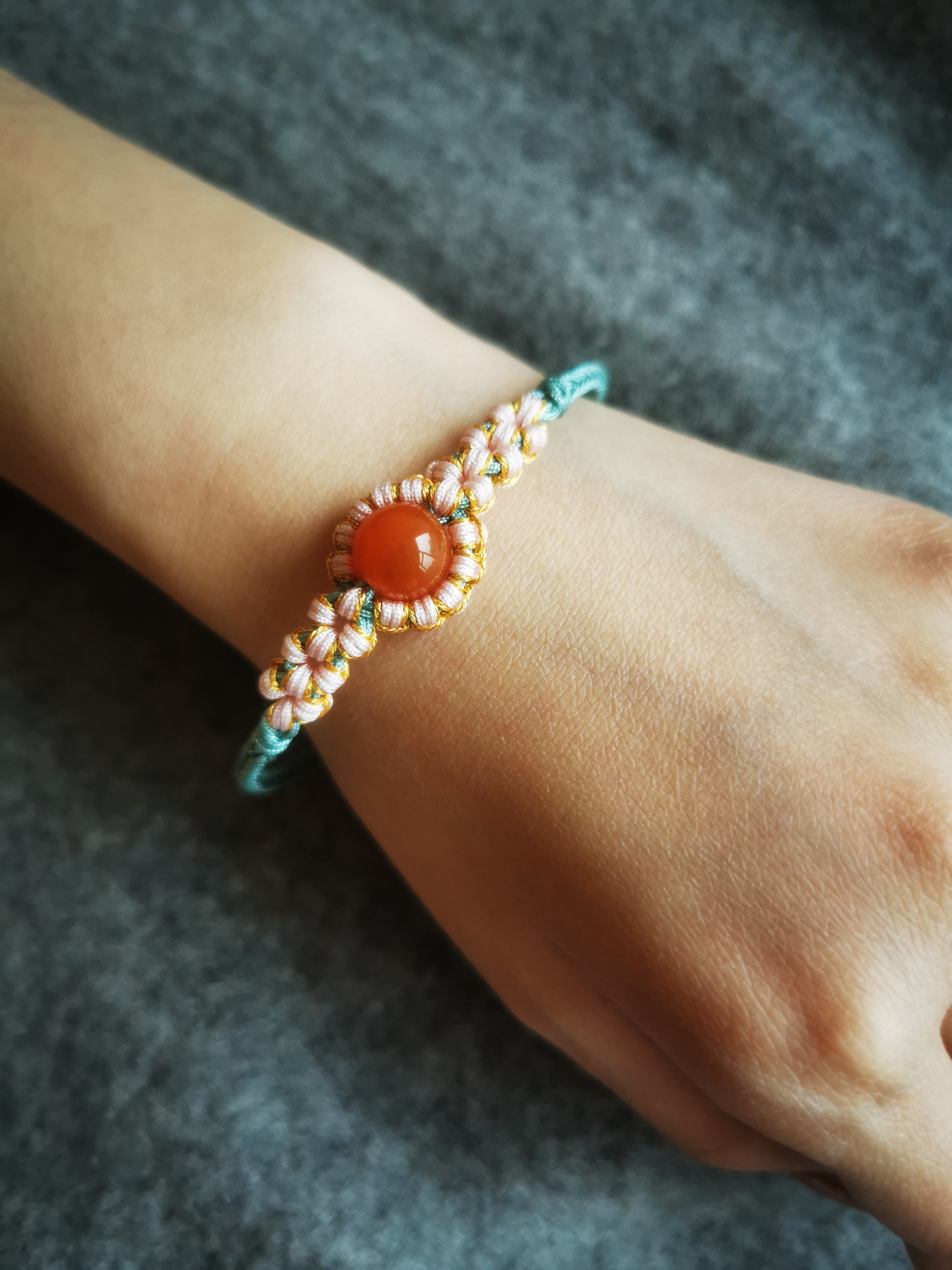 精选南红圆珠一颗,规格约10.5mm。纯手工精心编织中国结粉桃花及黑桃花两款。最大手围18㎝。