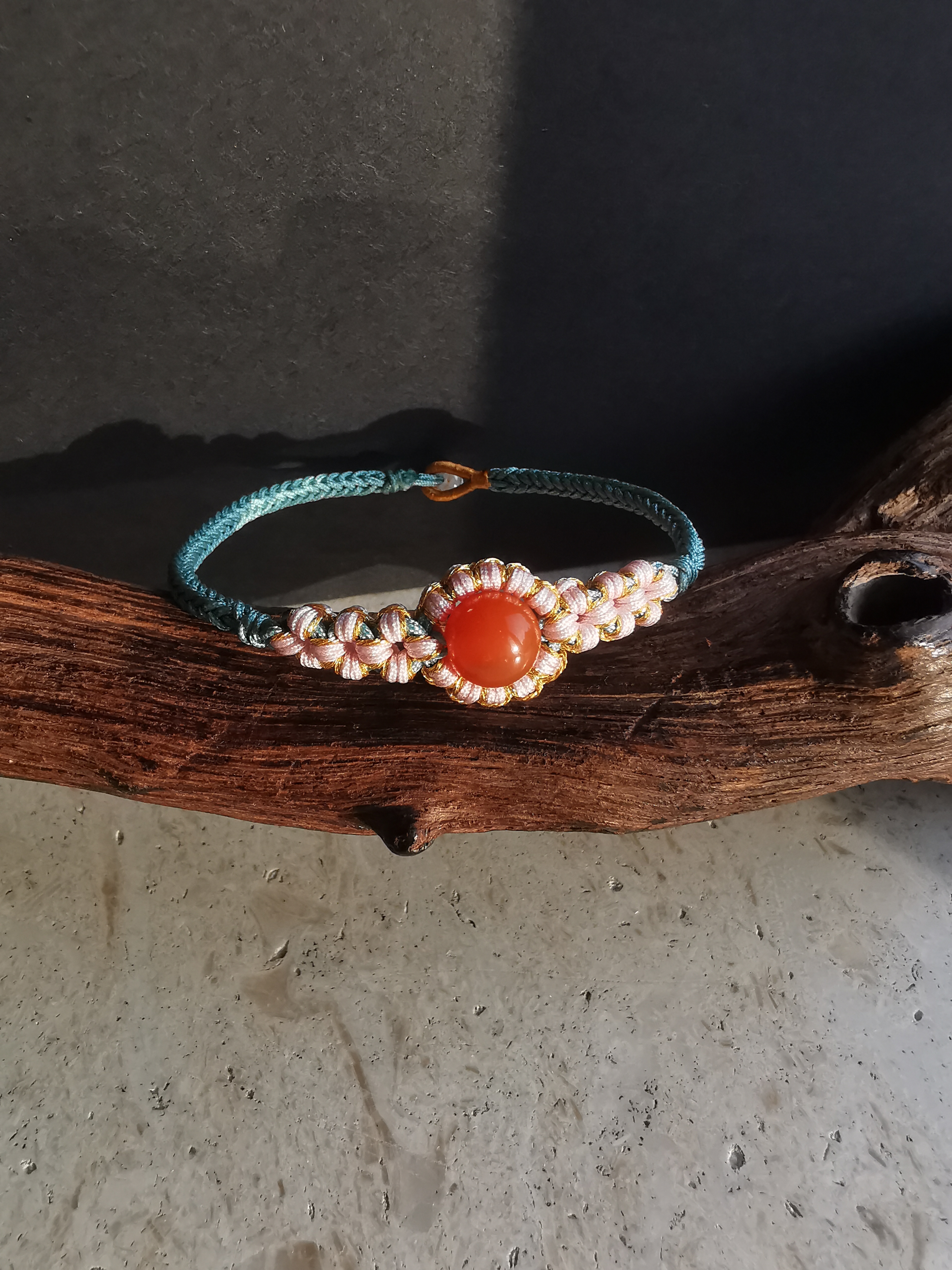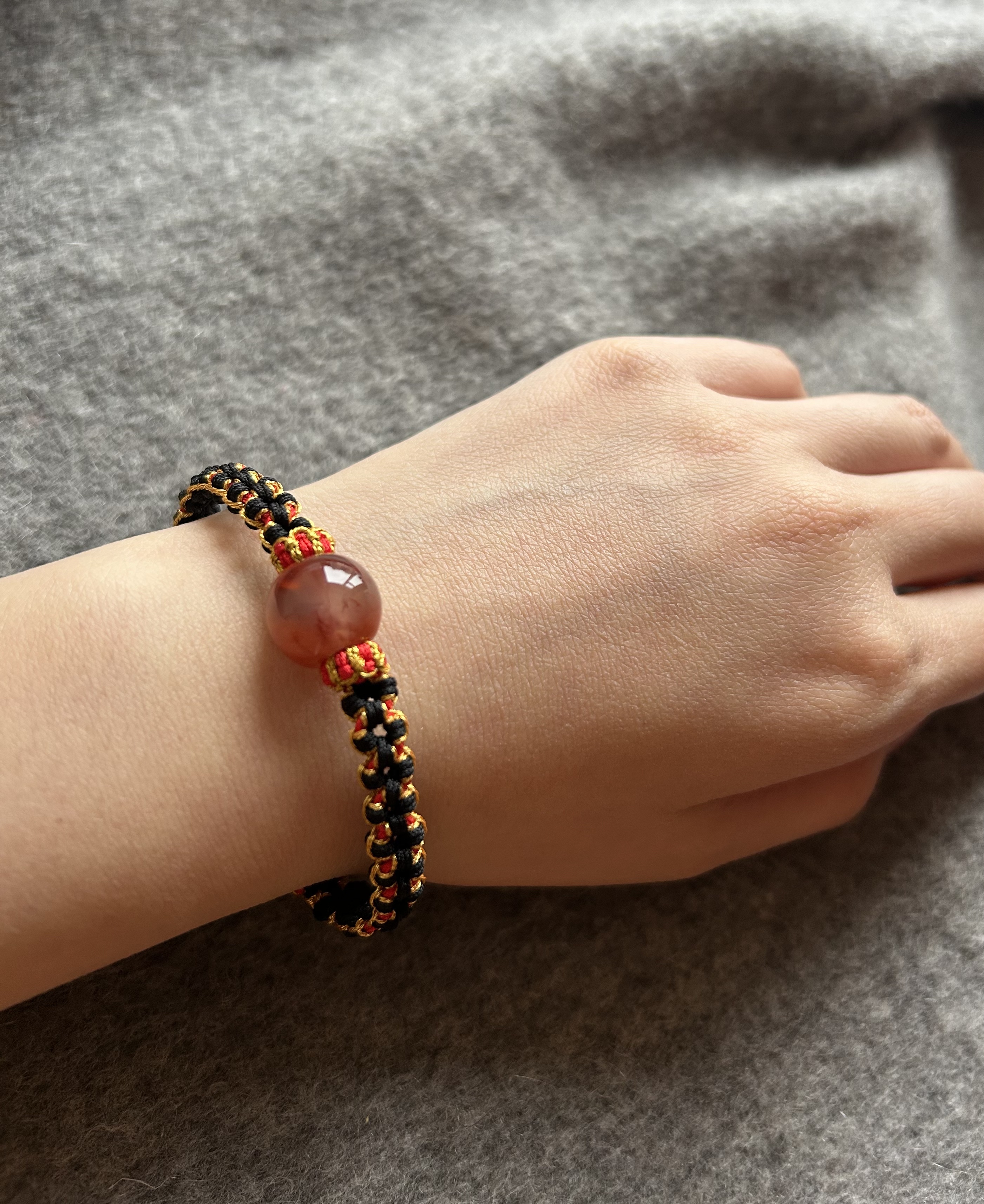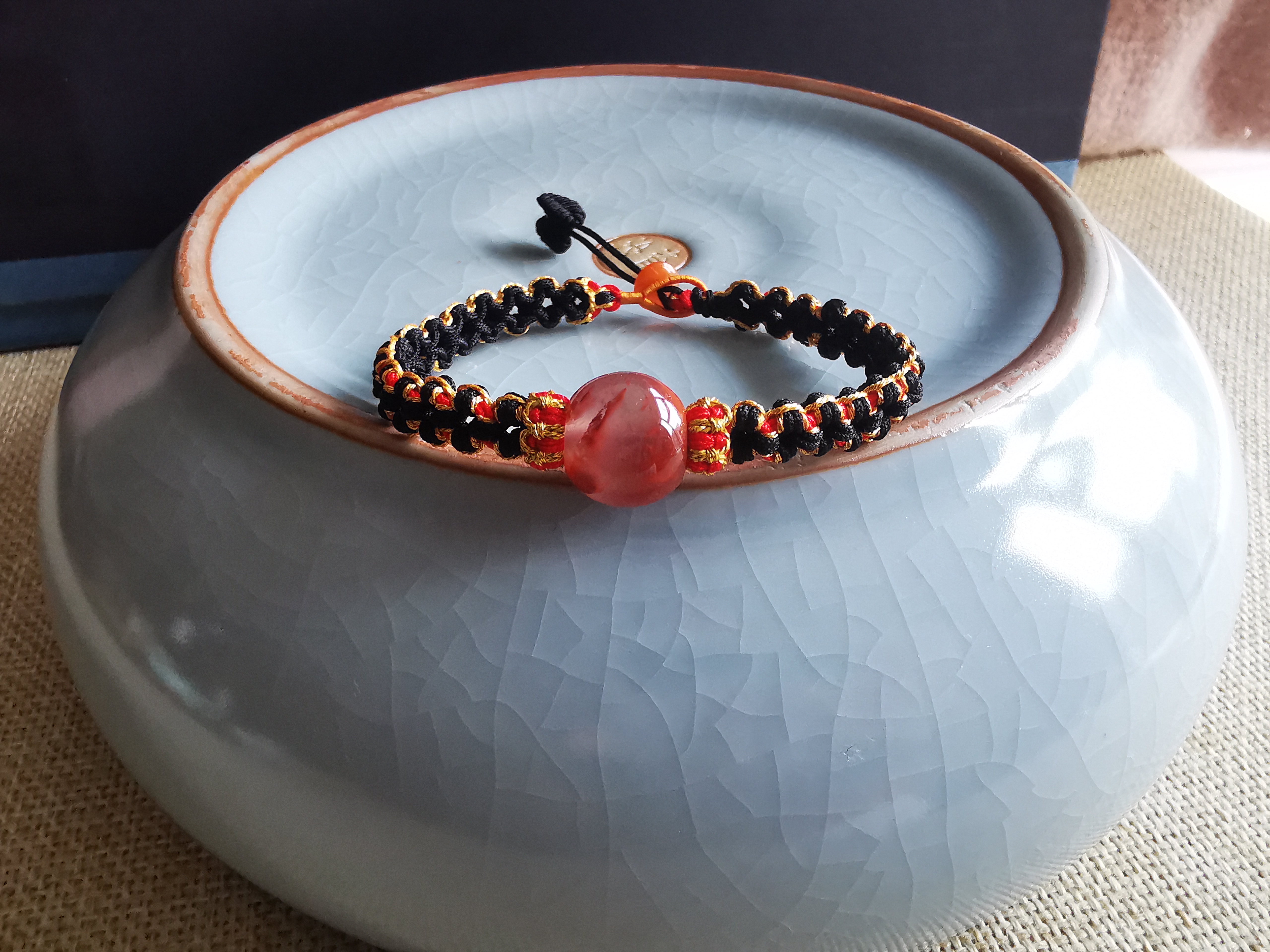 精选南红圆珠一颗,规格约10.5mm。纯手工精心编织中国结粉桃花及黑桃花两款。最大手围18㎝。
