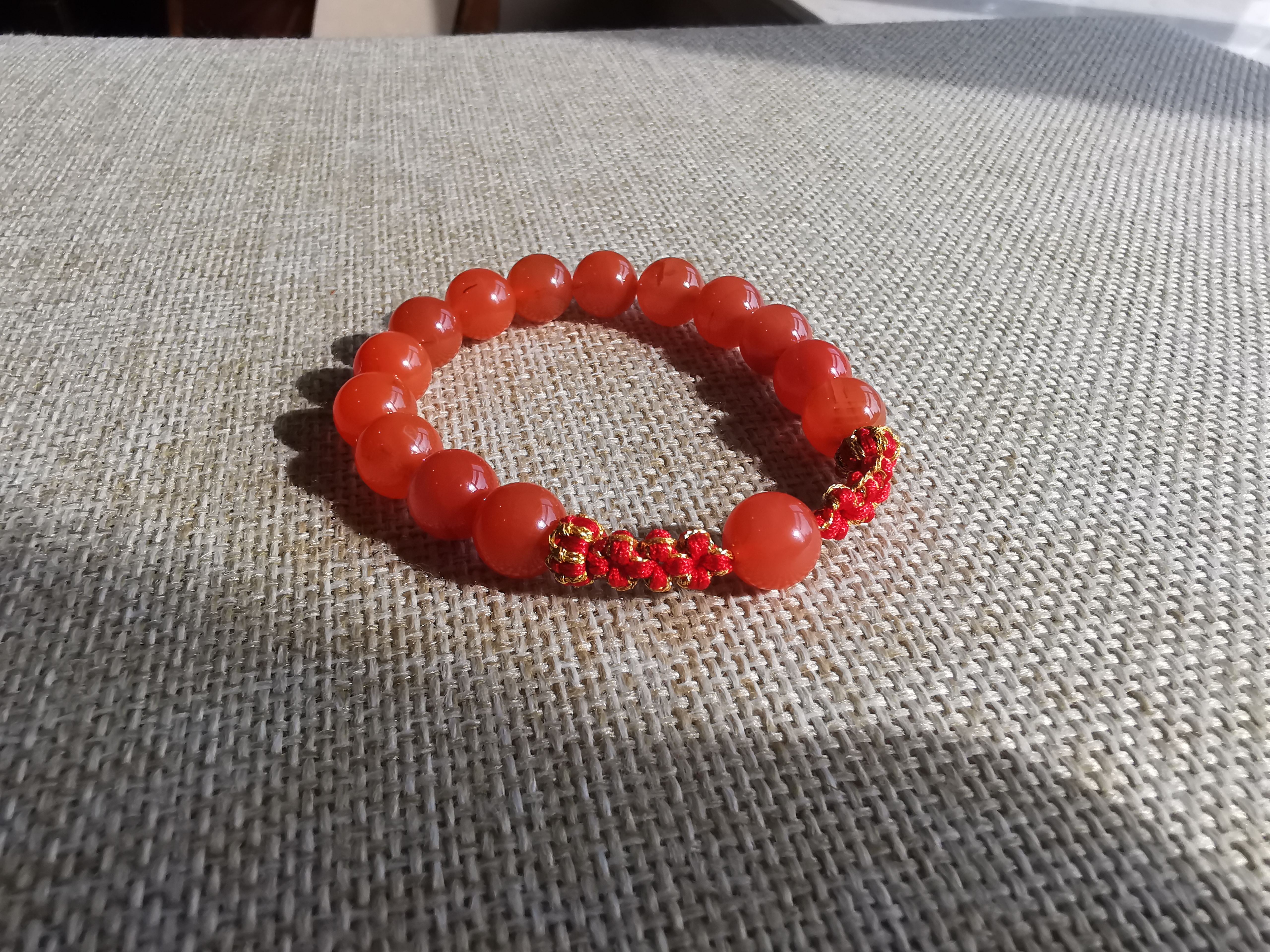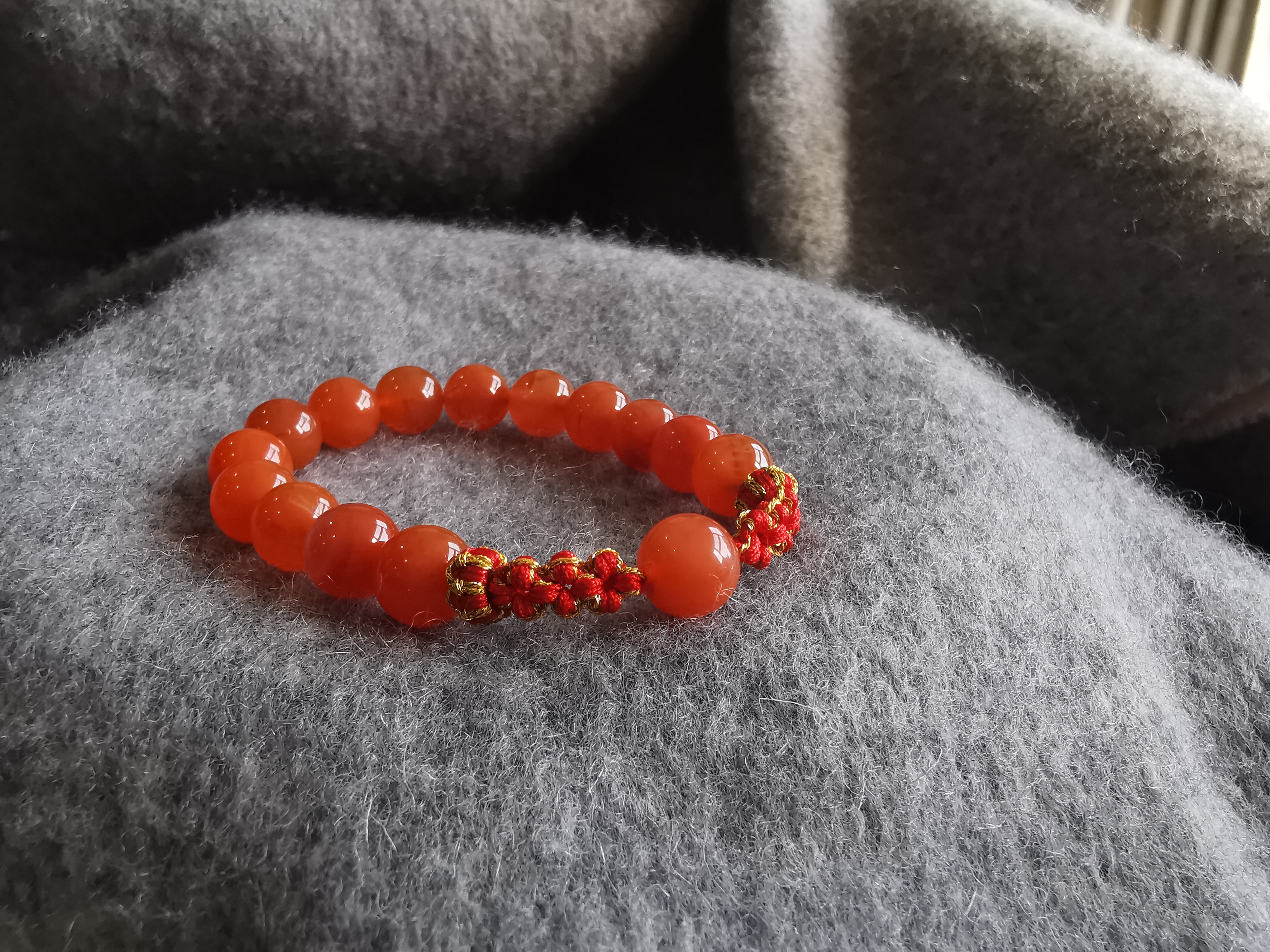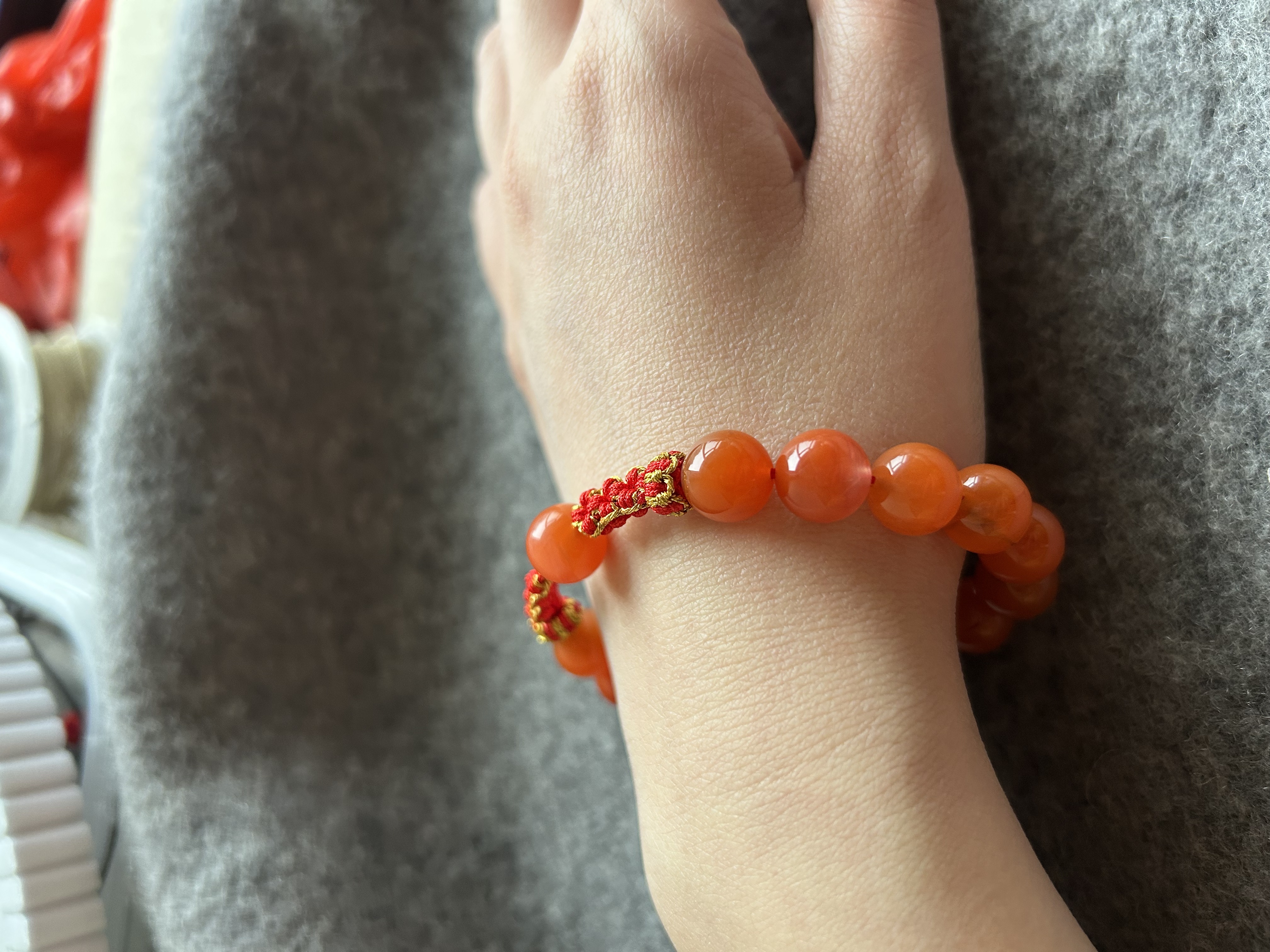 精选南红圆珠15颗,规格约10.5mm,纯手工编织中国结大红桃花。适合手围17㎝内。