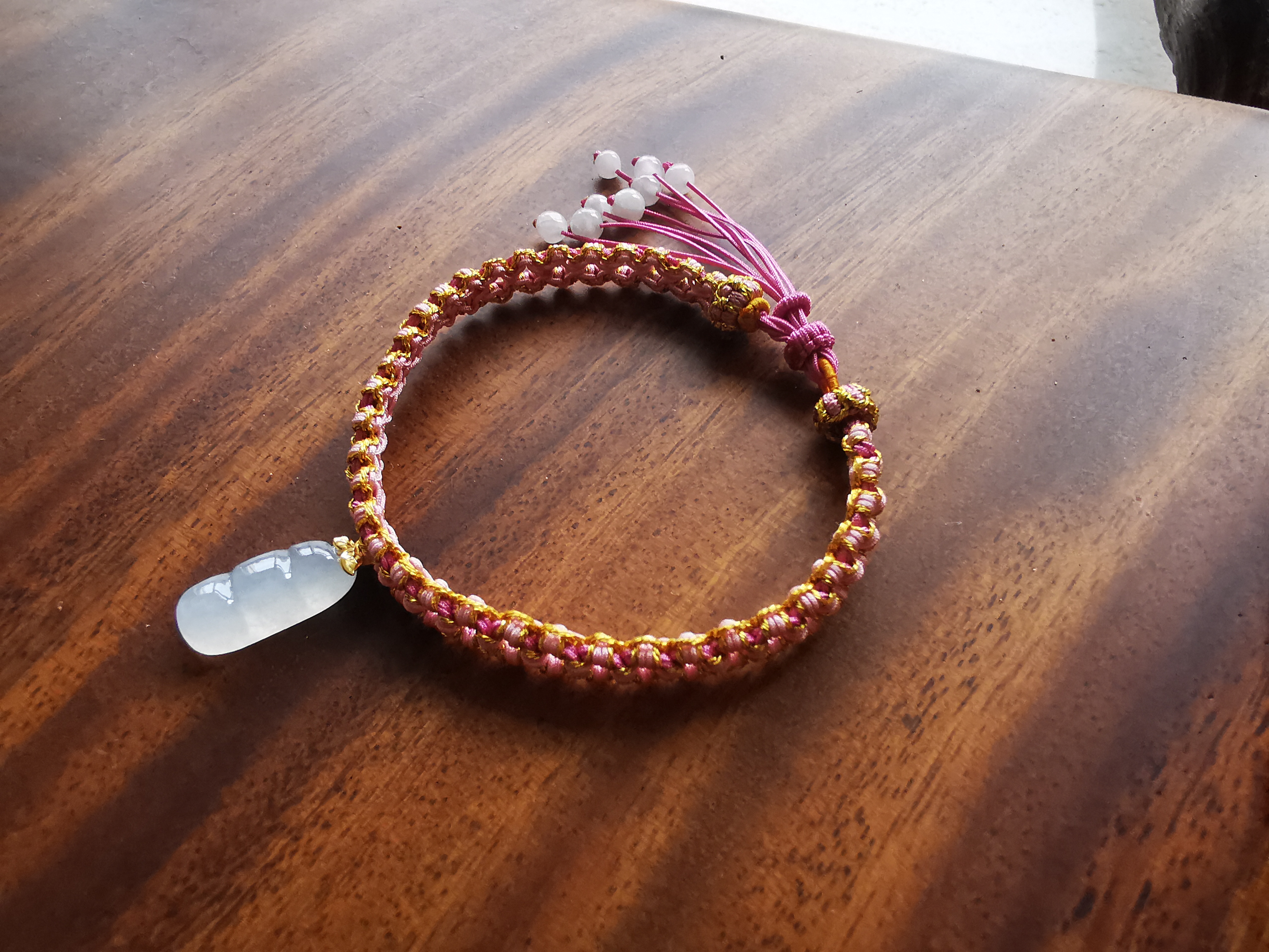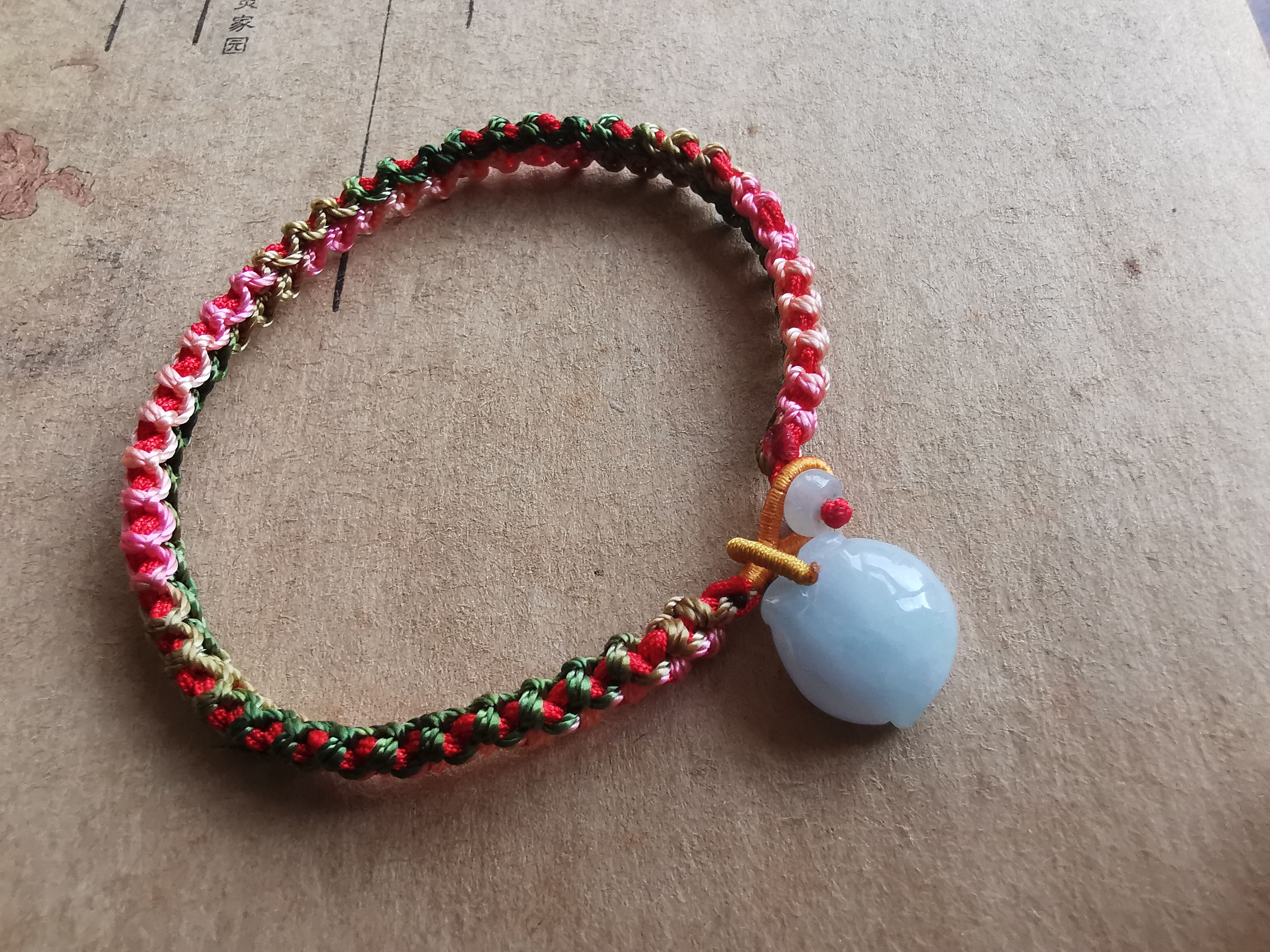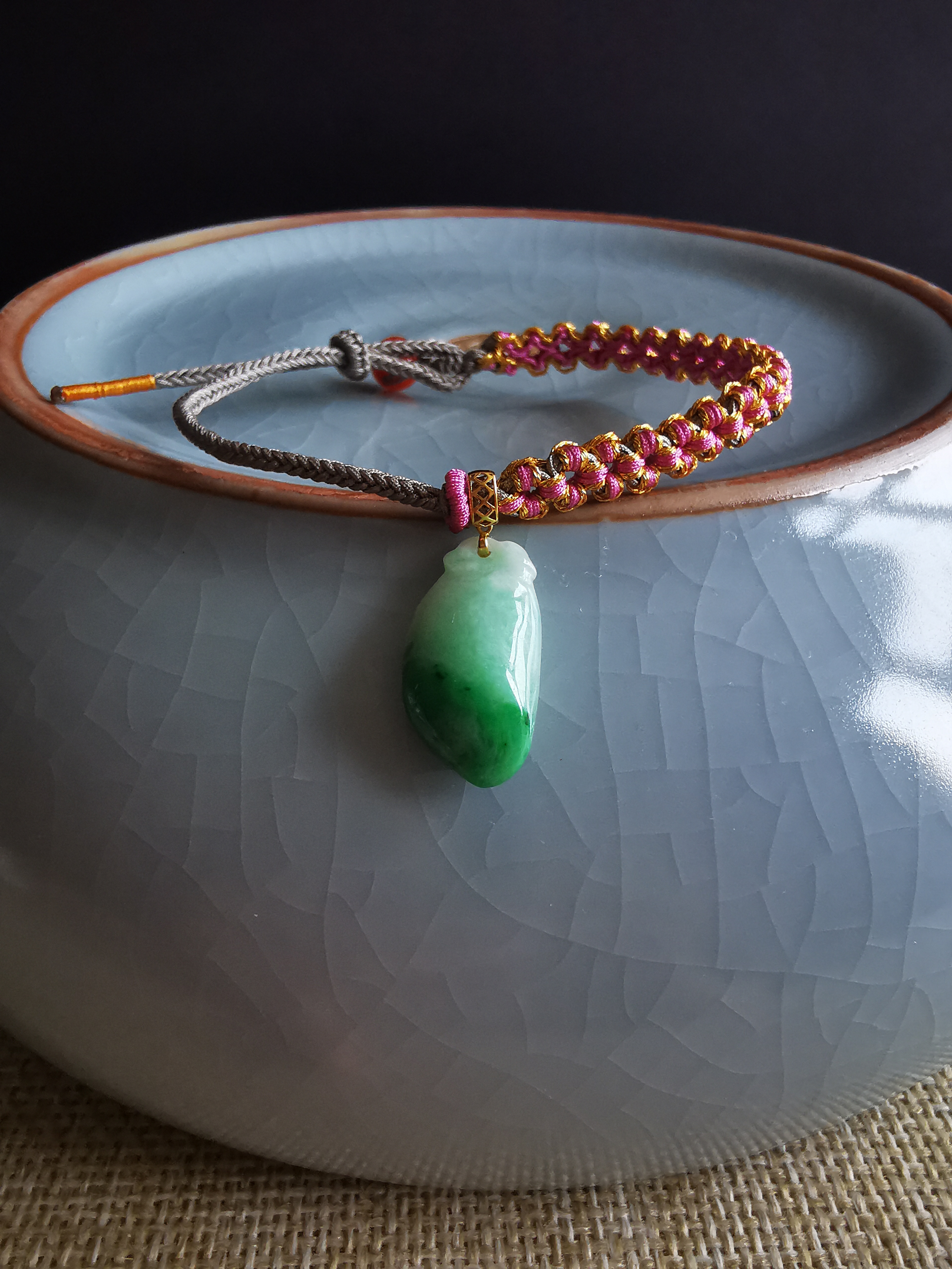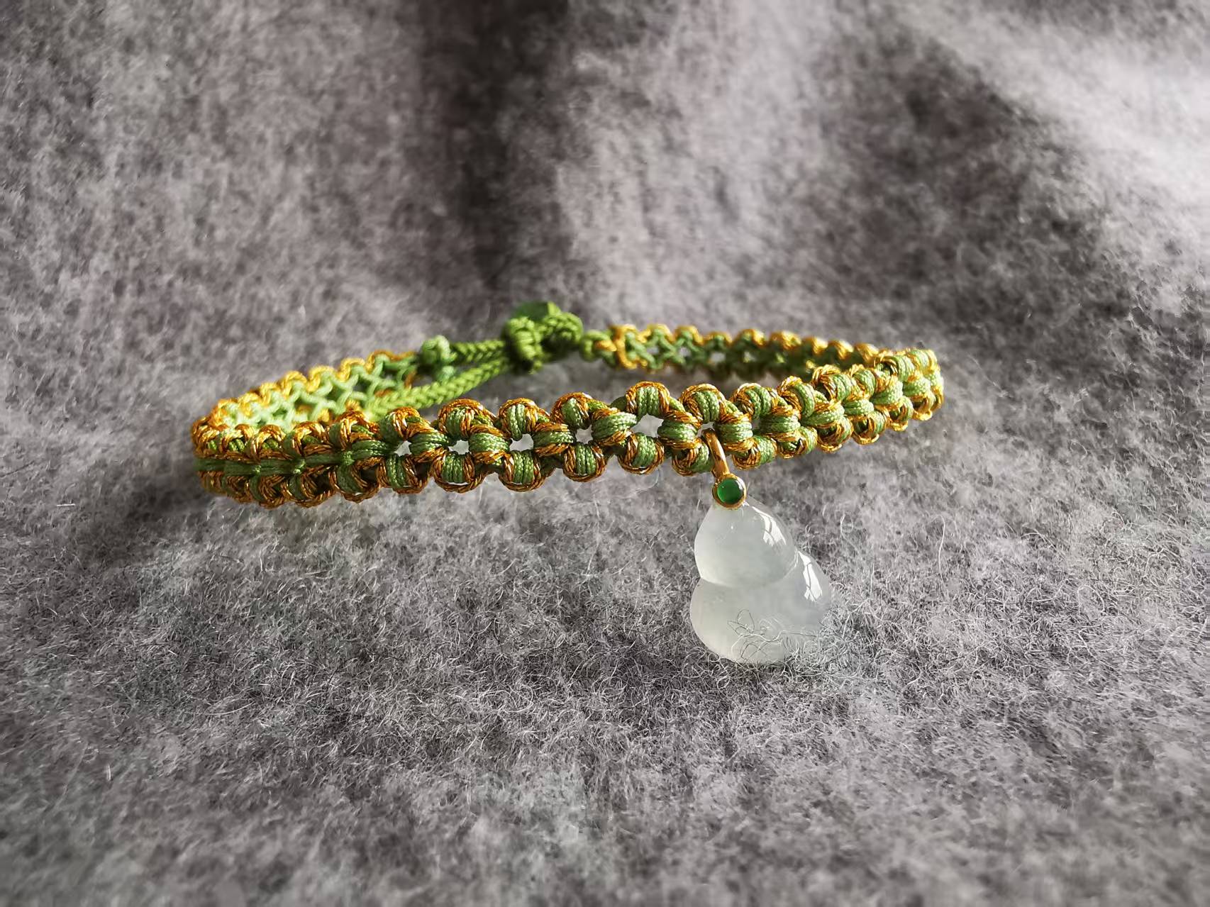 精选。冰种带翠小葫芦,18k金扣头,纯手工精心编织粉桃花及灰八股绳。