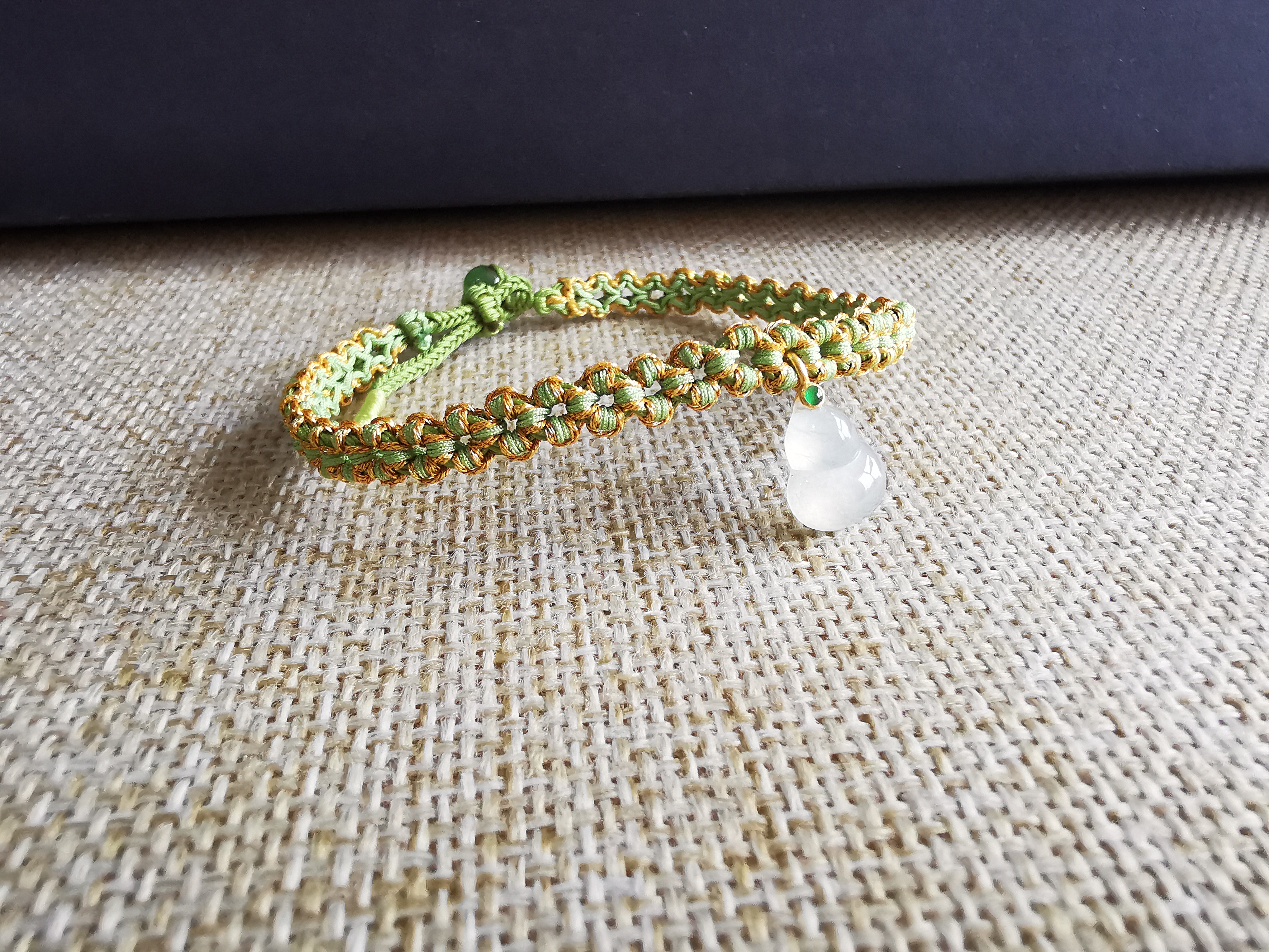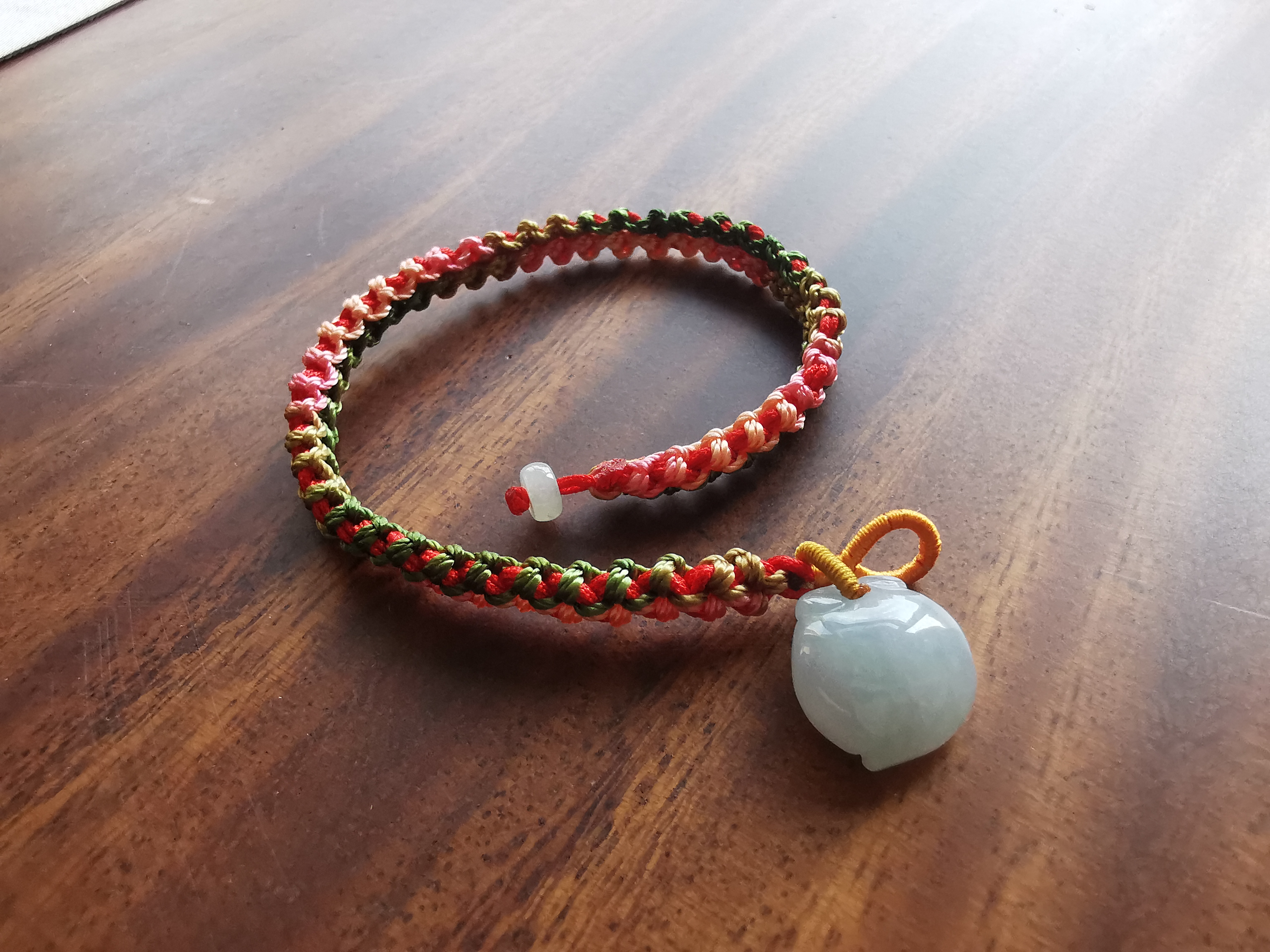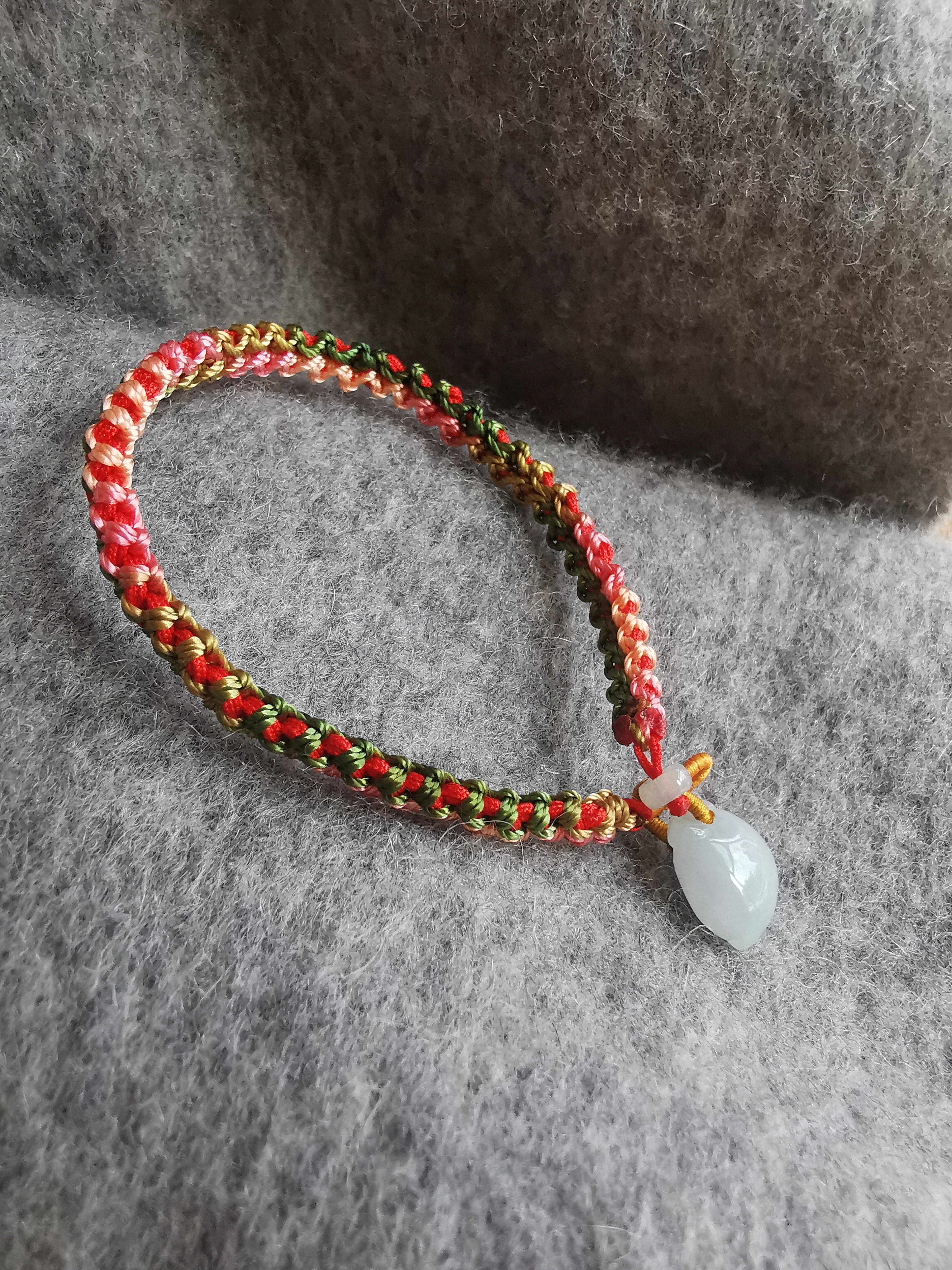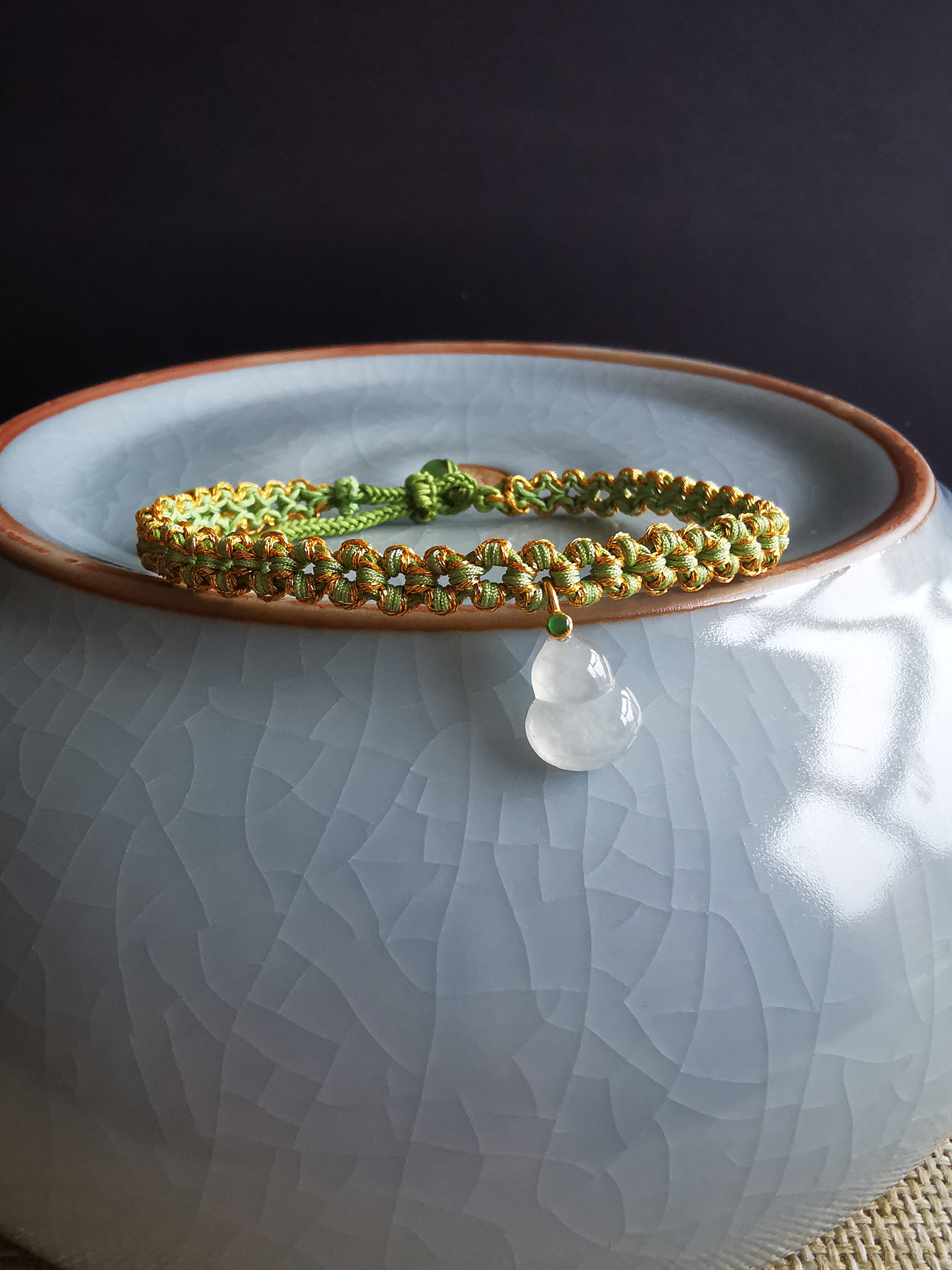 精选。冰种带翠小葫芦,18k金扣头,纯手工精心编织粉桃花及灰八股绳。