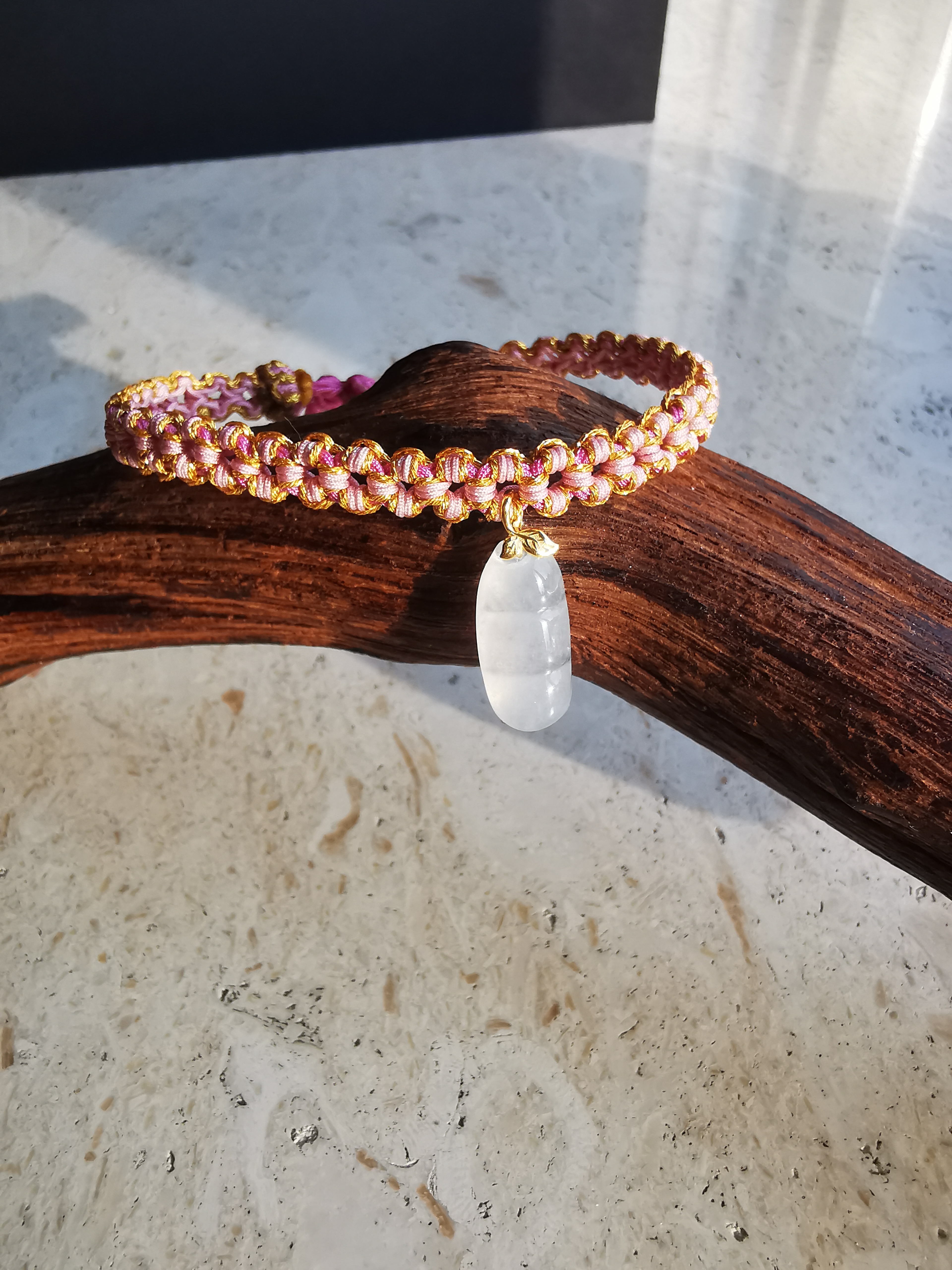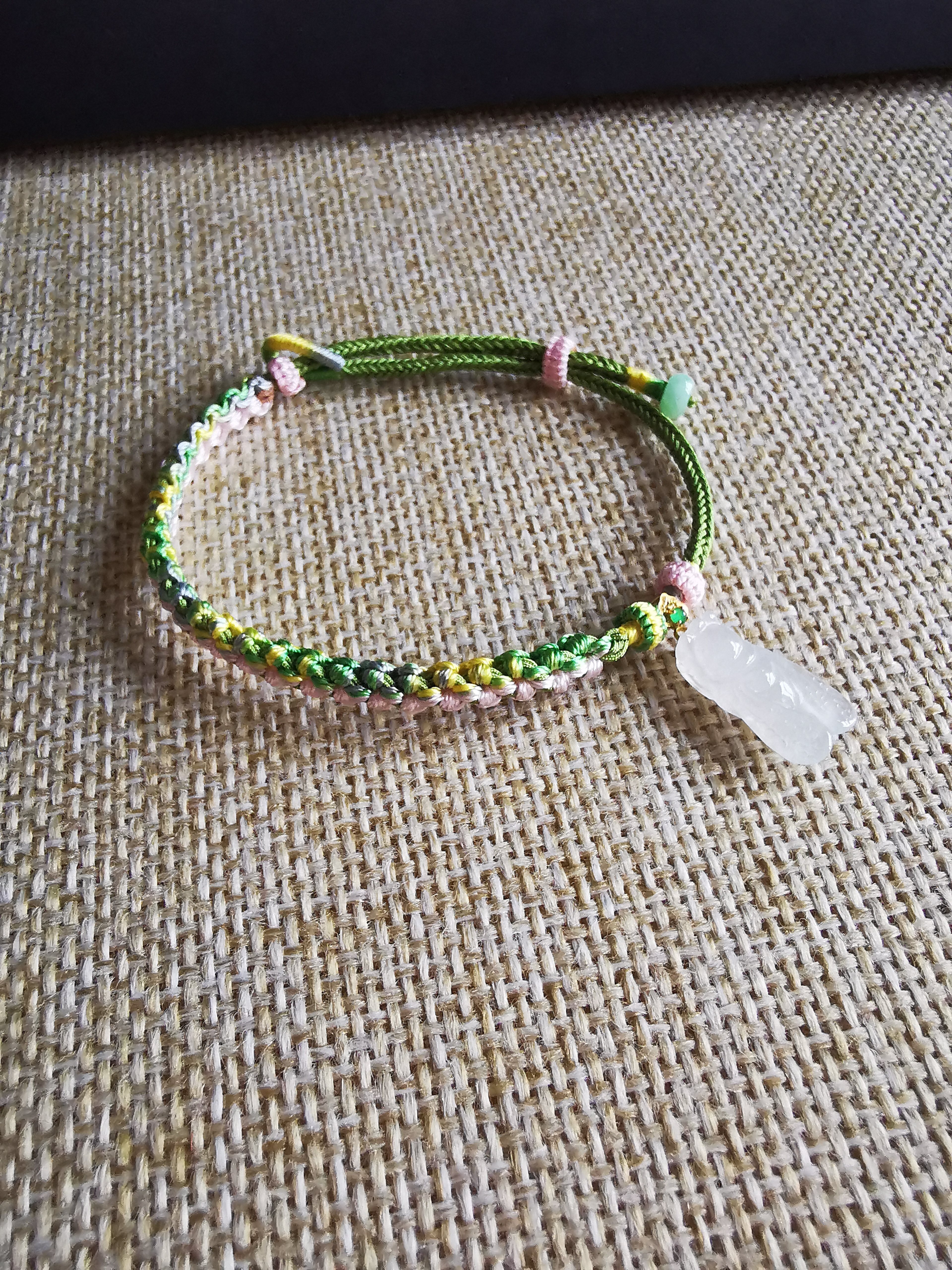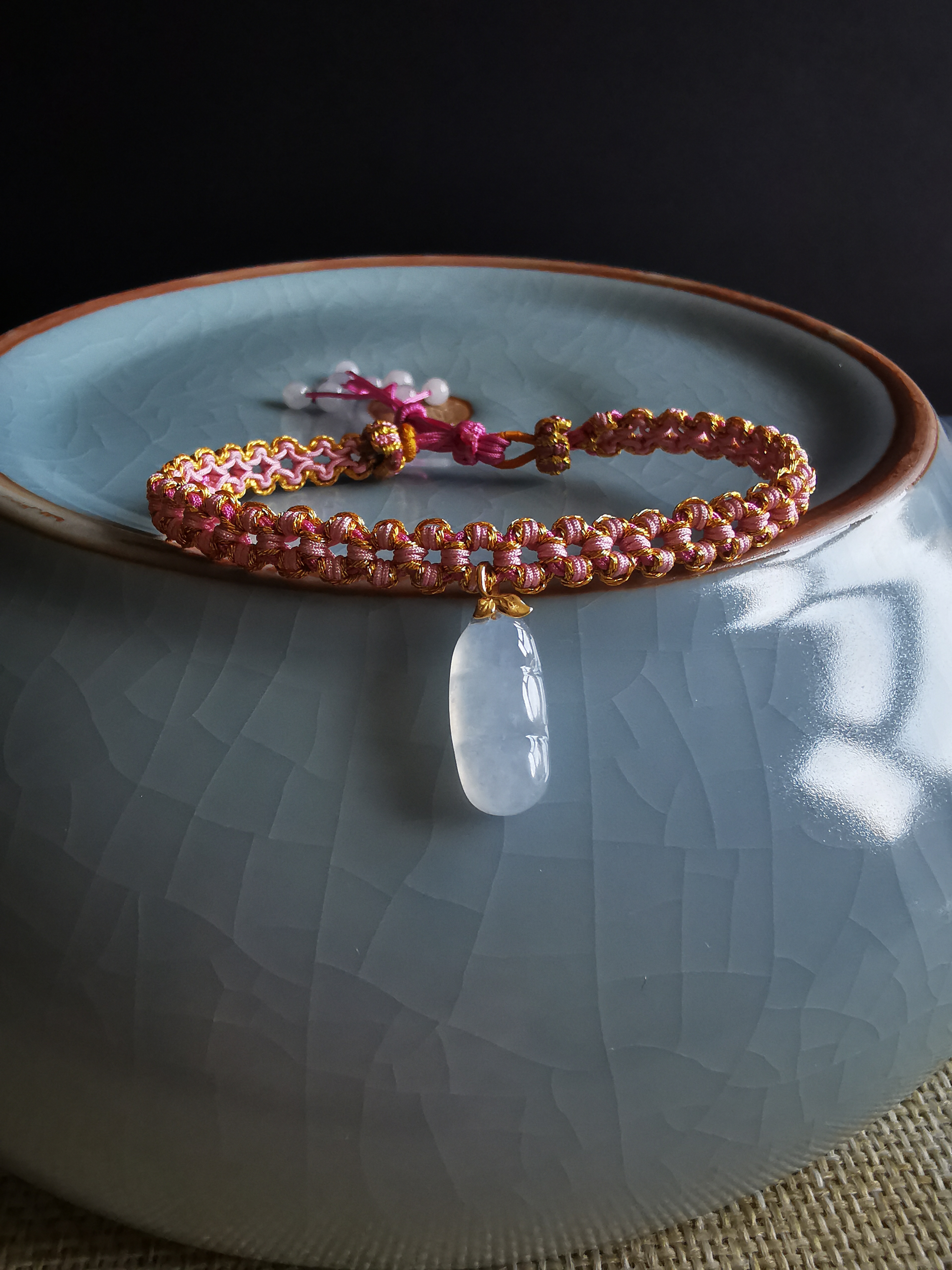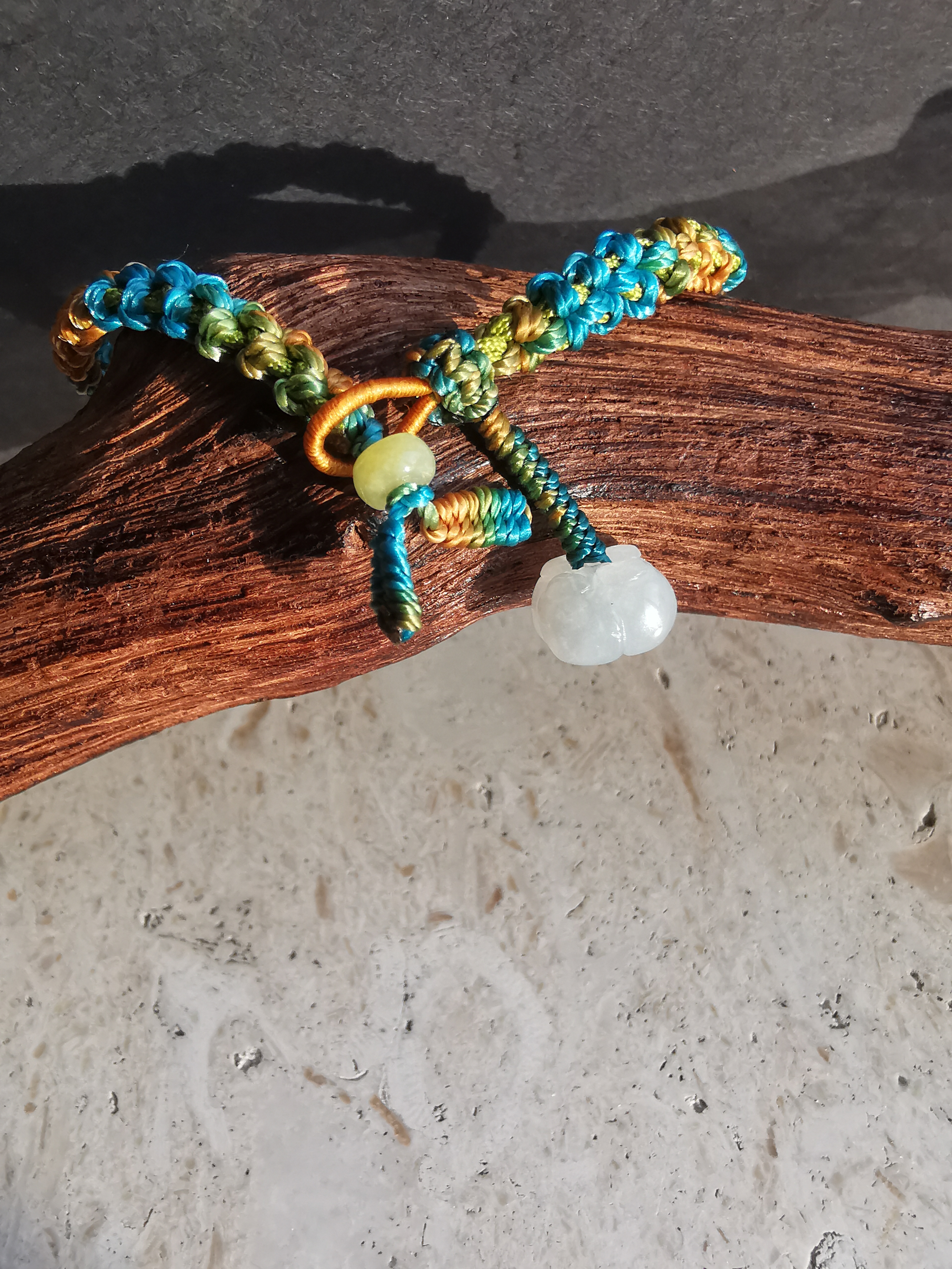 精选。冰种带翠小葫芦,18k金扣头,纯手工精心编织粉桃花及灰八股绳。