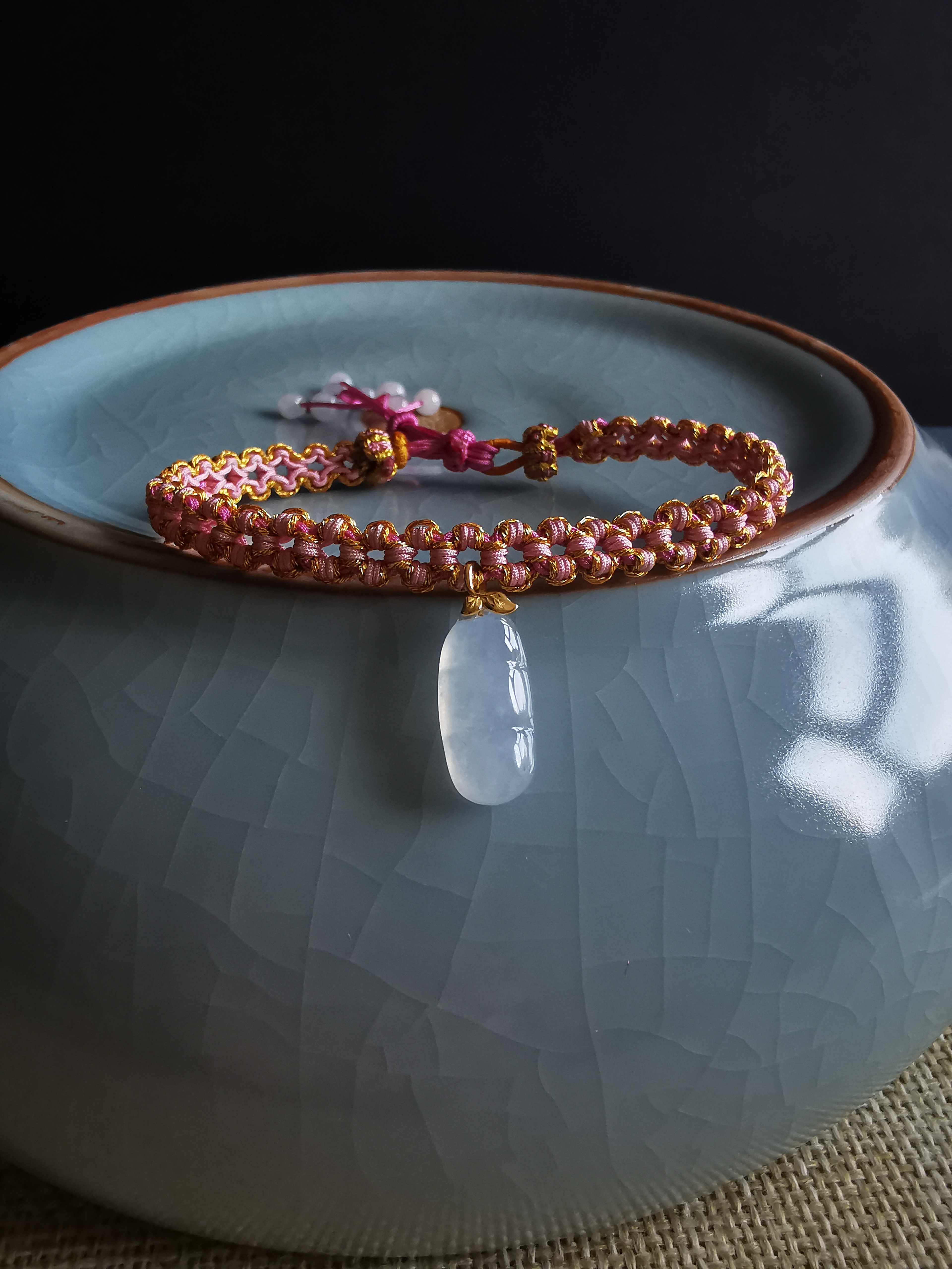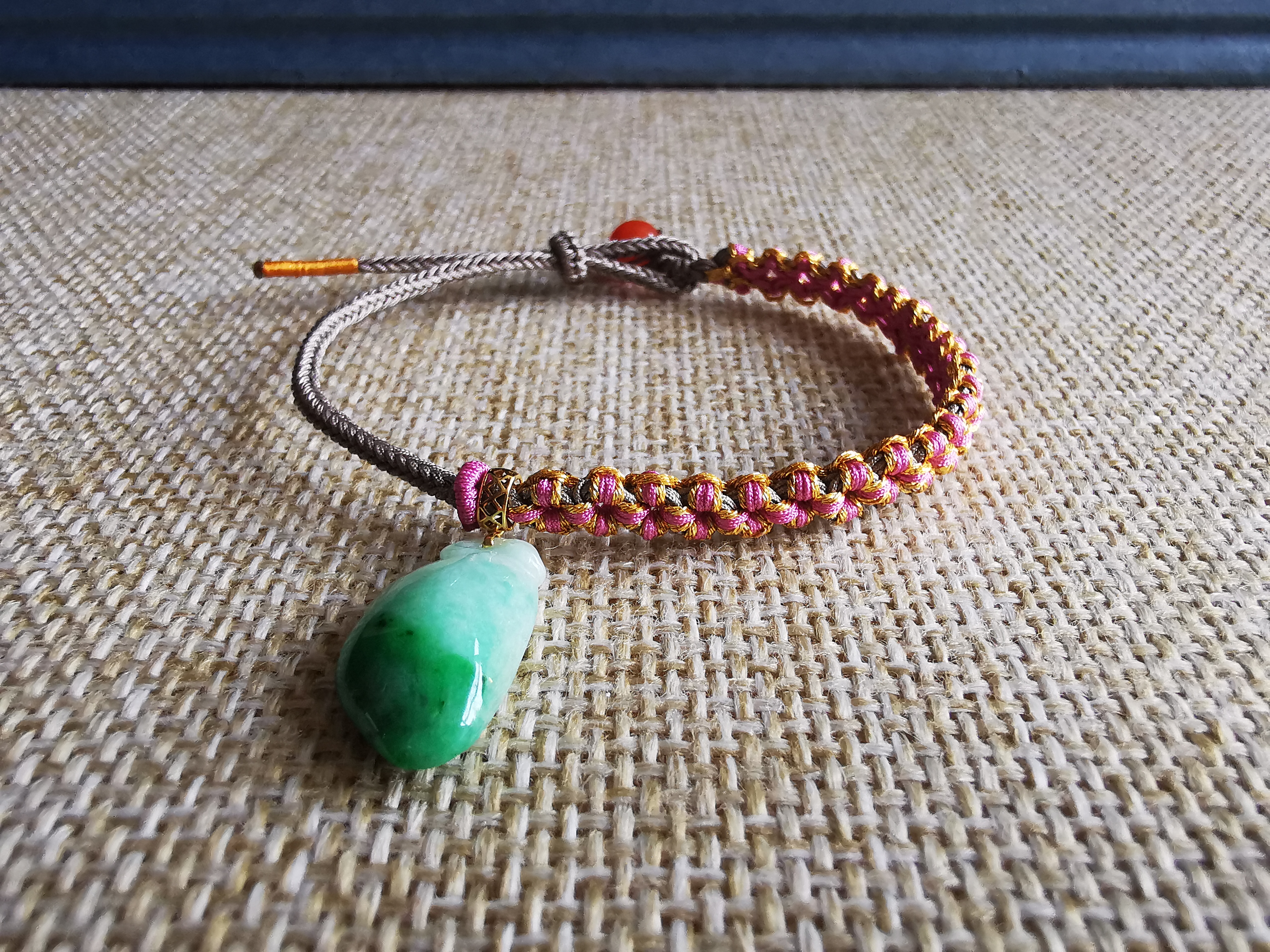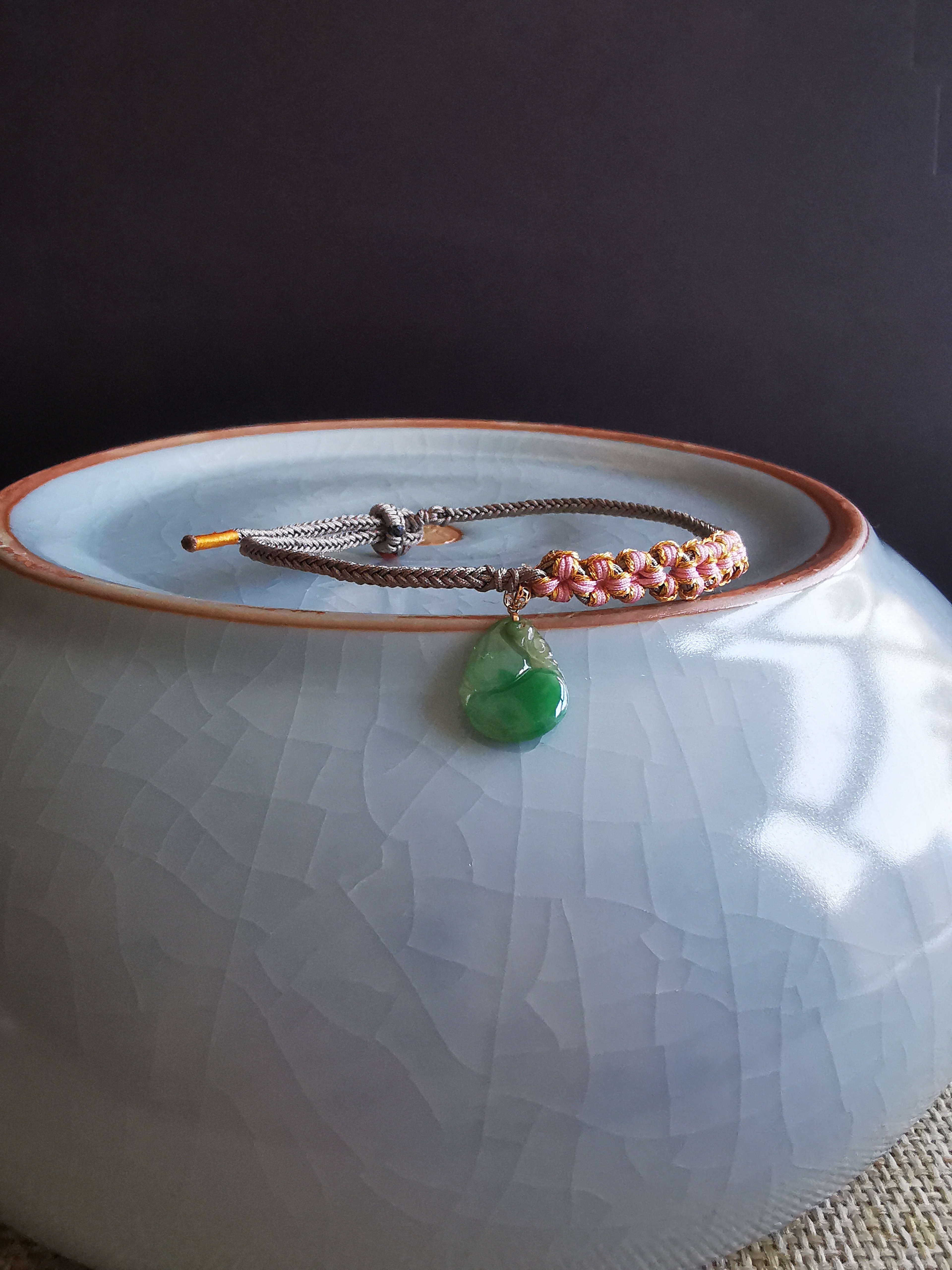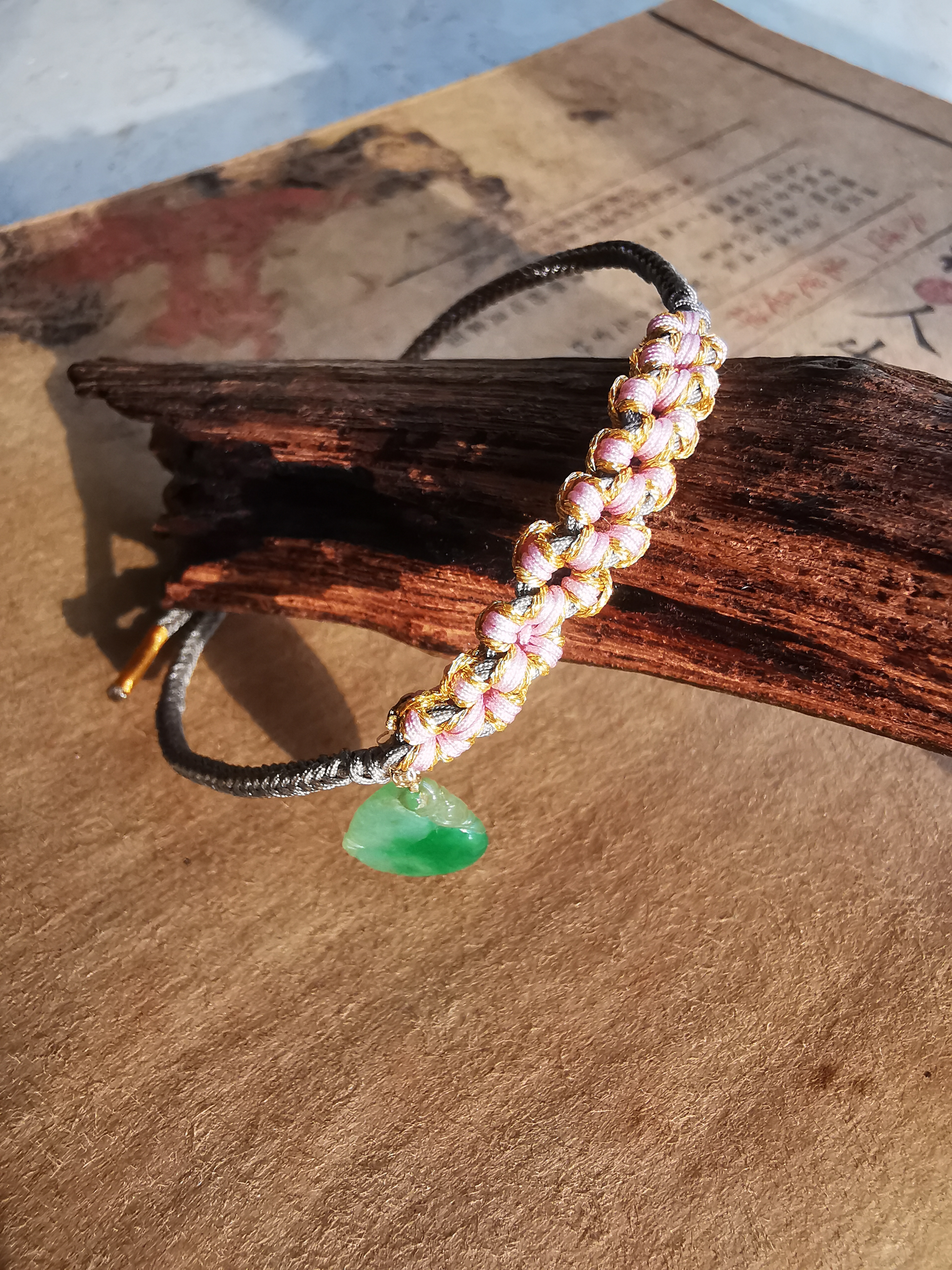 精选糯种飘绿翡翠,18k金扣头,纯手工精心编织粉桃花及灰八股绳。