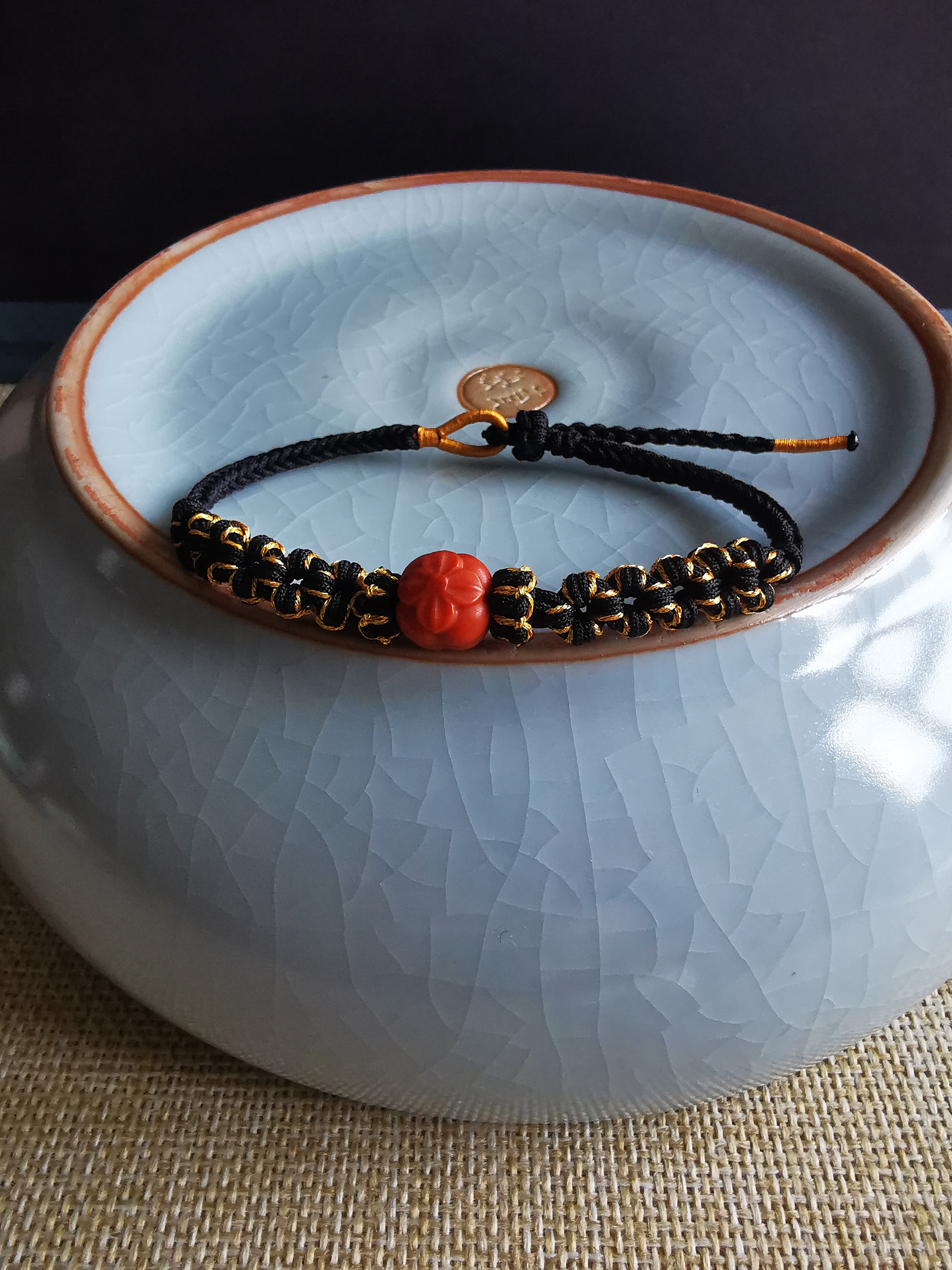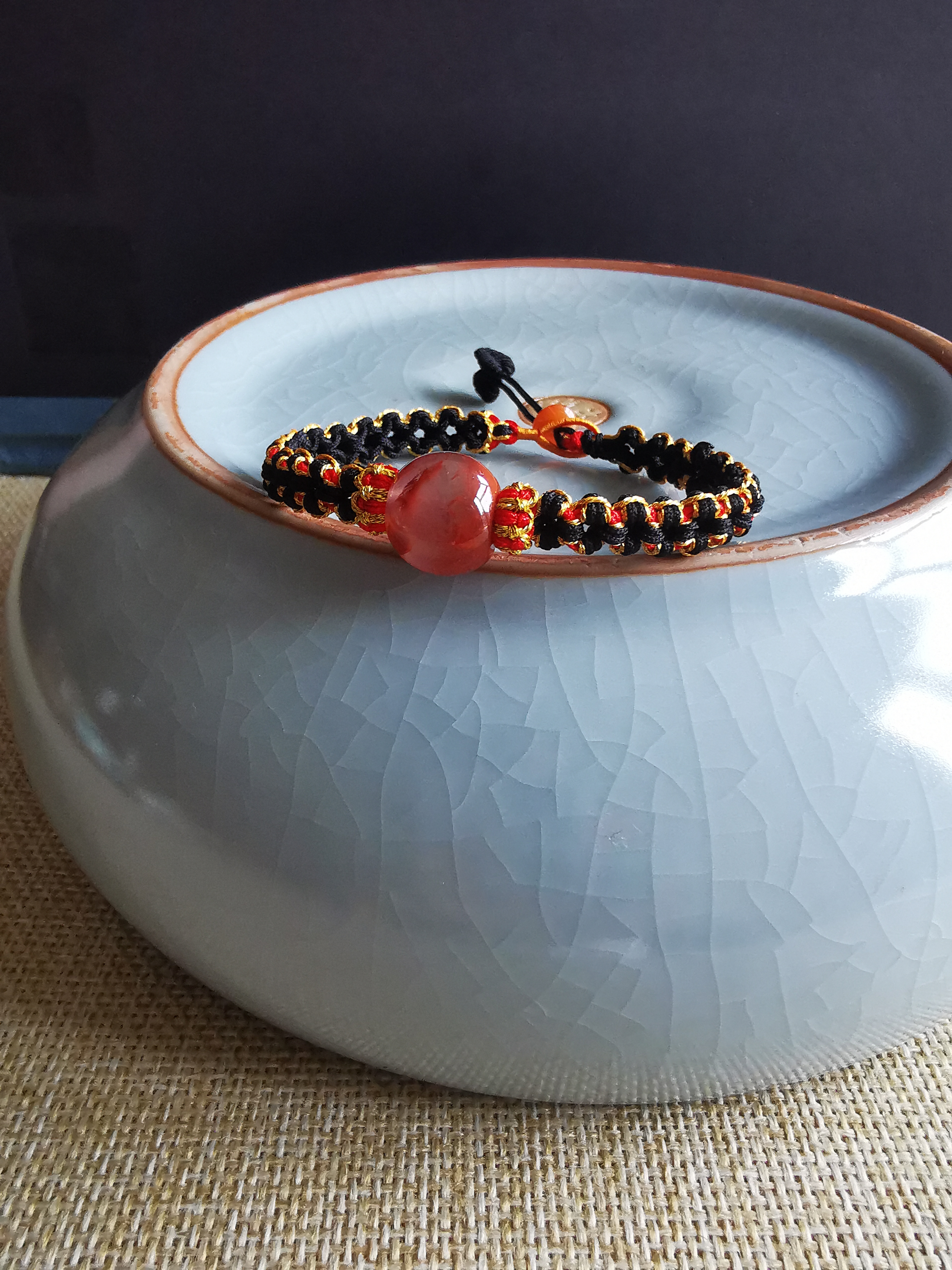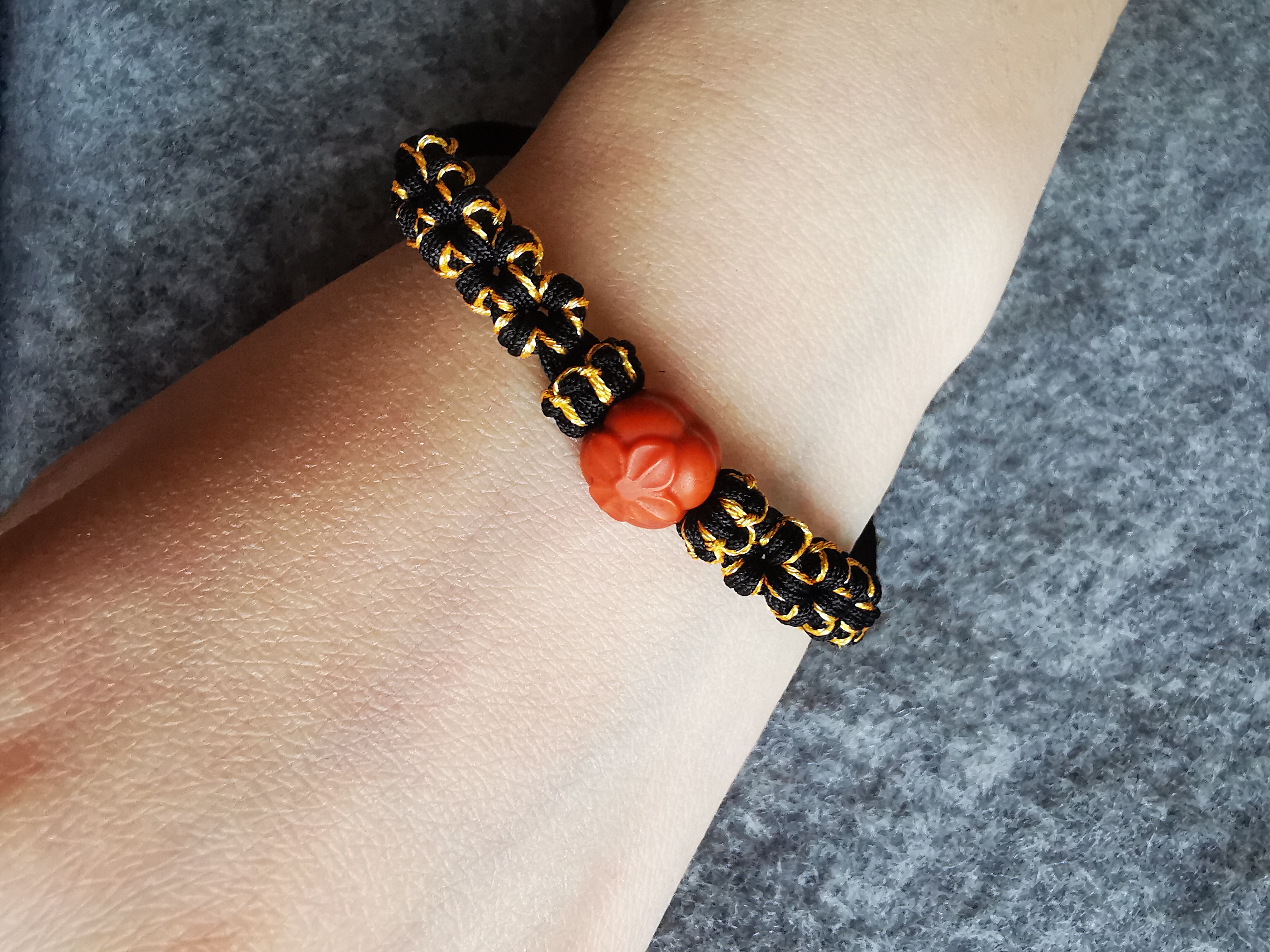 精选南红路路通。纯手工精心编织中国红黑桃花。最大手围18.5cm。
