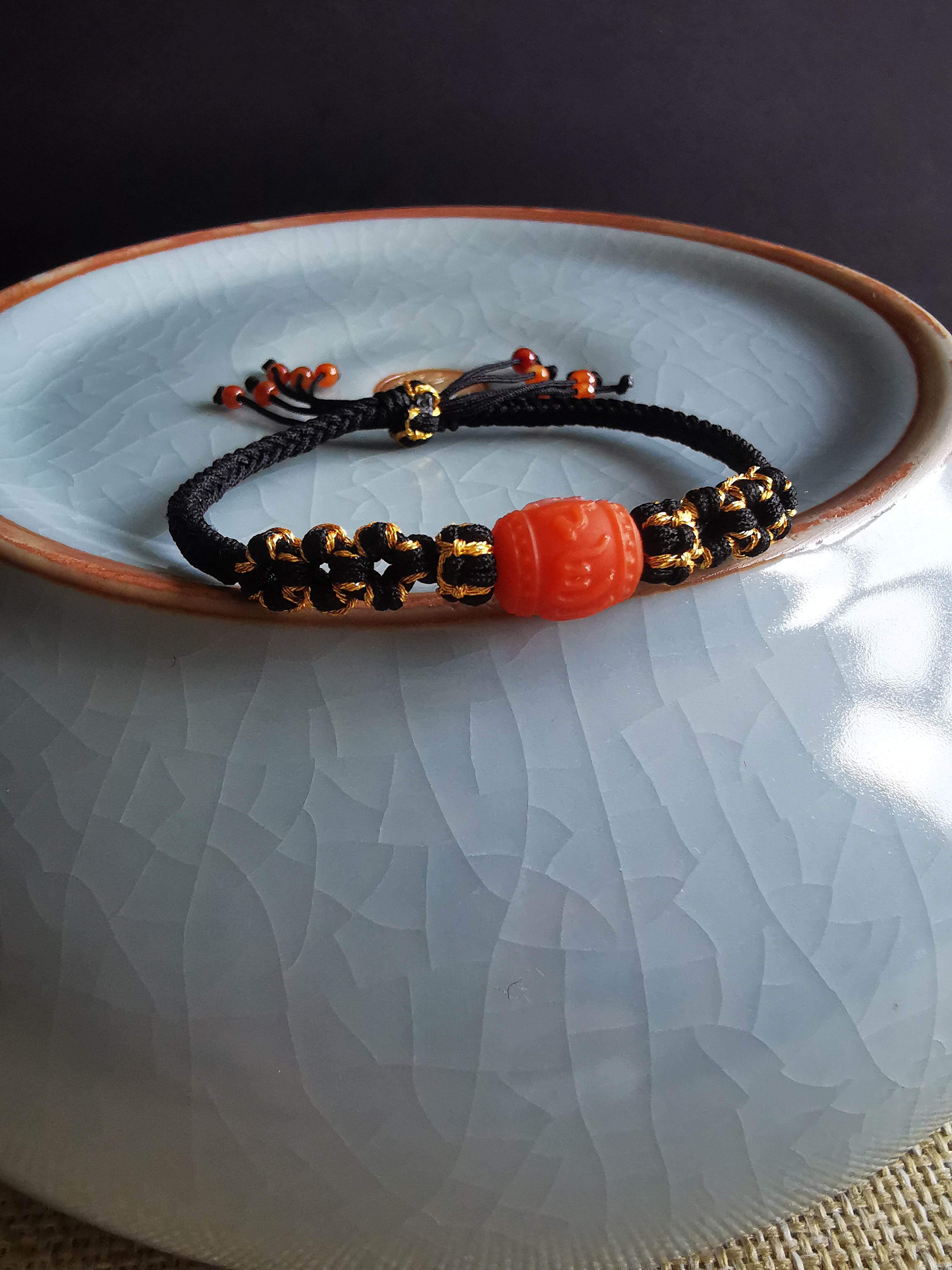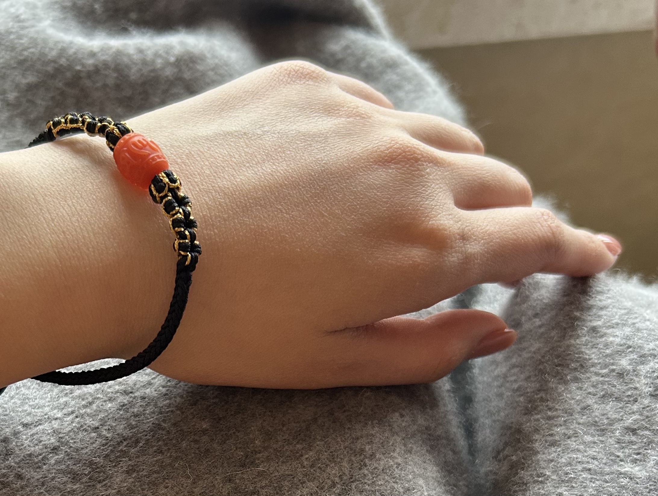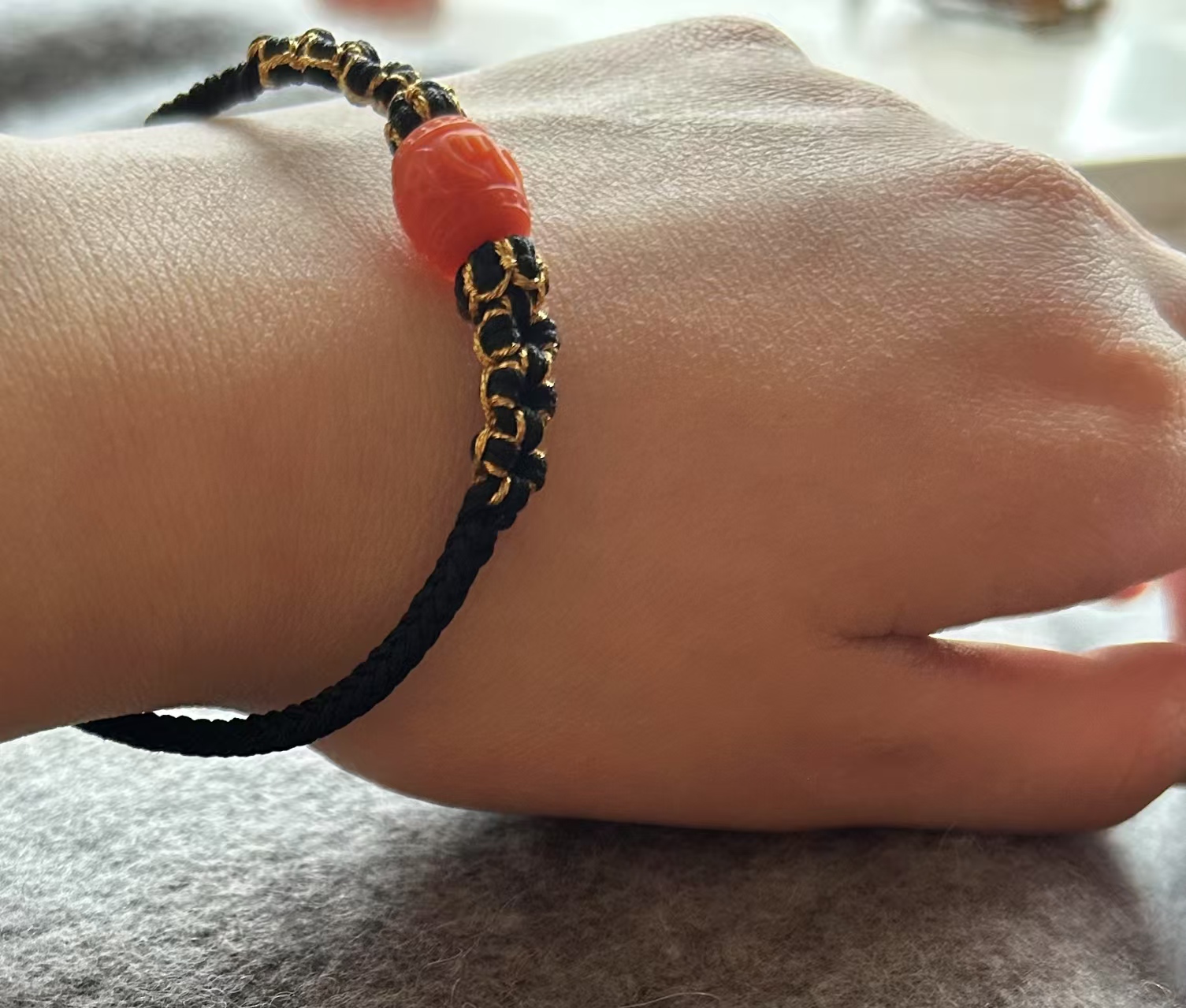 精选南红路路通。纯手工精心编织中国红黑桃花。最大手围18.5cm。