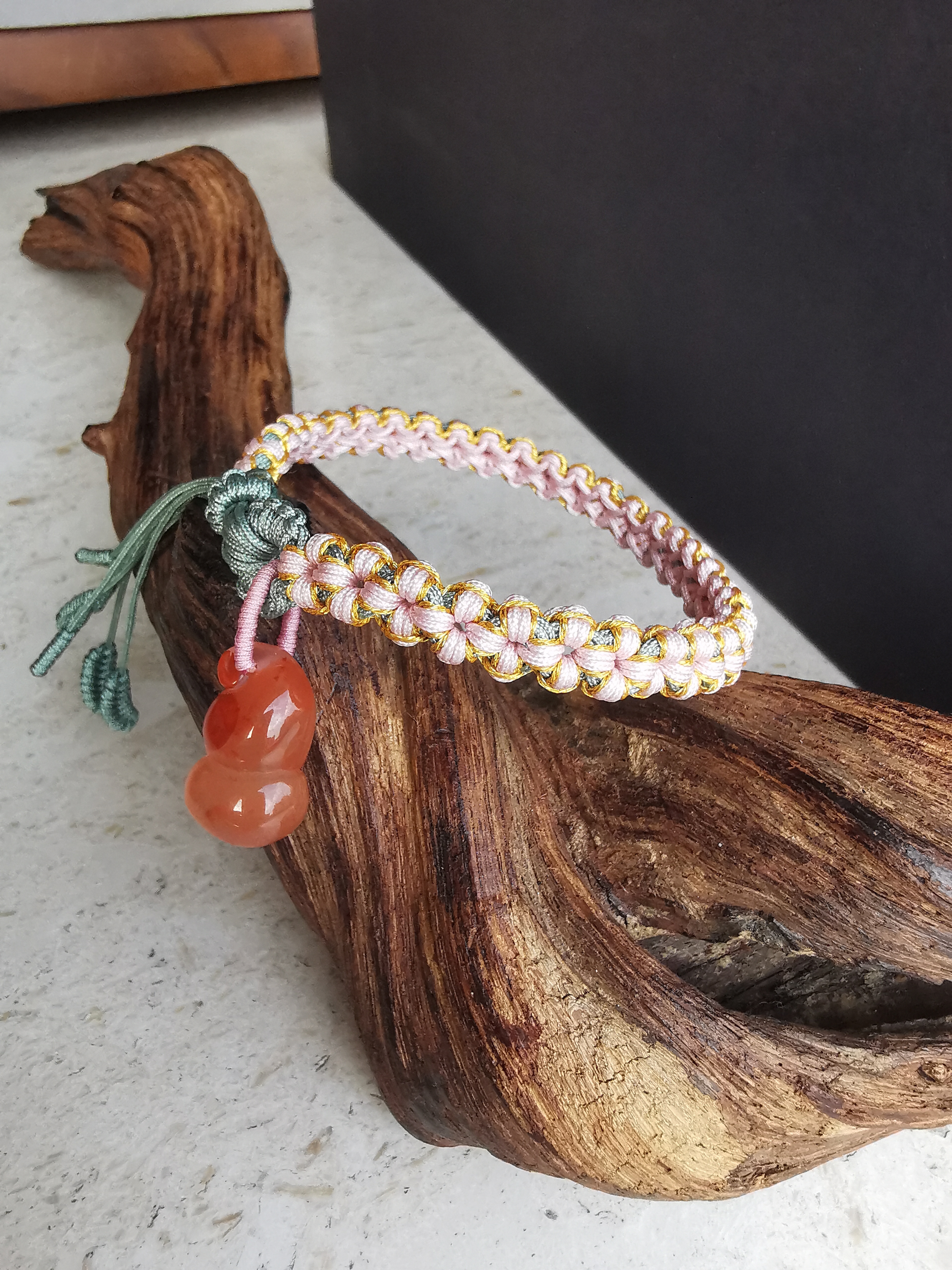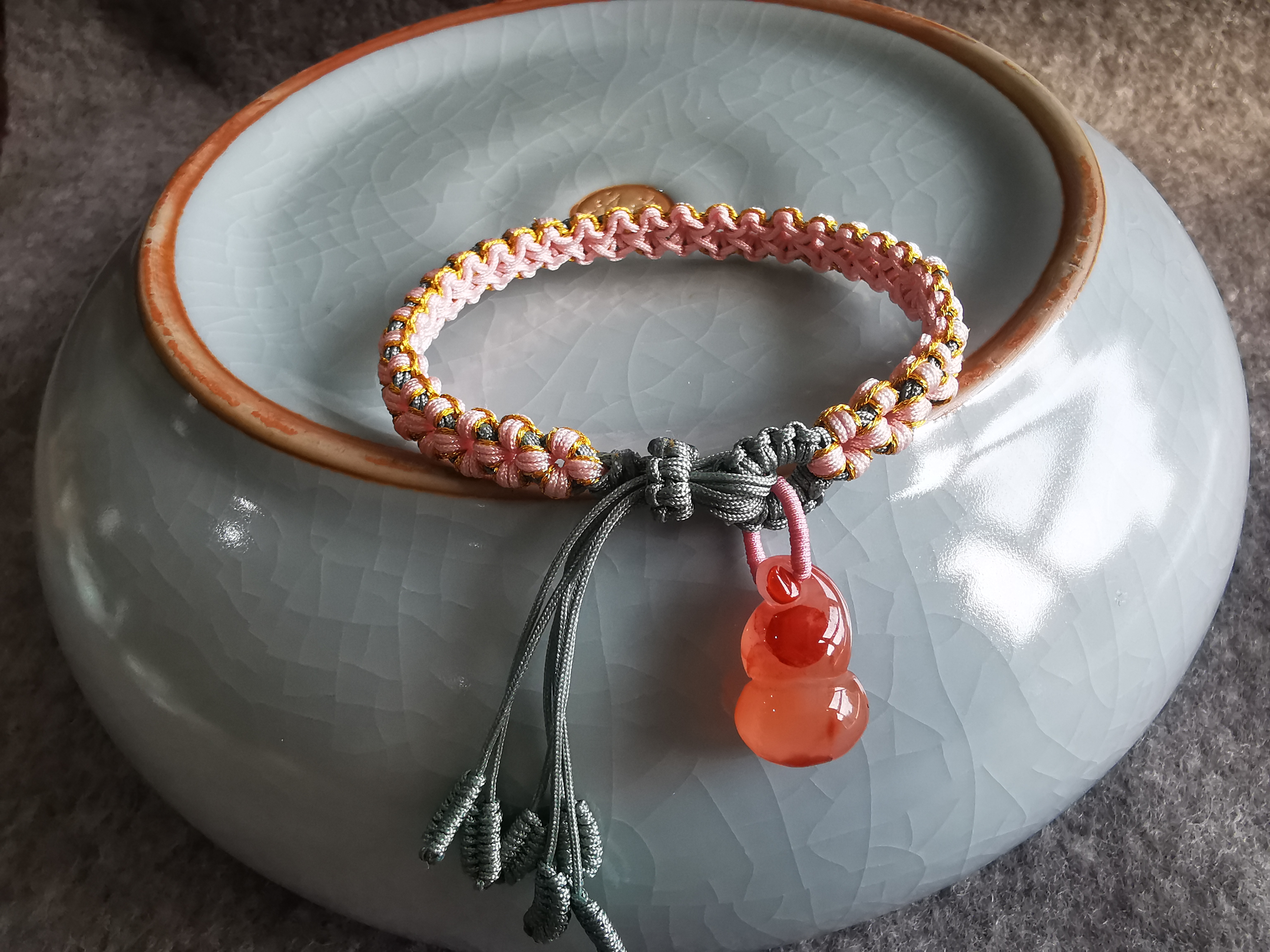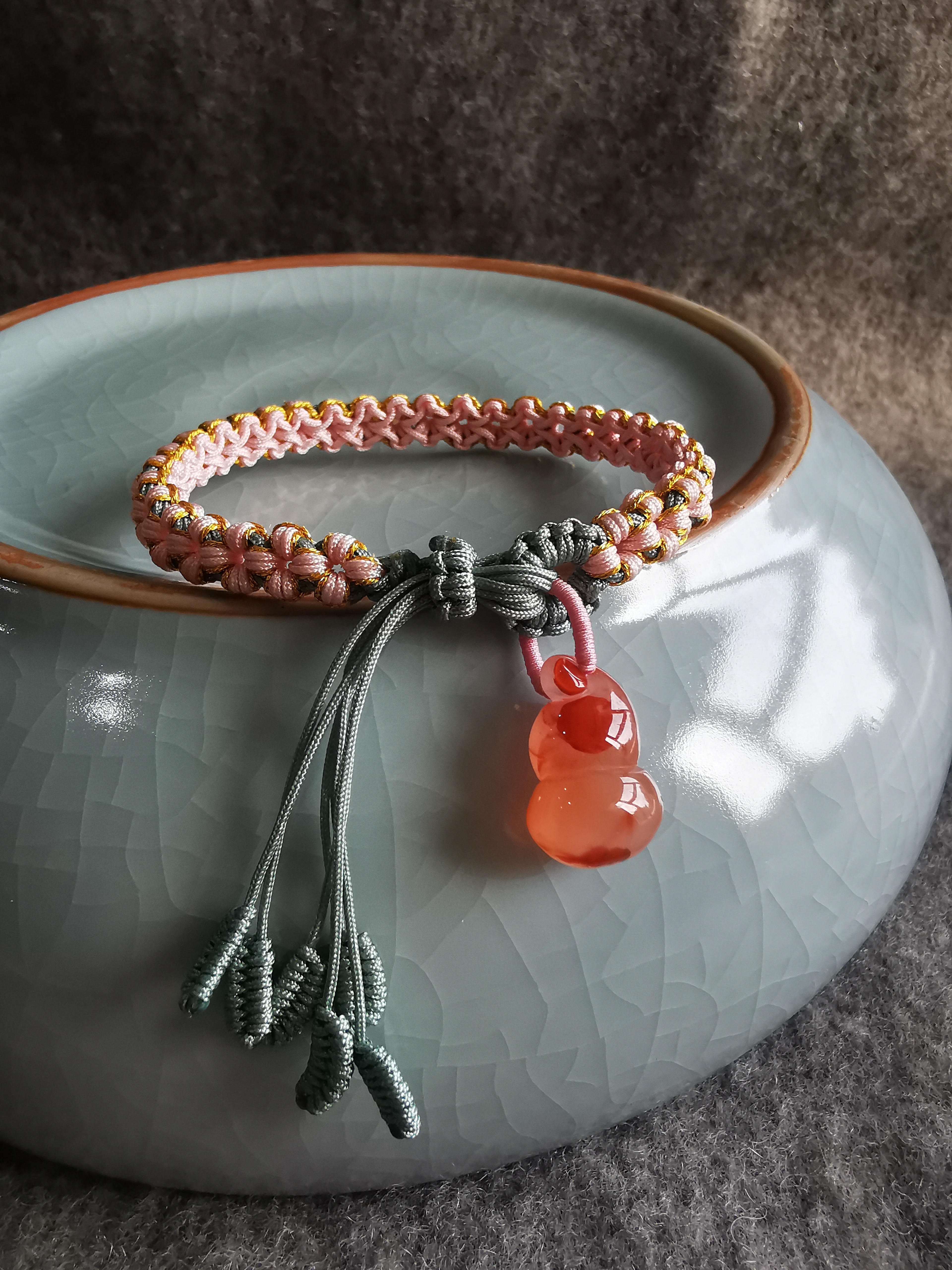 精选南红小葫芦,纯手工精心编织中国结粉桃花。