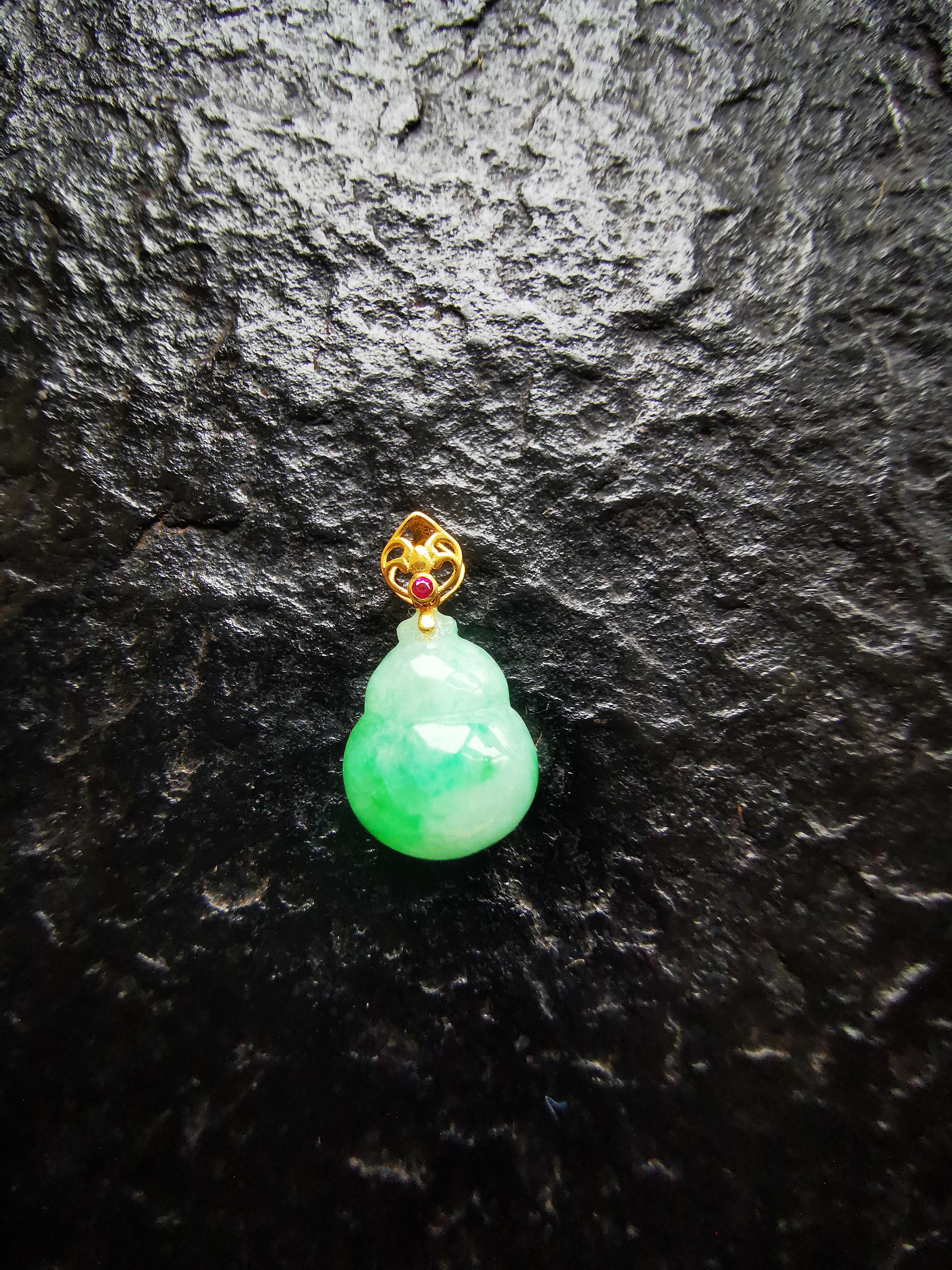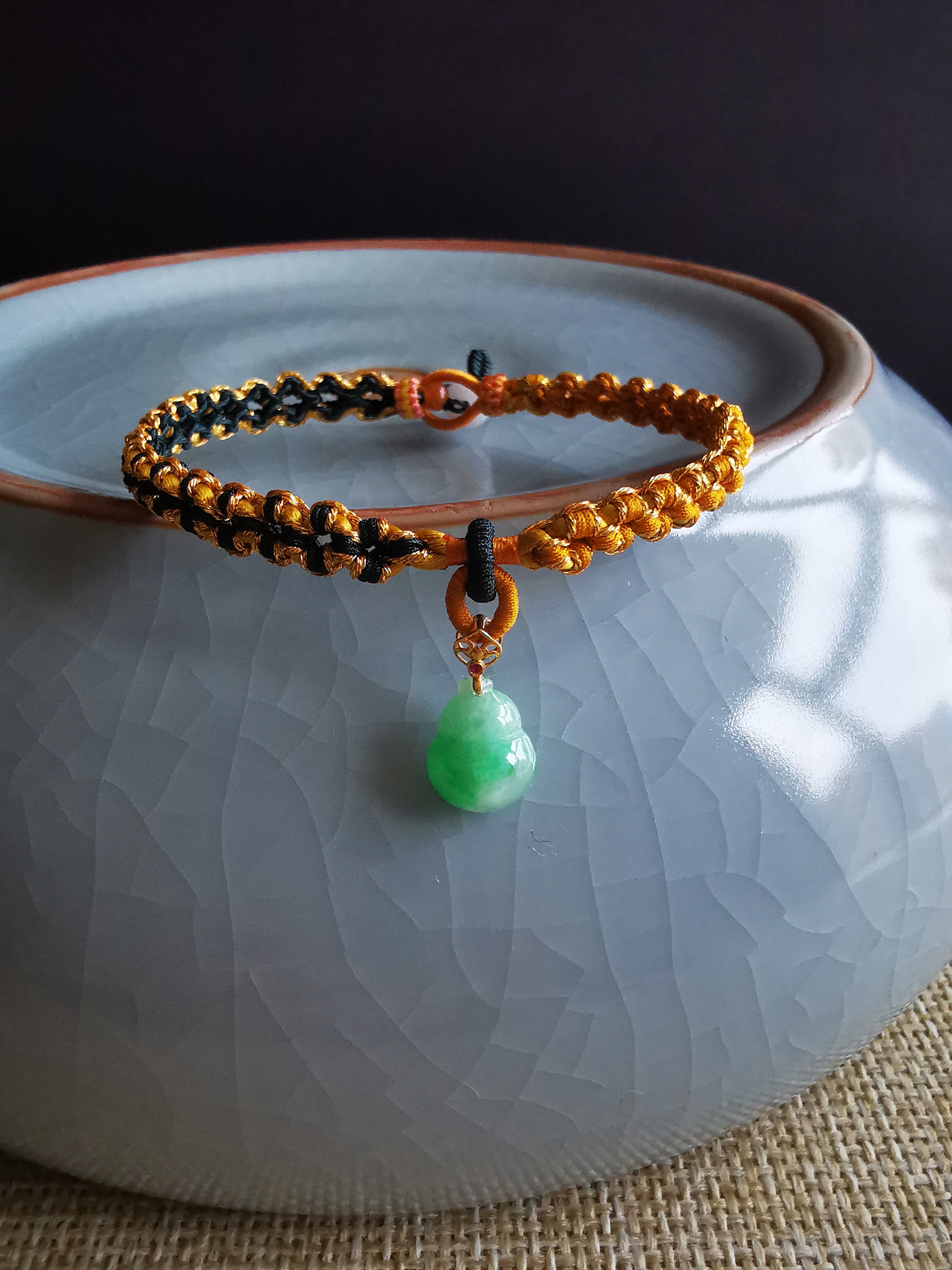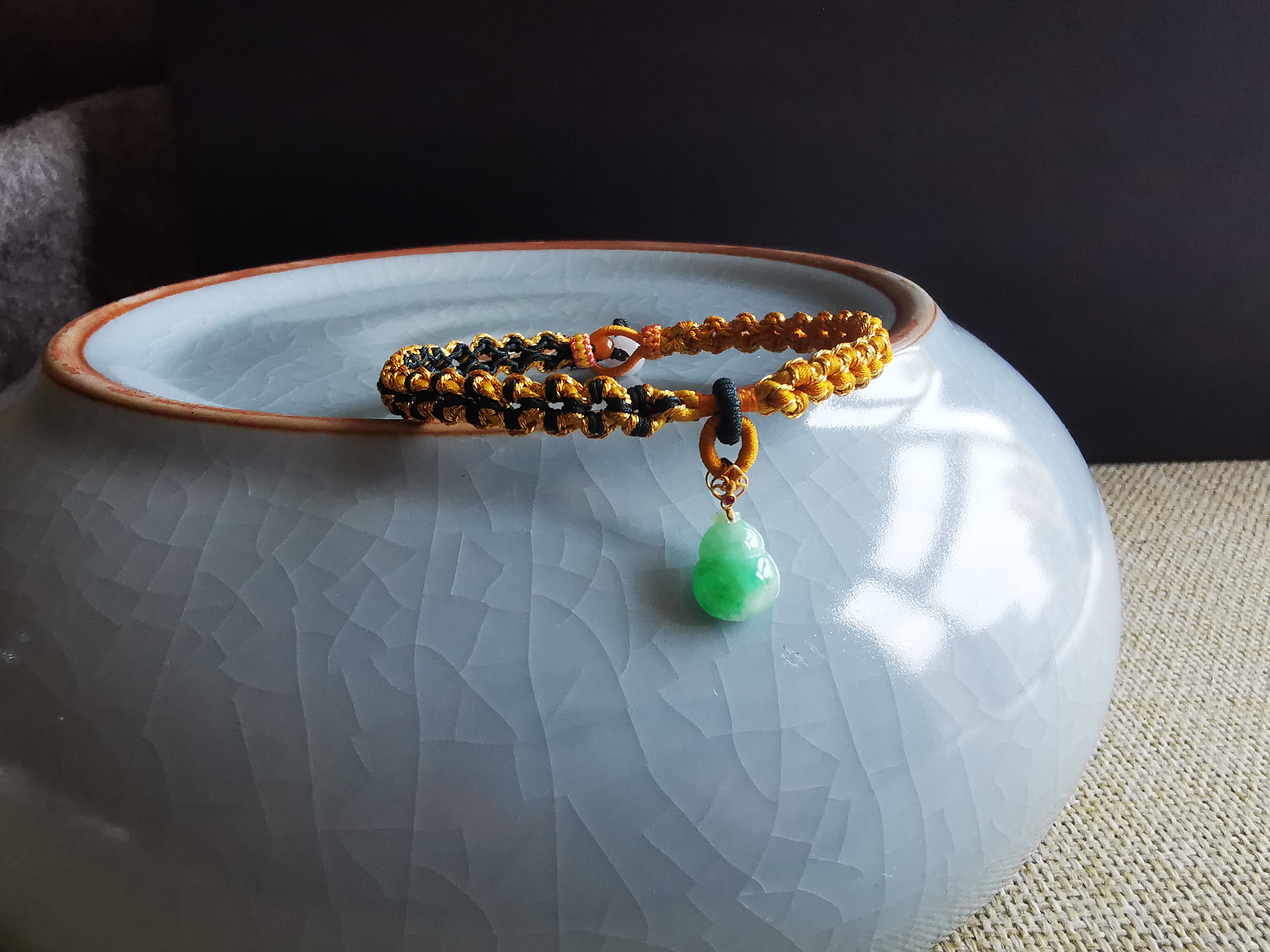 精选高冰翡翠葫芦,18k金扣头,纯手工精心编织中国结绿桃花。