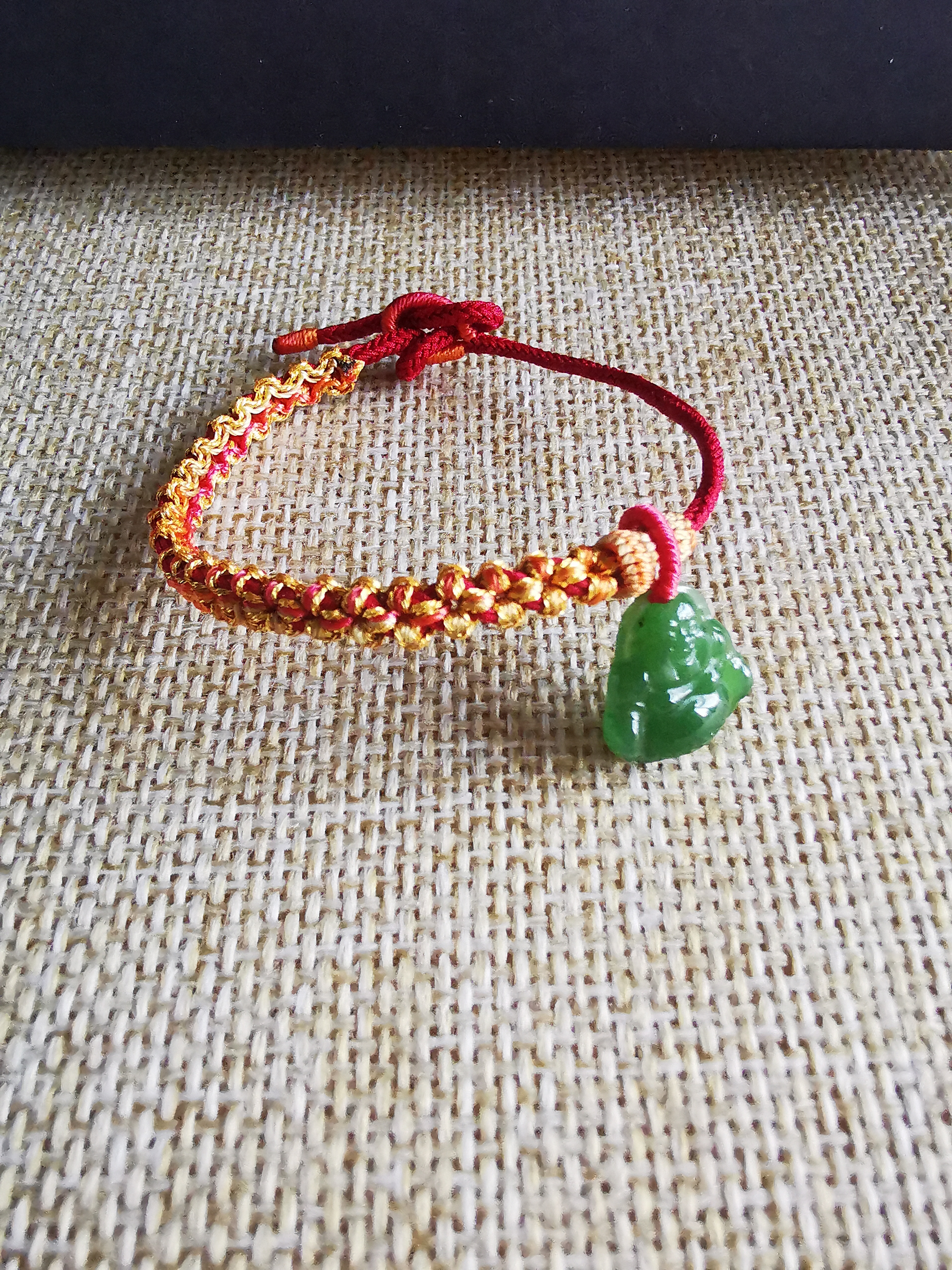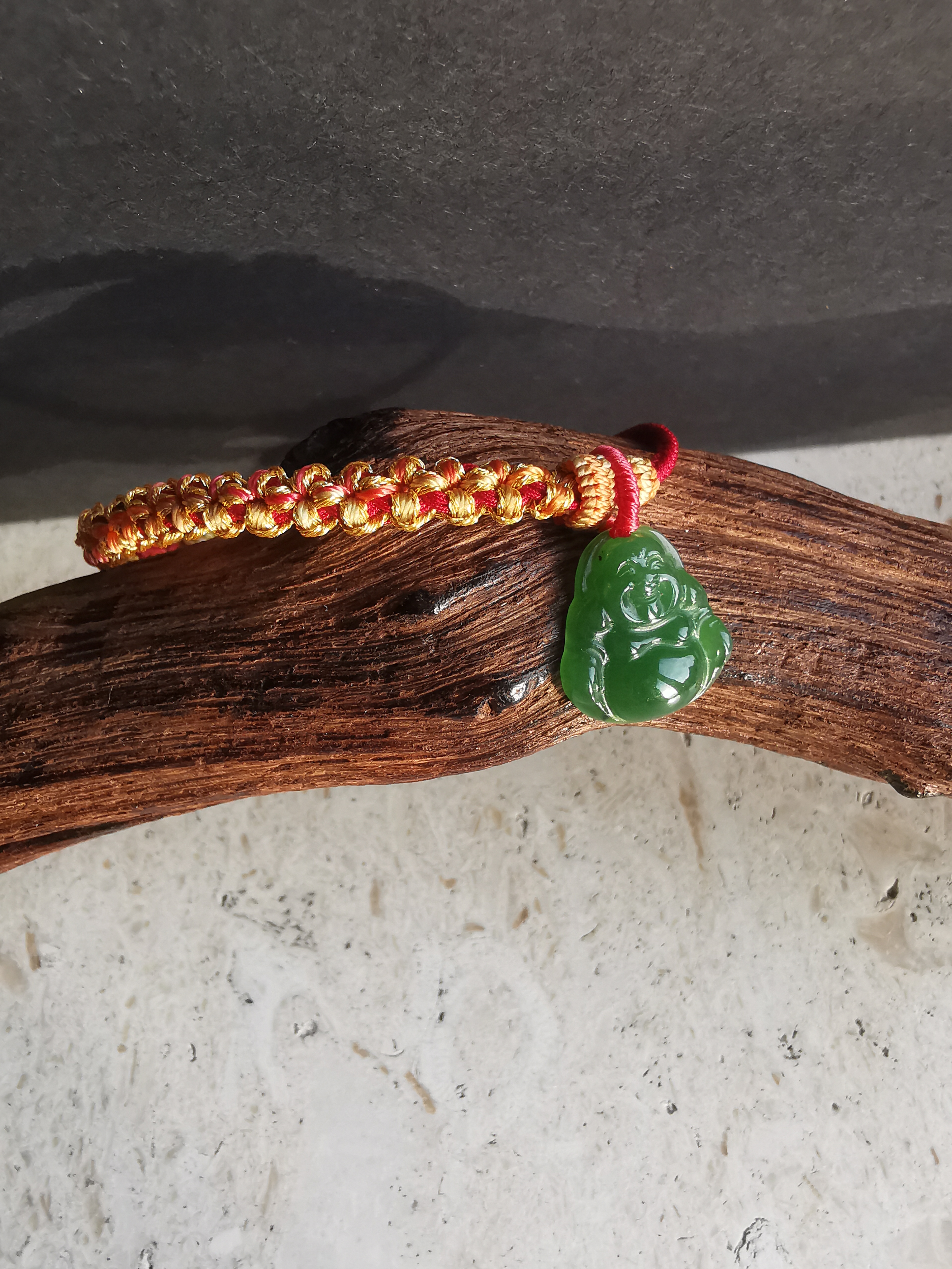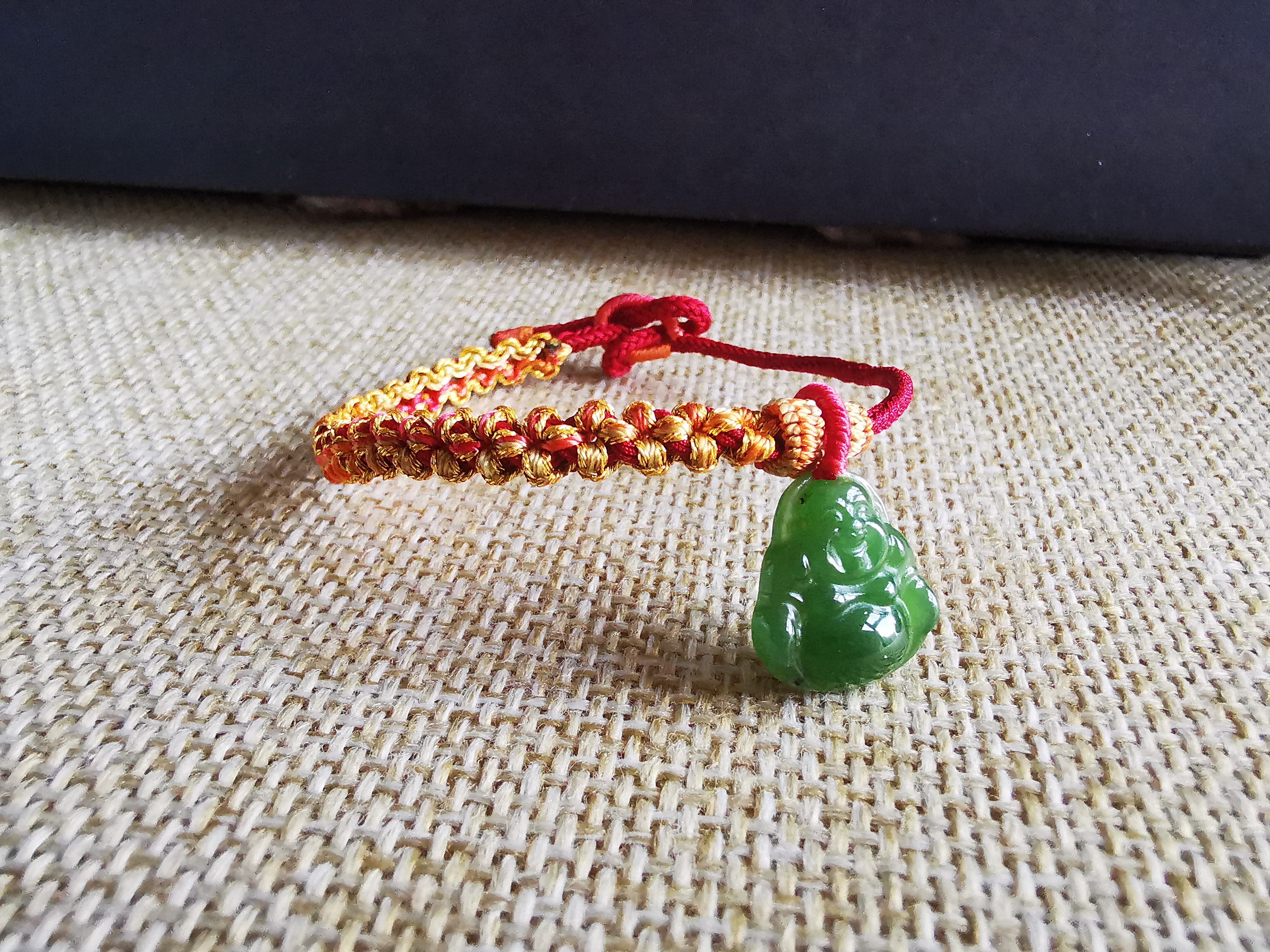 精选碧玉弥勒佛,纯手工精心编织中国结红桃花。