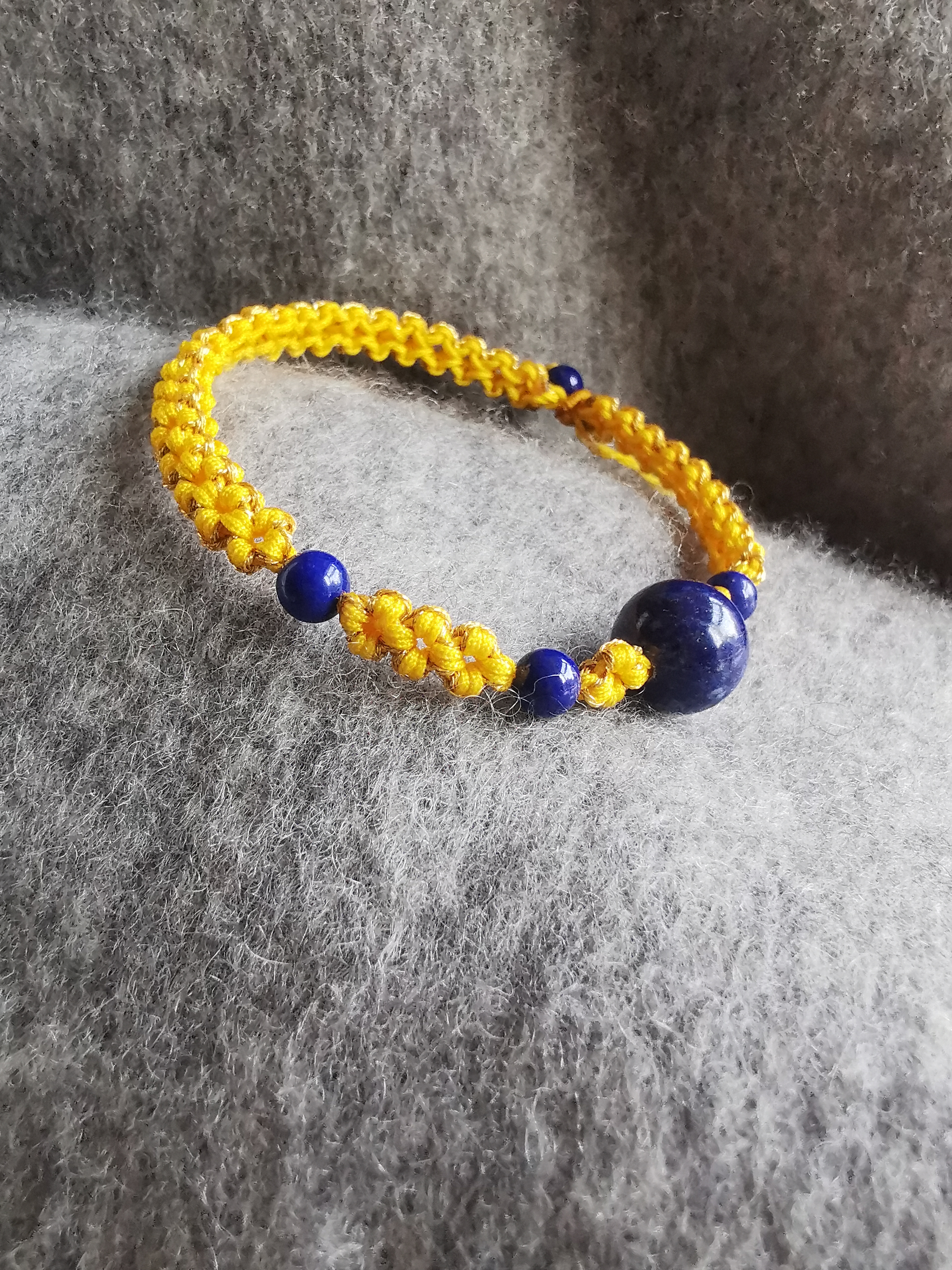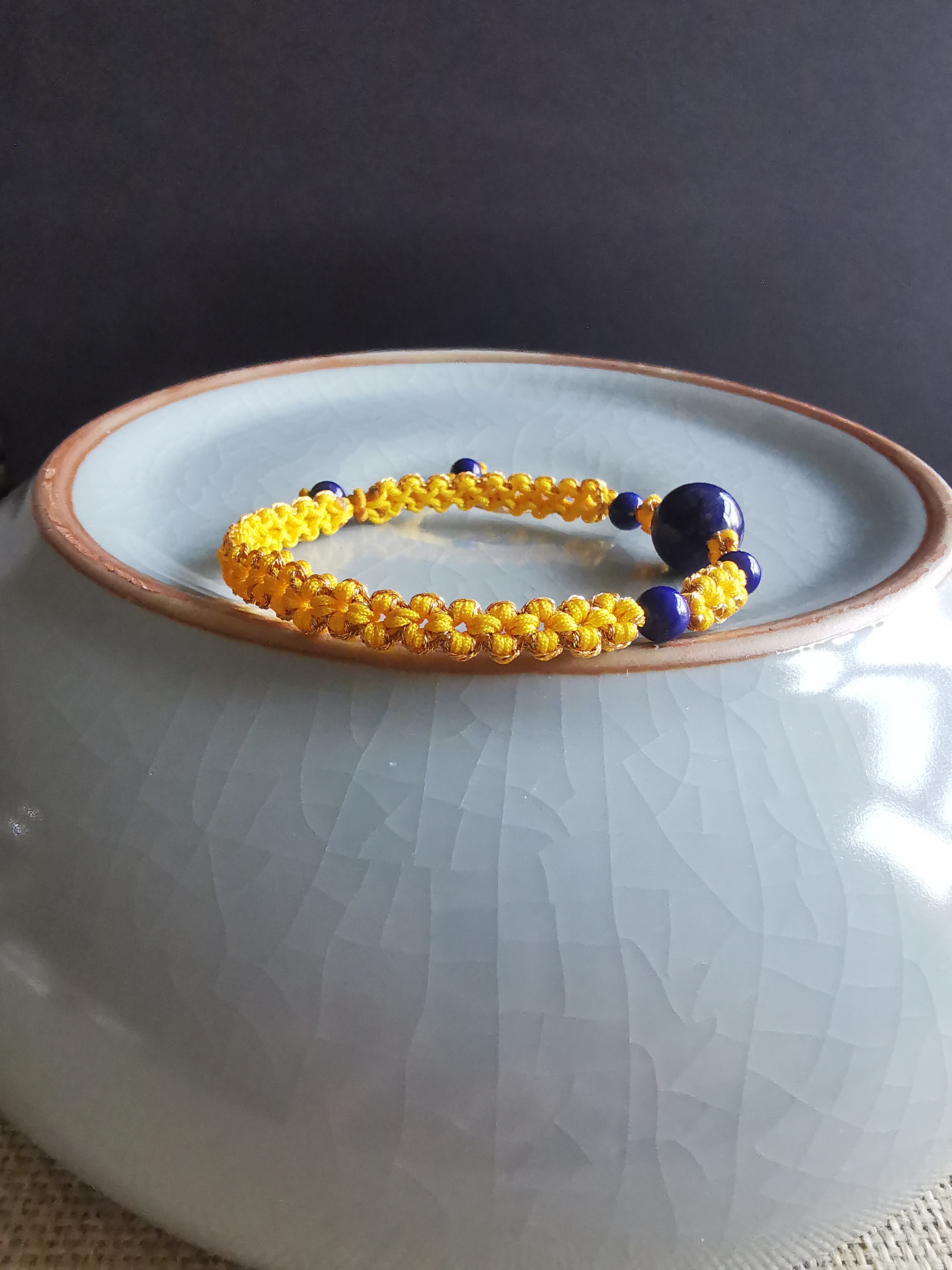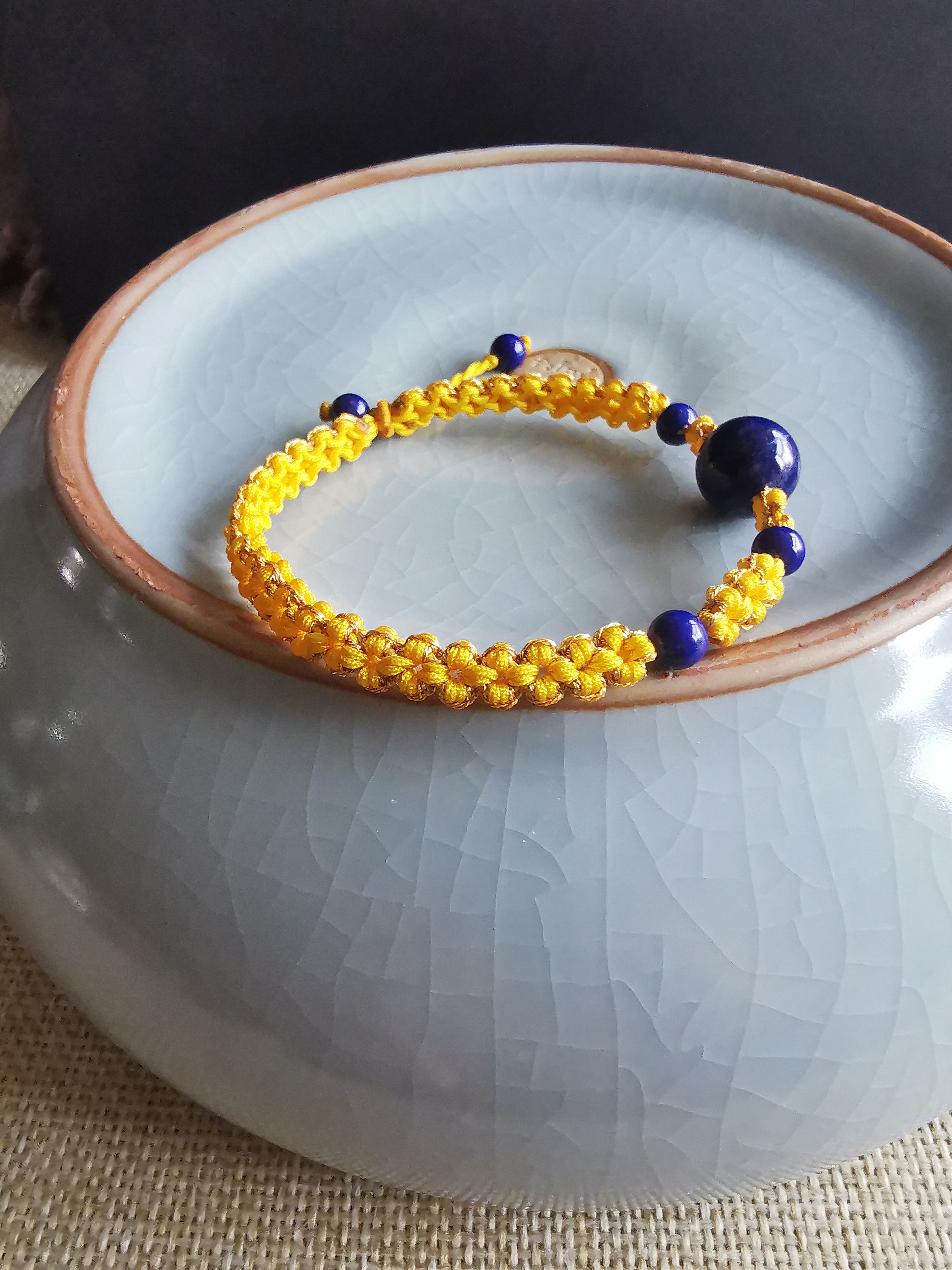 精选高品质约12mm青金石珠子一颗及约5.5mm珠子5颗。纯手工编织中国结金黄桃花。
