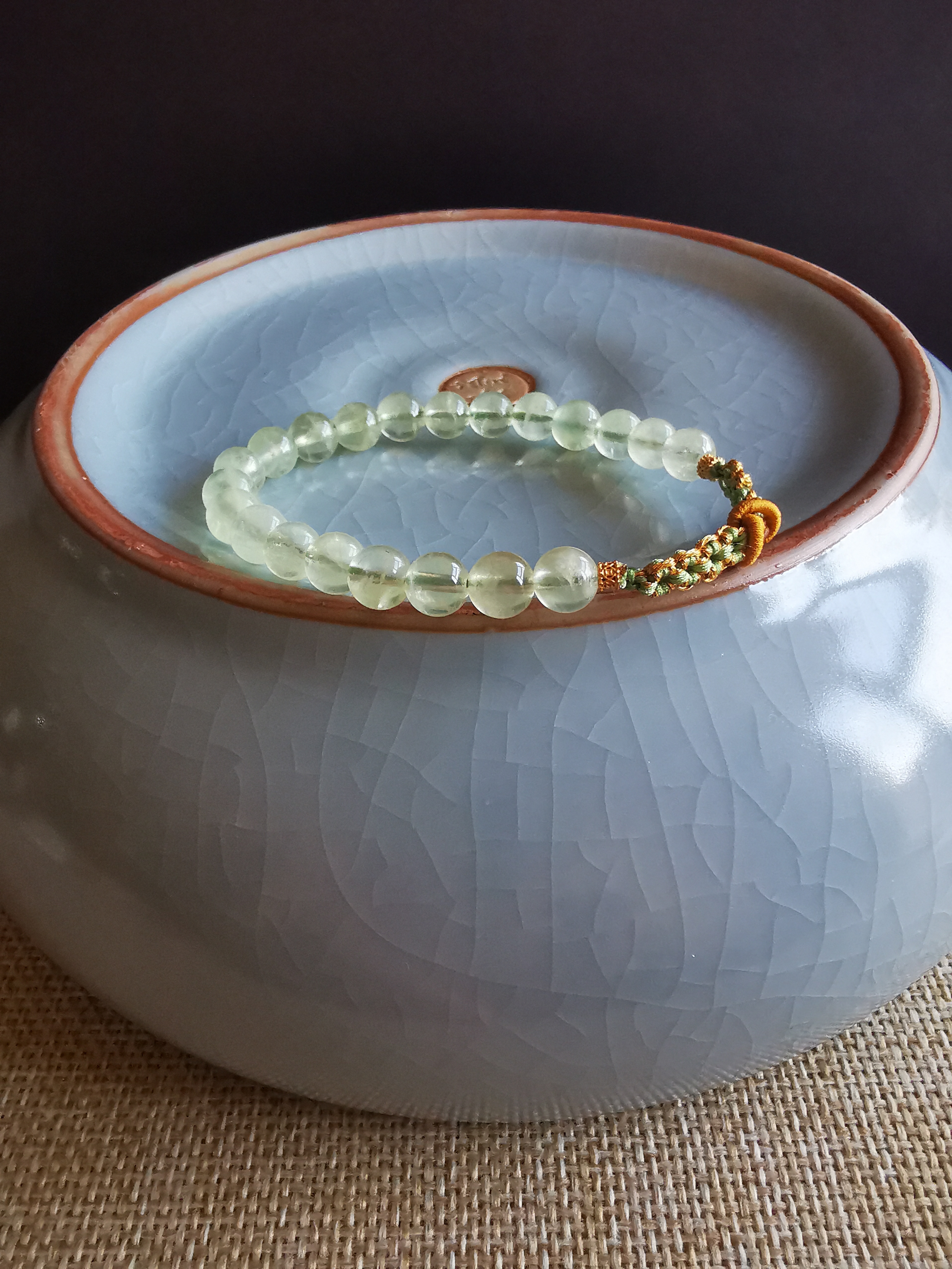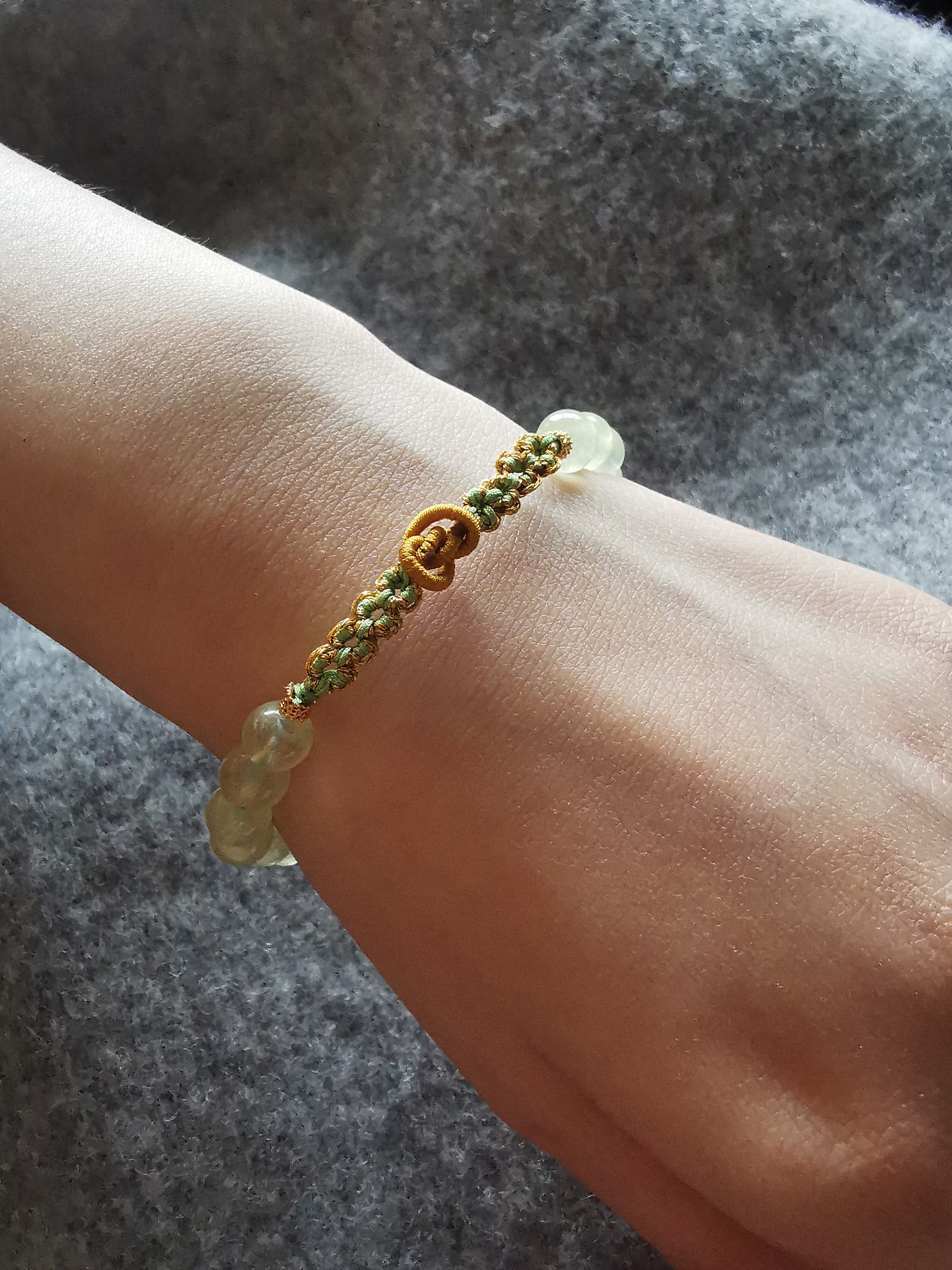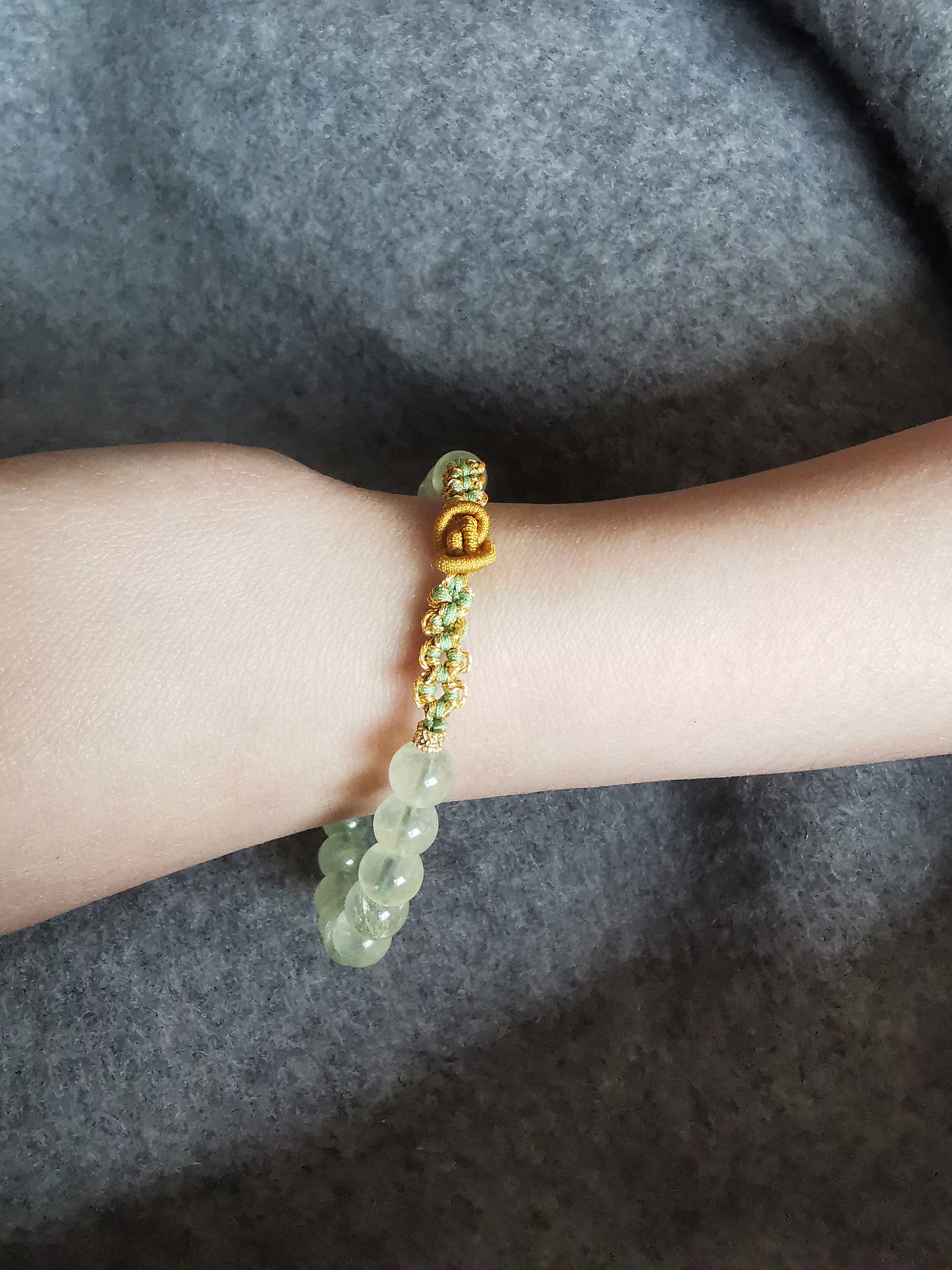 精选约7mm葡萄石珠子21颗,925银隔珠2颗。纯手工精心编织中国结绿桃花。最大手围17cm。