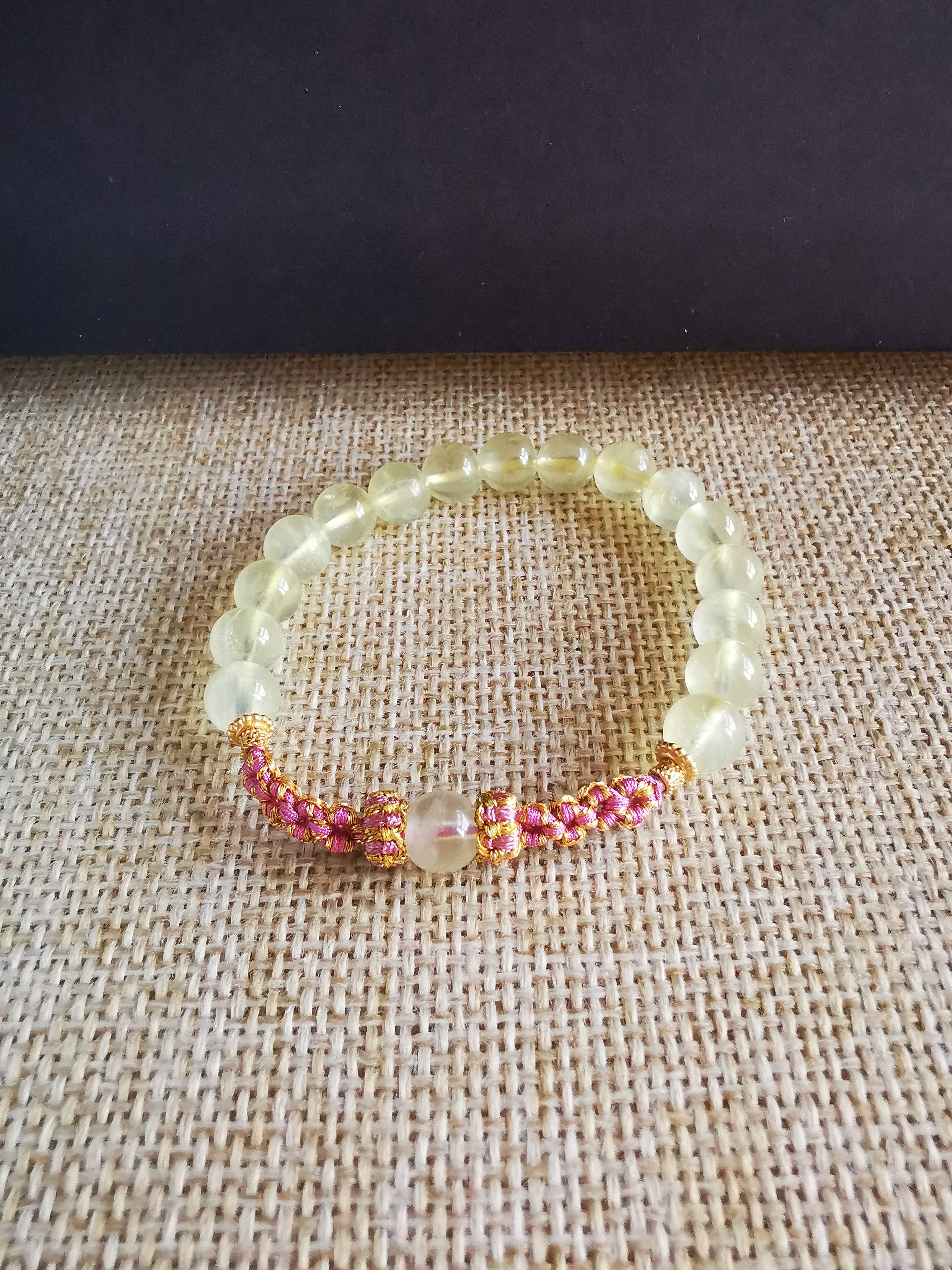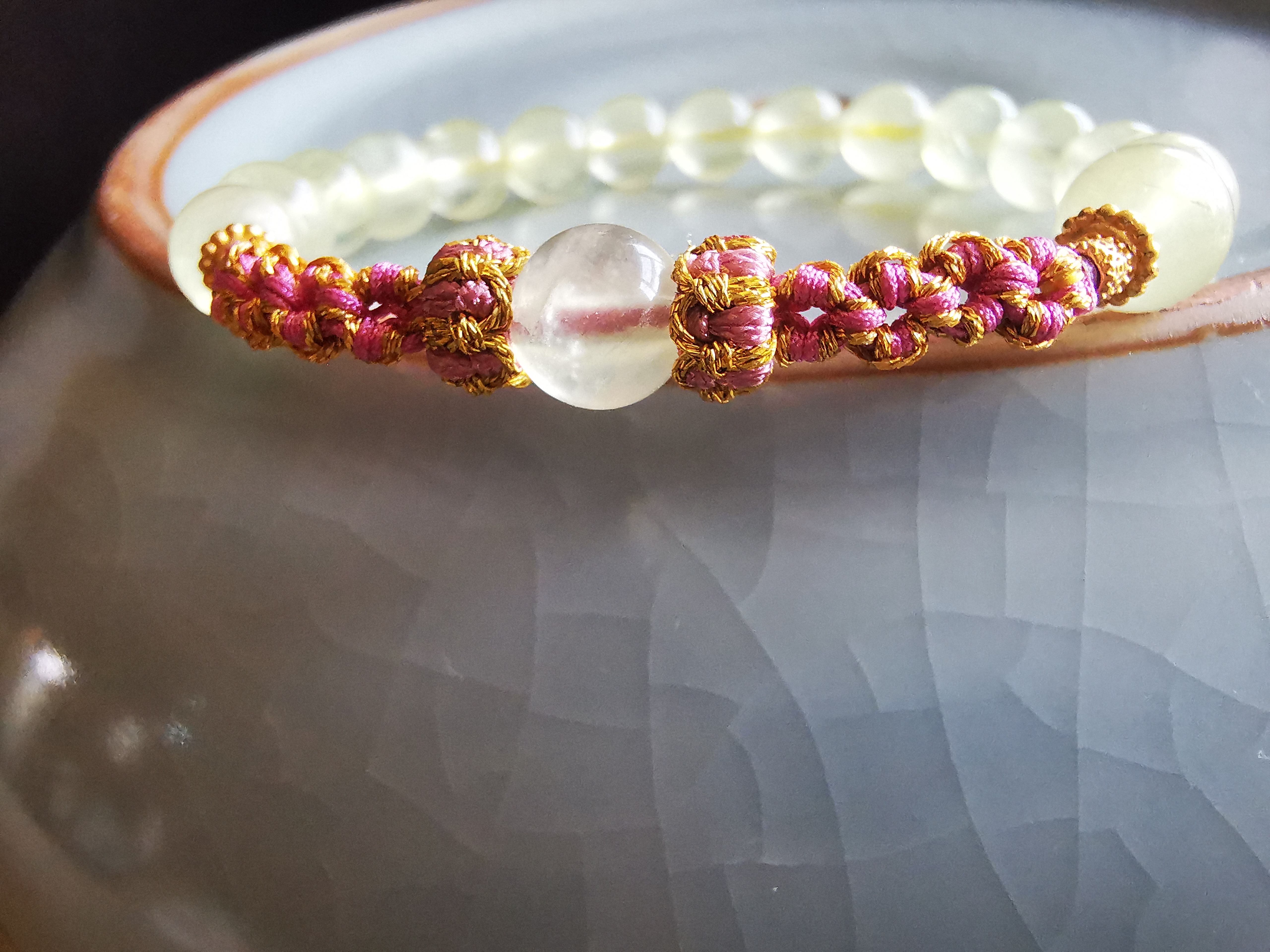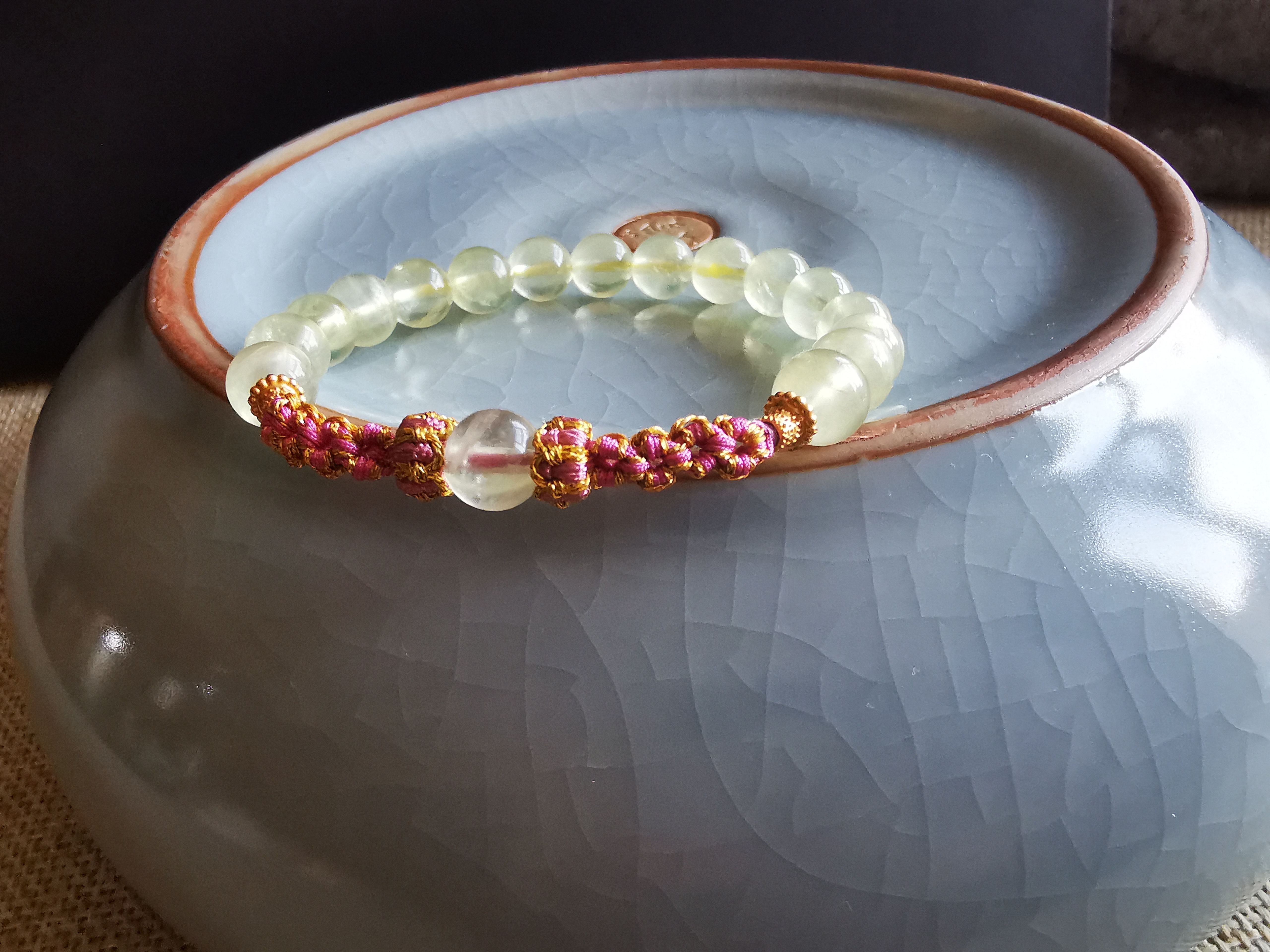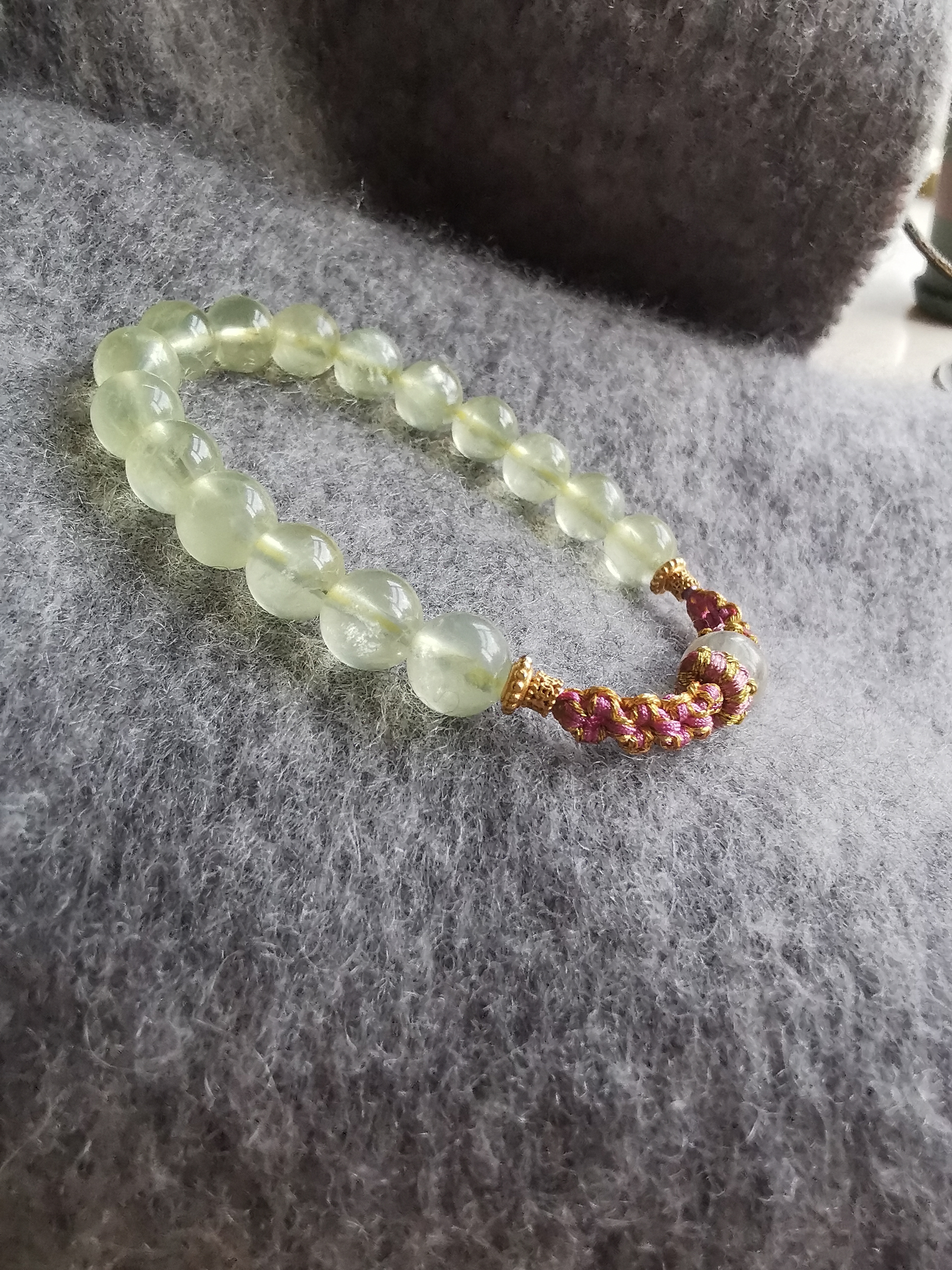 精选约8mm葡萄石圆珠17颗,925银隔珠4颗。纯手工精心编织中国结粉桃花。适合手围17cm之内。
