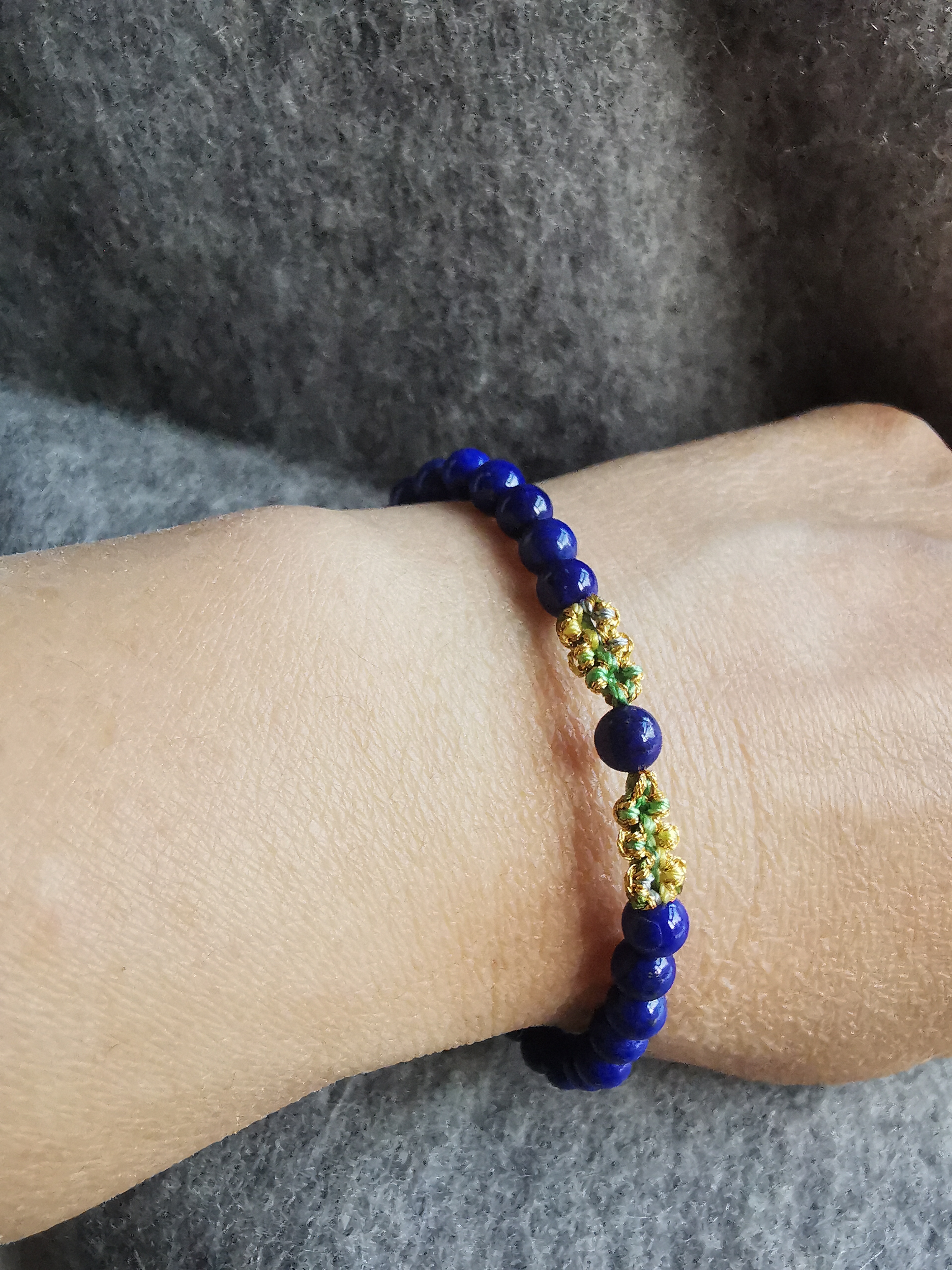 精选高品质约5.5mm青金石珠子29颗。纯手工精心编织中国结绿桃花。最大手围17.2cm。