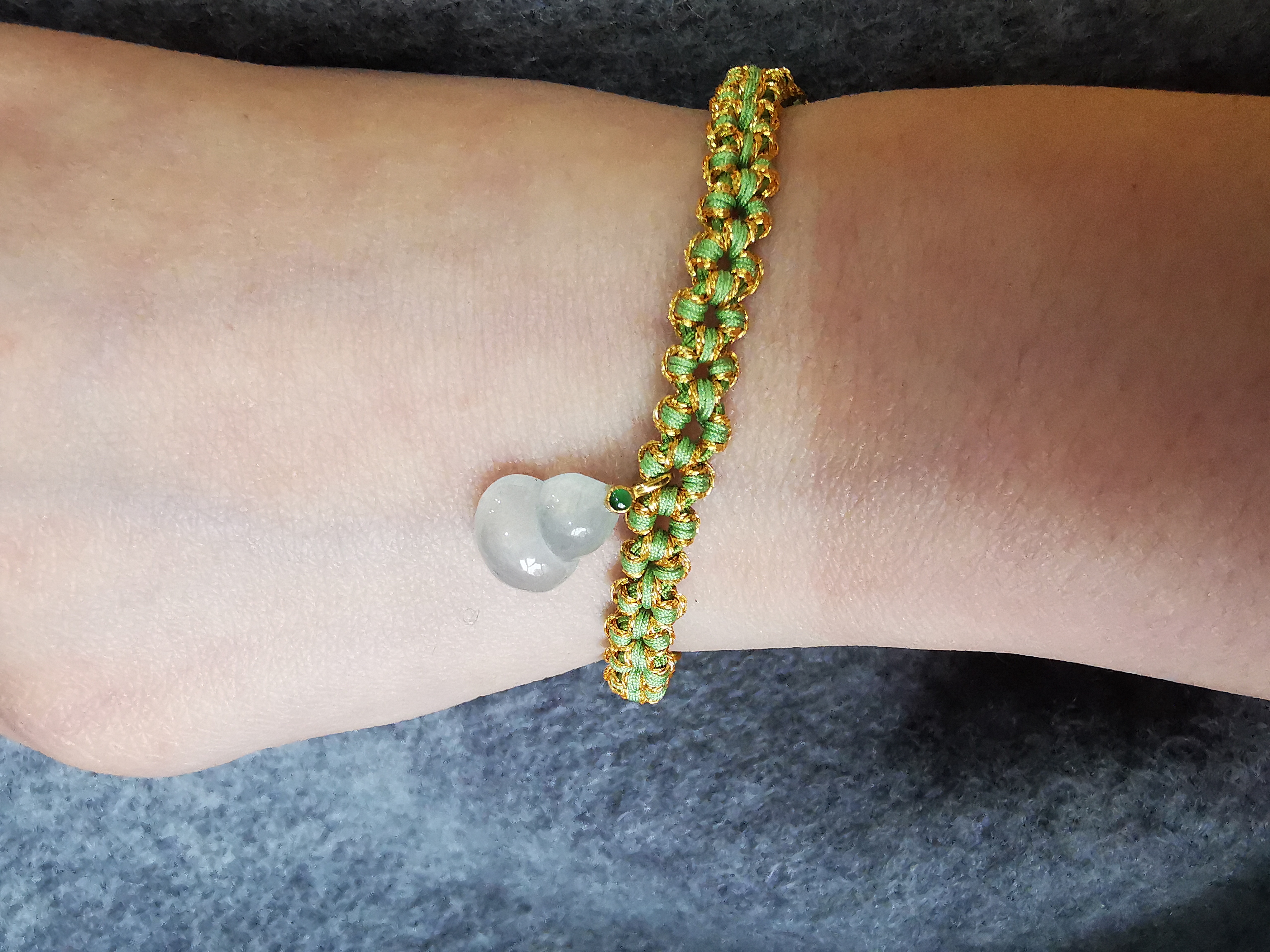 精选冰糯种飘翠翡翠小葫芦,18K金扣头,纯手工精心编织中国结双色桃花。最大手围17cm。
