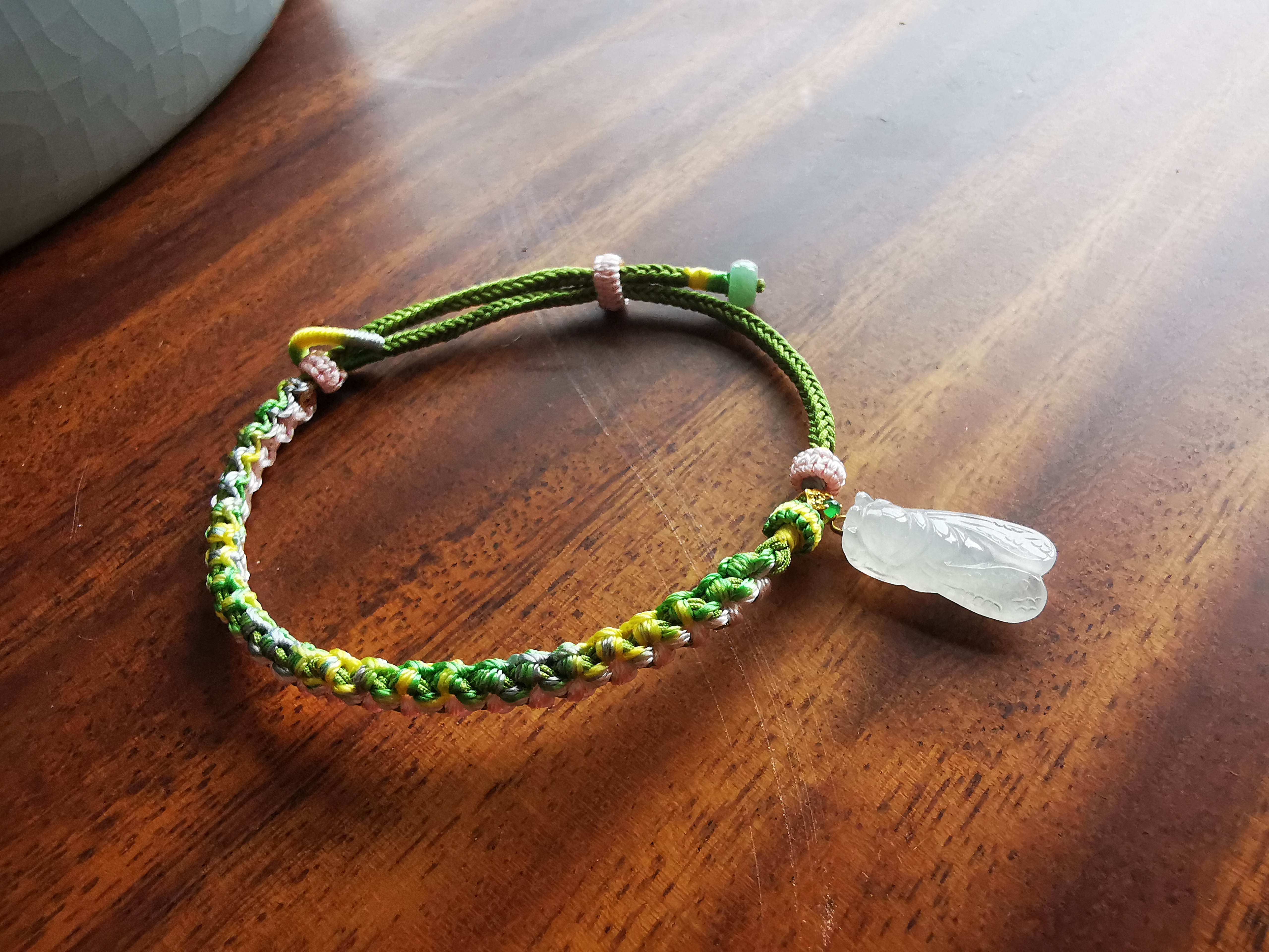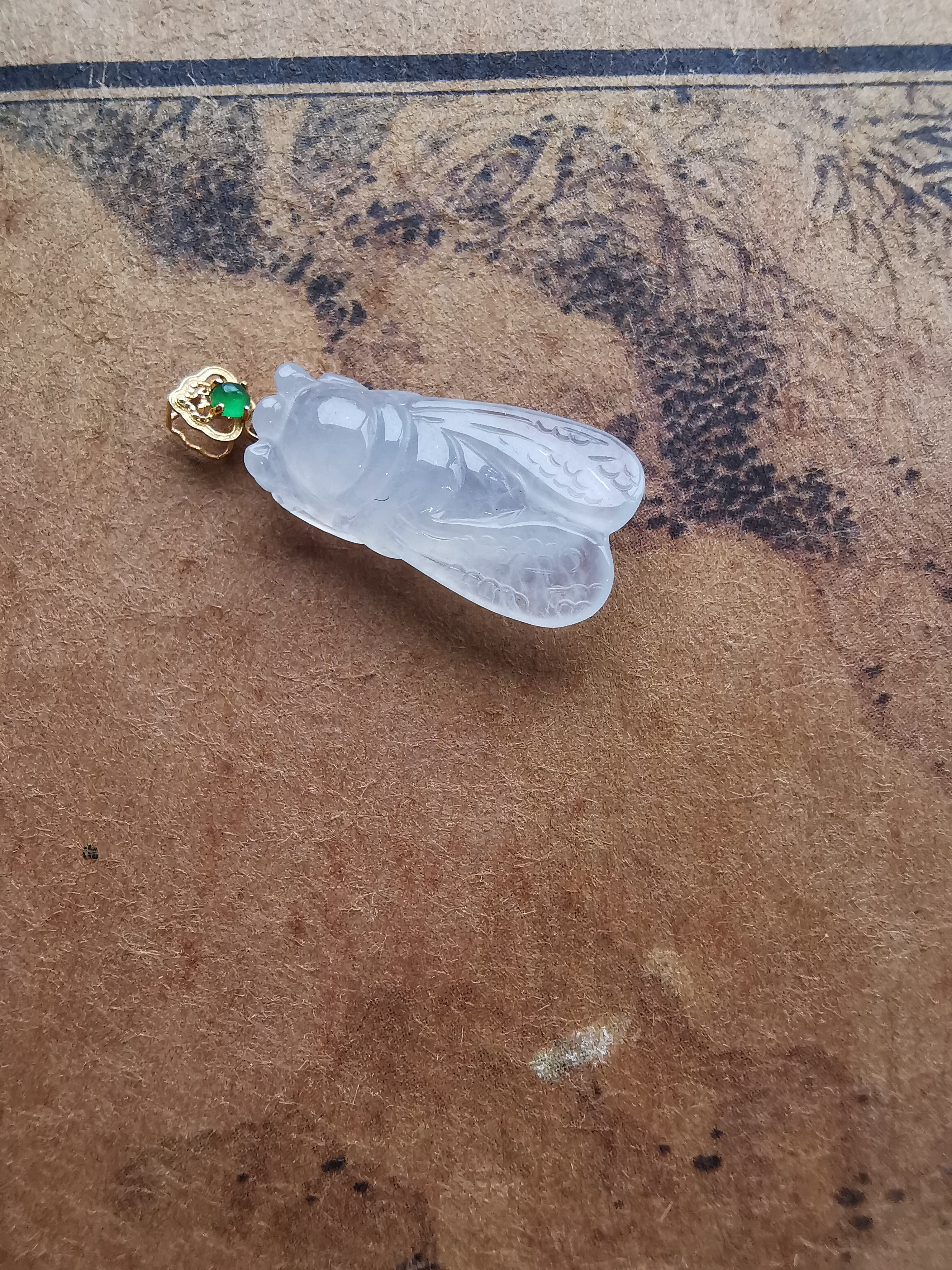 精选高冰翡翠金蝉一只,18k金镶嵌扣头,纯手工精心编织中国结粉绿双色桃花。