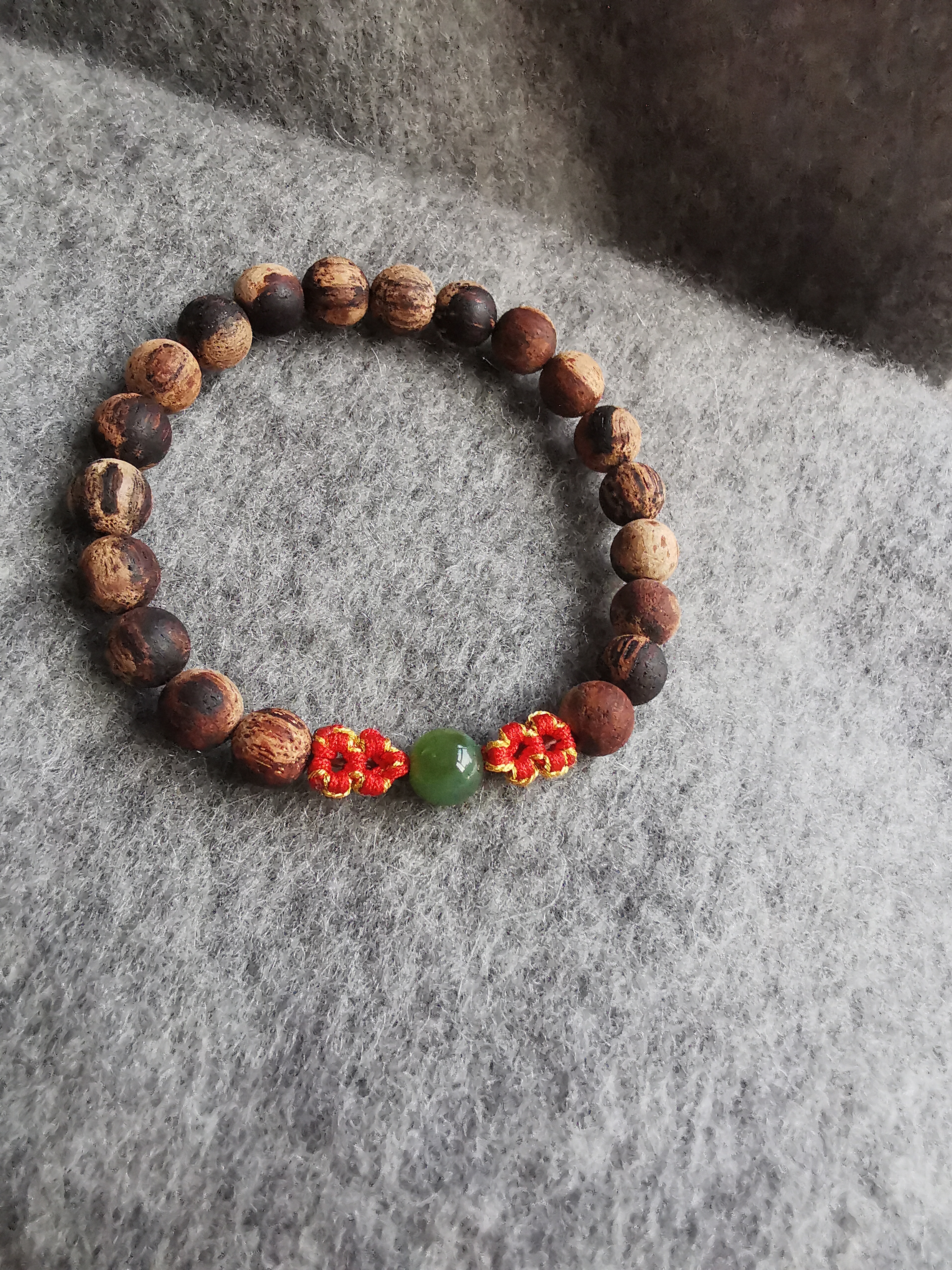 精选约8mm降真香珠子20颗,约8mm碧玉珠子一颗。纯手工精心编织中国结结桃花。适合手围17cm内。