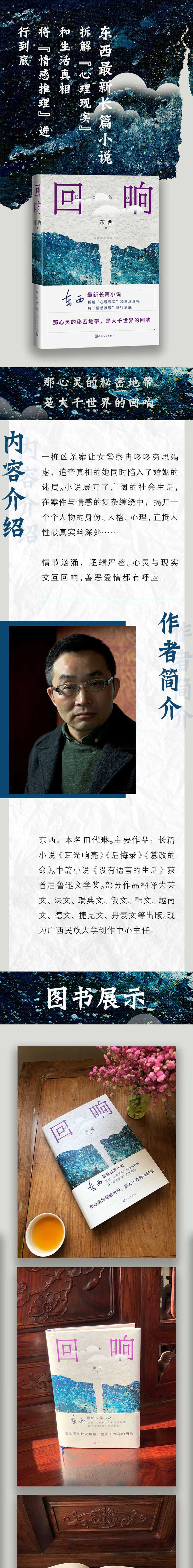 东西的长篇新作《回响》藉助案件侦破推理小说模式,通过对当代人隐秘而复杂心理的追溯和探寻,对生活世界和心灵世界进行了深入透视和繁复立体的表现。小说提供了一个进入现实的独特路径和特别视角,艺术地对“现代性”社会中的“自我”和“生活”的隐秘真相进行了深刻追问,挖掘和呈现了无限的可能性。