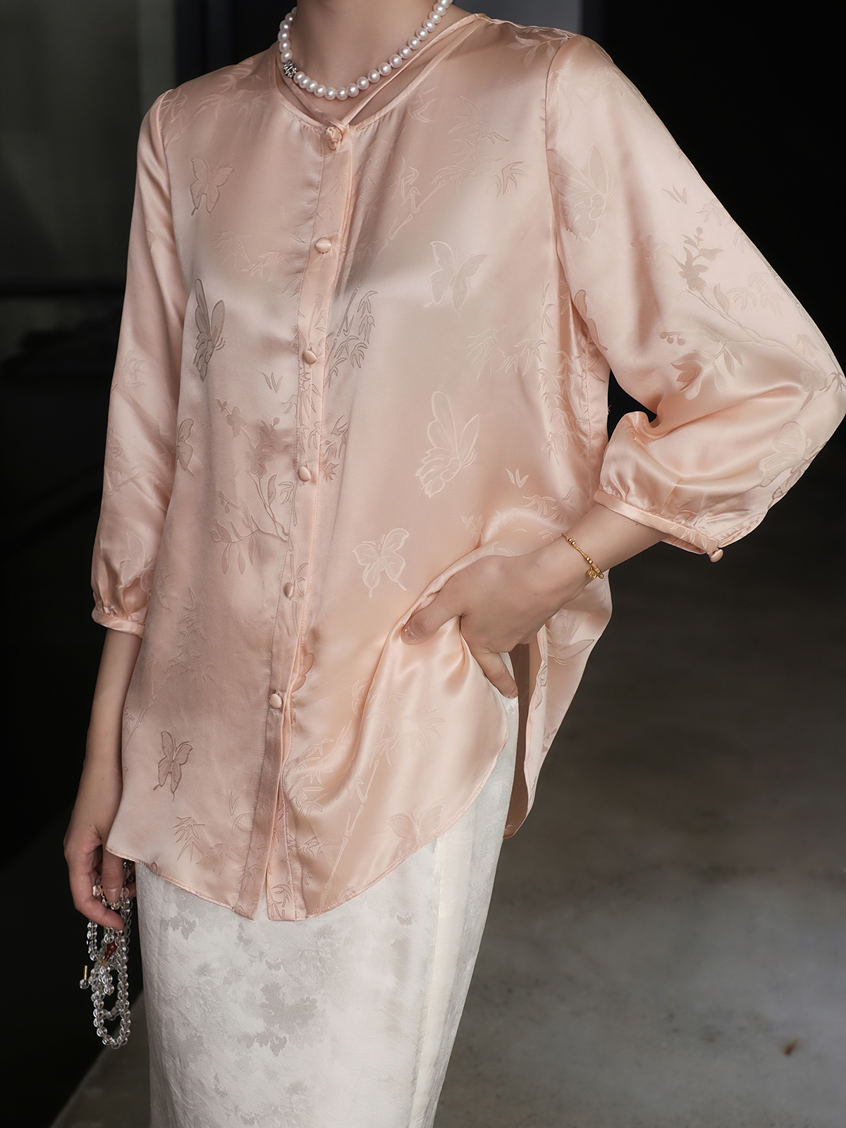 盛唐婧 |提花真丝缎七分袖气质上衣-粉色
