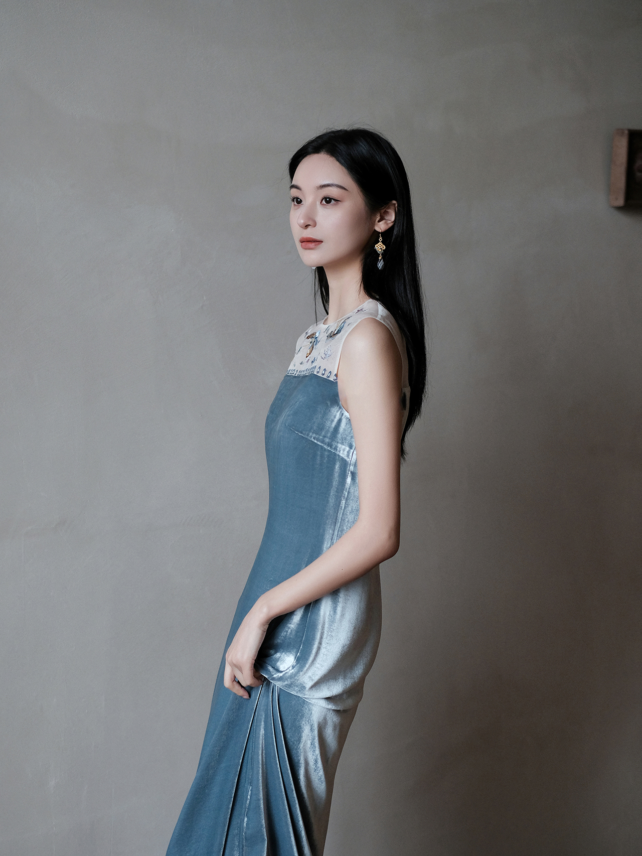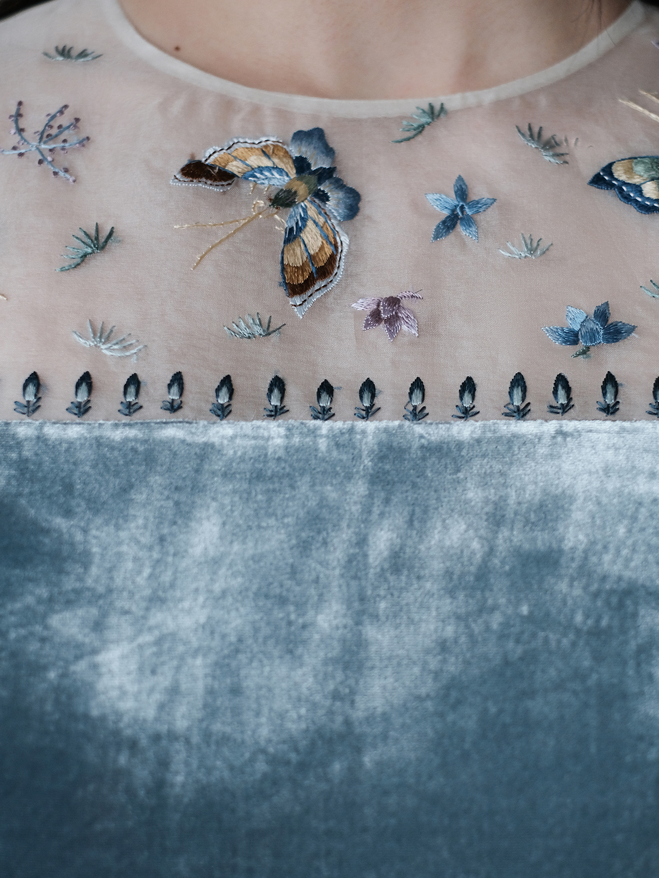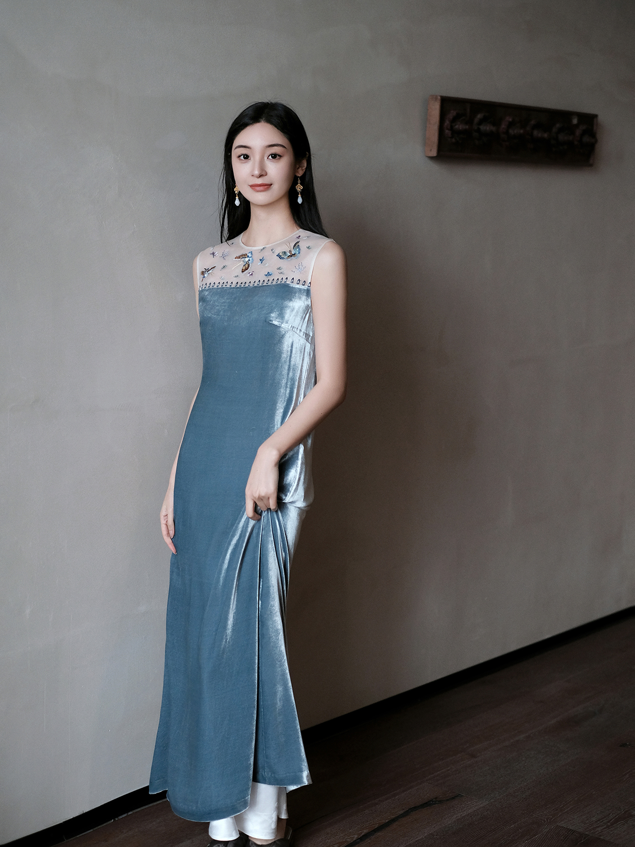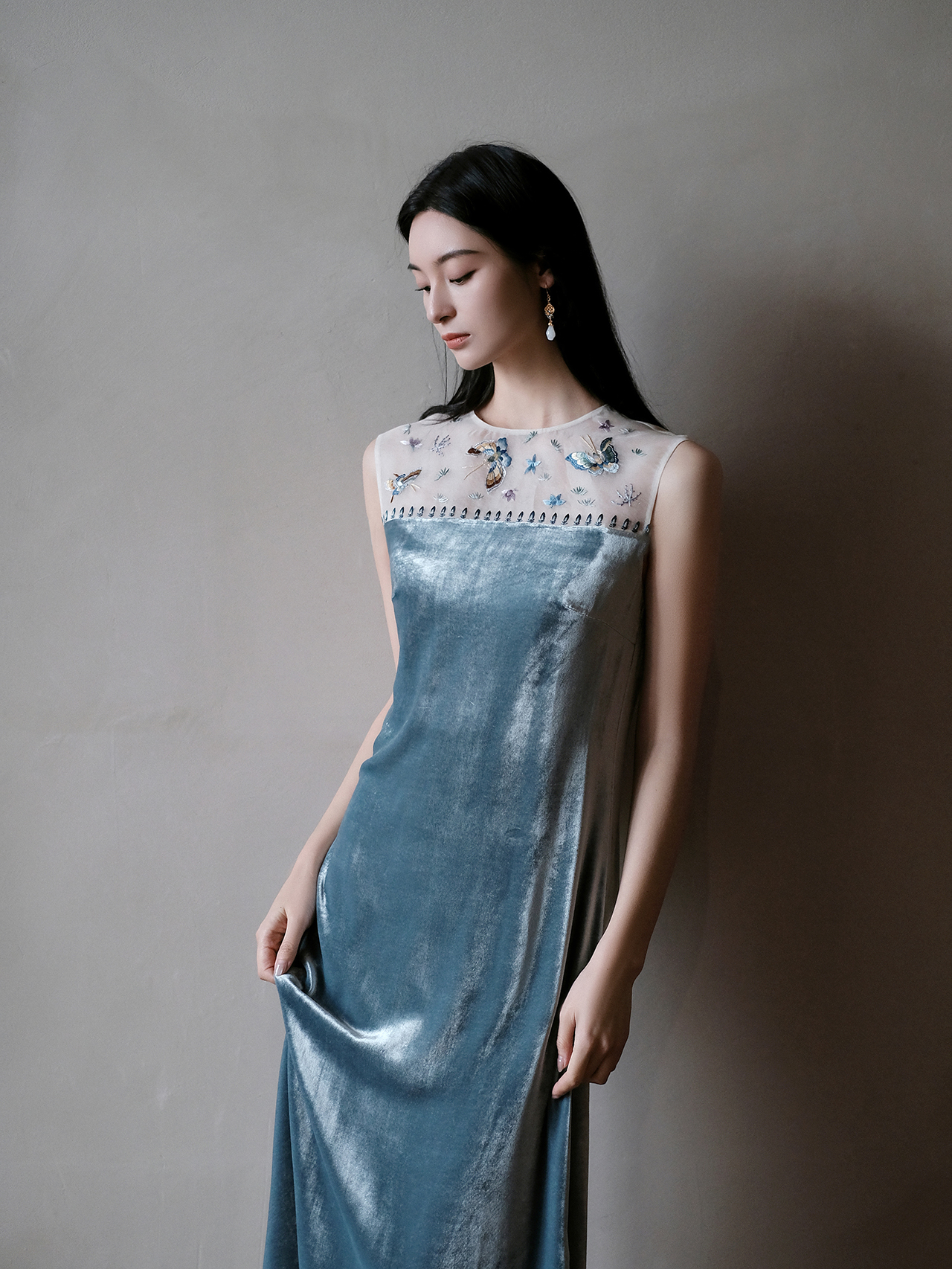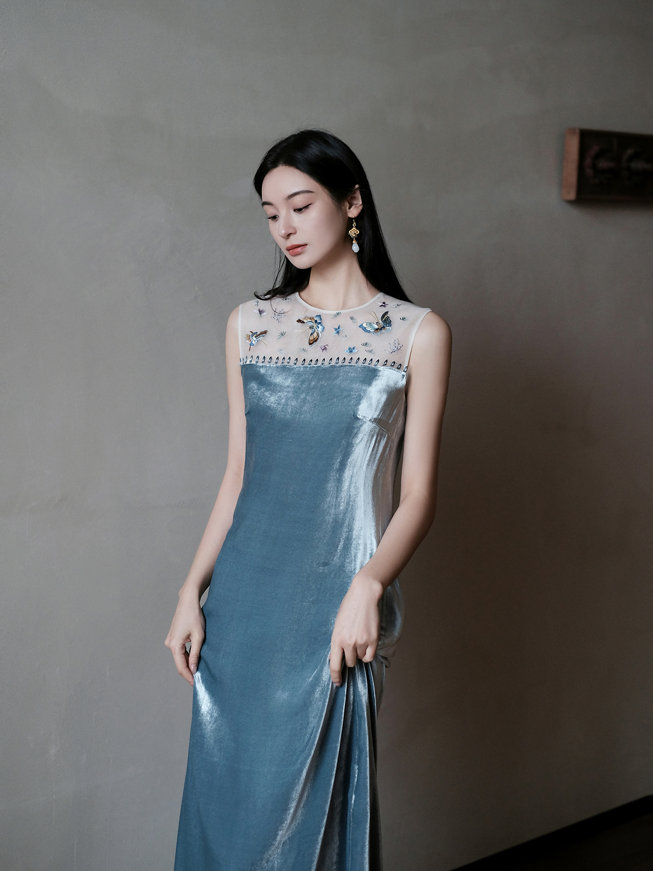 盛唐牡丹盛奢系列| 蝴蝶翩翩手绣丝绒连衣裙