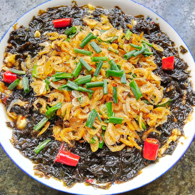5、虾米炒至微微金黄色即可,撒上葱花。
