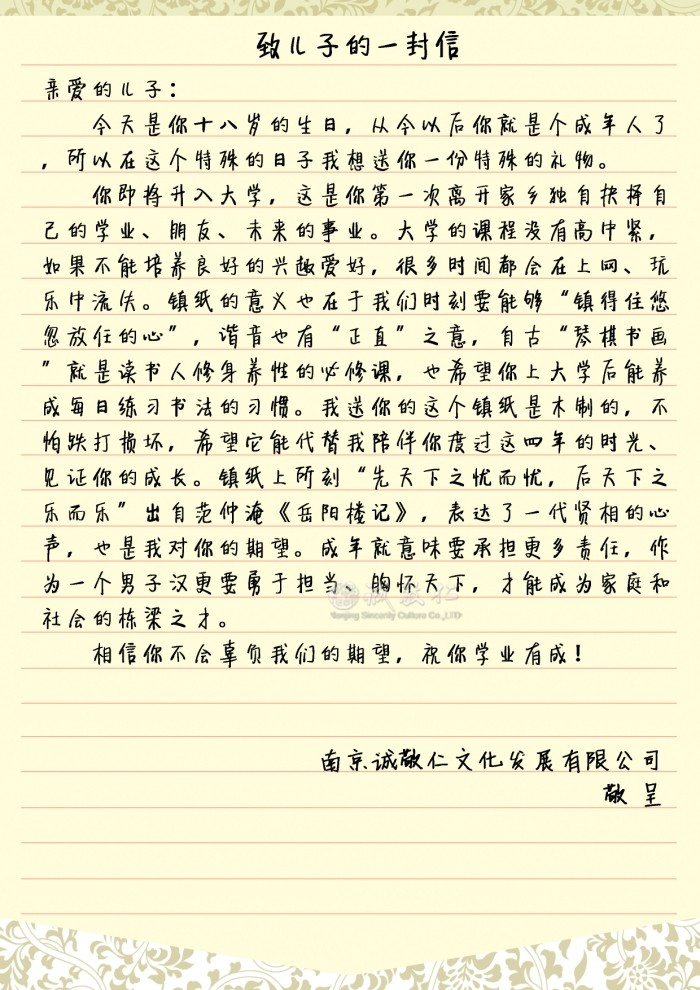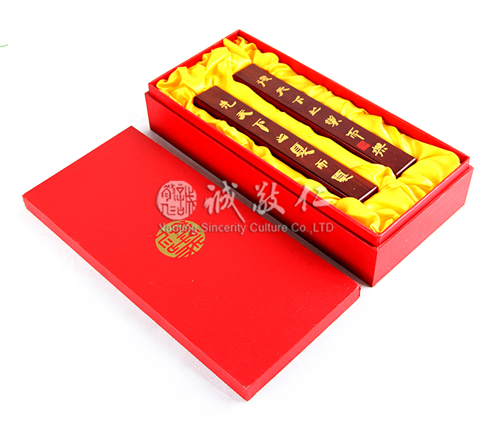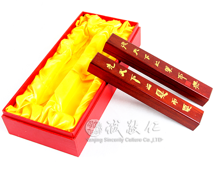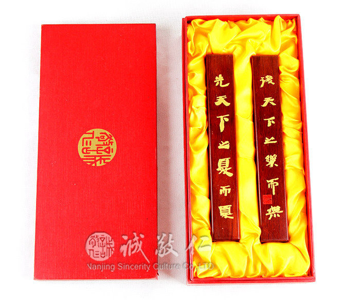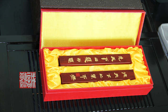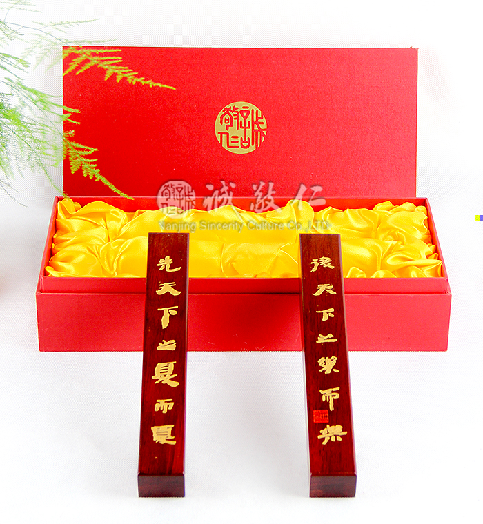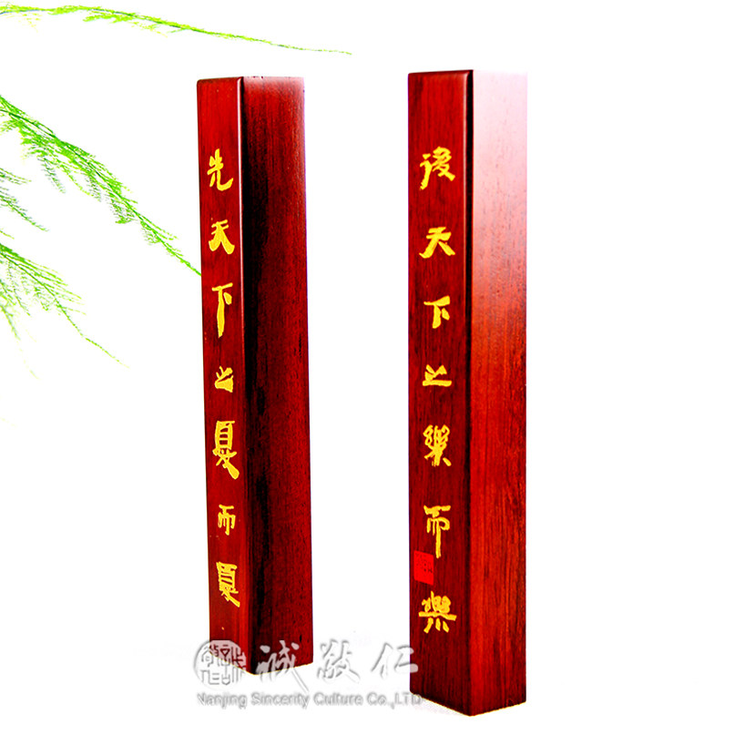 【基本信息】: 单根镇纸规格:24cm*3.5cm*3cm 包装:如图硬盒包装 【文化内容】: 先天下之忧而忧,后天下之乐而乐 “先天下之忧而忧,忧得其所;后天下之乐而乐,乐在其中"出自宋·范仲淹《岳阳楼记》,原句为:其必曰“先天下之忧而忧,后天下之乐而乐” 【白话易解】: 把国家、民族的利益摆在首位,为祖国的前途、命运担忧分愁,为天底下的人民幸福出汗流血。体现了一种为天下人谋福利,吃苦在前,享受在后的精神和忧国忧民,先人后己的高尚品格,闪耀着朴素的大公无私的思想光辉。 【材质介绍】: 巴西花梨以其纹理漂亮,板材宽且顺直,木质硬,适合雕刻,在广式家具中使用较多。用该材料做的大柜或者写字台等独板、独面比较多,深受 人们的喜欢。 巴西花梨生长于热带南美洲,属豆科植物。其木纹有若鬼面者,类似于黄花梨,所以被称为“巴西花梨”。其木质坚实,色彩鲜艳,纹理或 隐或现,不静不喧,质地温润,清晰美丽,木结花纹圆晕如钱。在漆饰后的弦面或近弦面上木射线明显,弦切面木射线斑纹亦明显。给人以文静、 柔和的感觉。可做家具及文房诸器。 该木材的物理性质:气干密度约为0.80-0.86g/cm3,木材具光泽,无特殊气味和滋味,纹理斜至交错,结构细而均匀。木材重,强度高。很少有 白蚁危害。 该木材为散孔材。心边材区别明显,心材黄褐至红褐色,边材白色至浅黄白色。生长轮略明显。管孔在放大镜下明晰,略小至中,单独及少数短径列复管孔(2—4个),管孔内常含深色沉积物,散生。轴向薄壁组织在放大镜下明晰,主为傍管状、翼状、聚翼状及轮界状。木射线非叠生,在放大镜下明晰,中至略密,甚细至略细。纹理直,常交错,结构细、均匀,干缩性大、握钉力良好,干燥略快,不易开裂、翘曲。综合评价优 于缅甸花梨。 愿我们养成学习圣贤文化和各项专业知识的好习惯,当您在看书或写毛笔字时,用此镇纸将方便您的阅读和书写,并同时提醒我们要勤奋学习。愿这款镇纸伴随您的成长,成为一个对国家、对社会卓有贡献的人! |