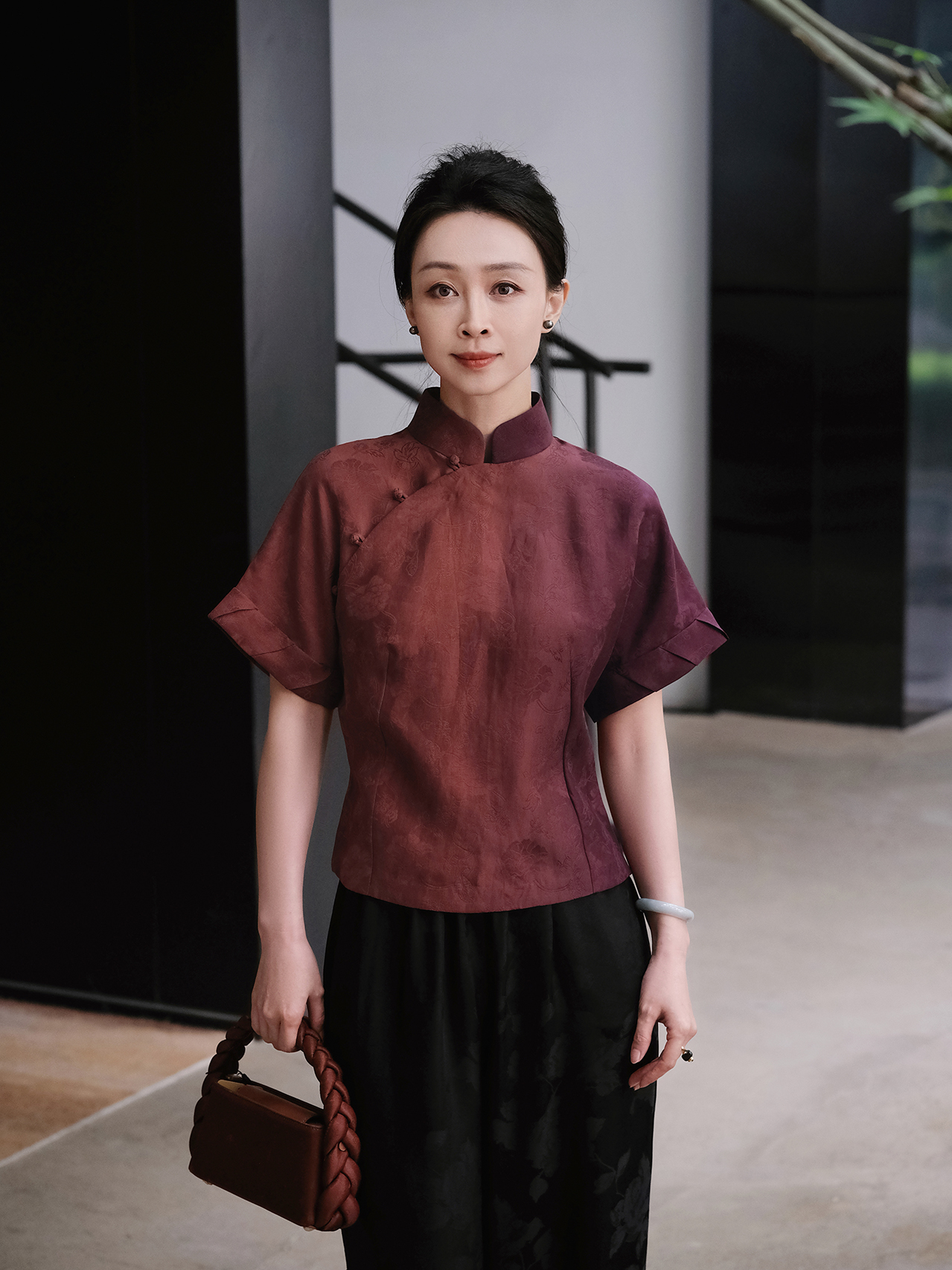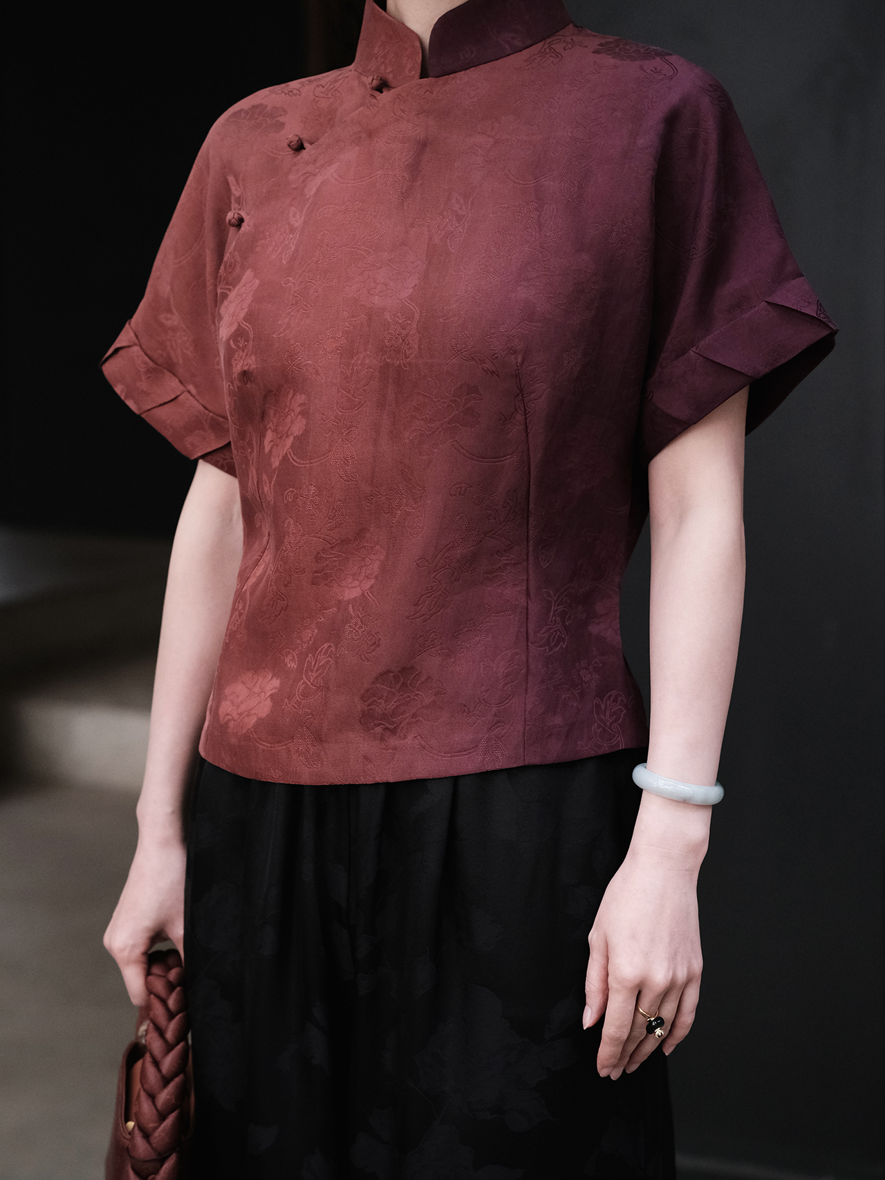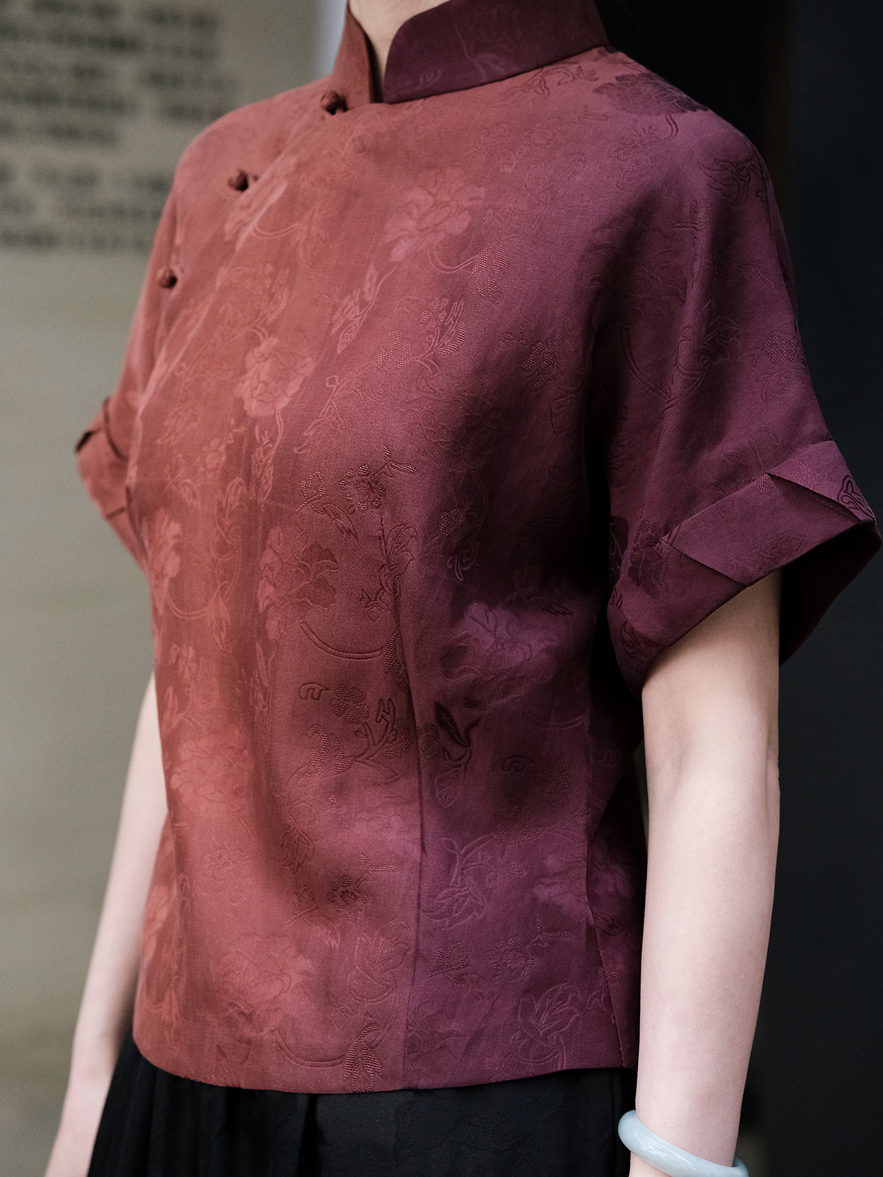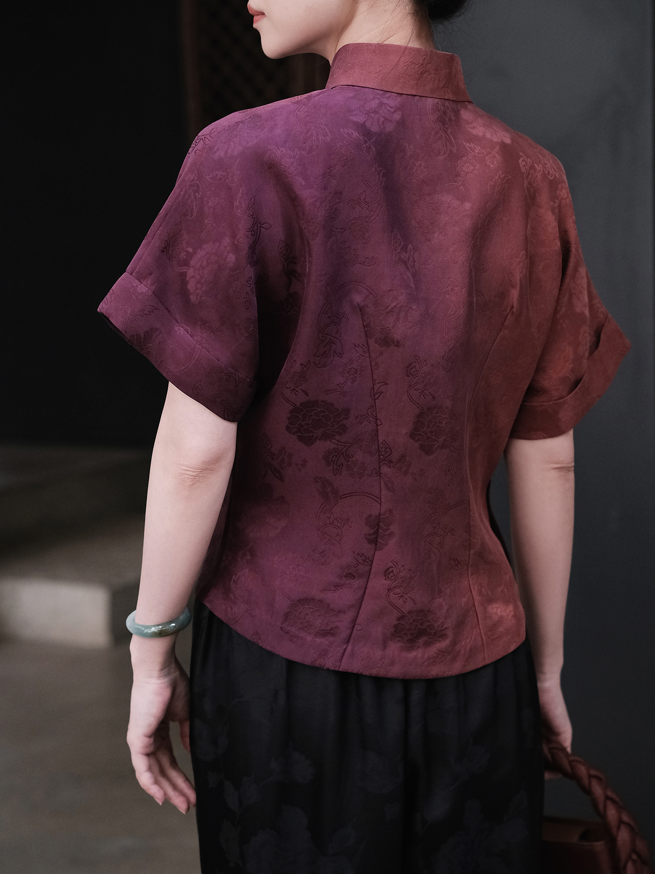 盛唐牡丹| 渐变色香云纱提花偏襟短袖上衣