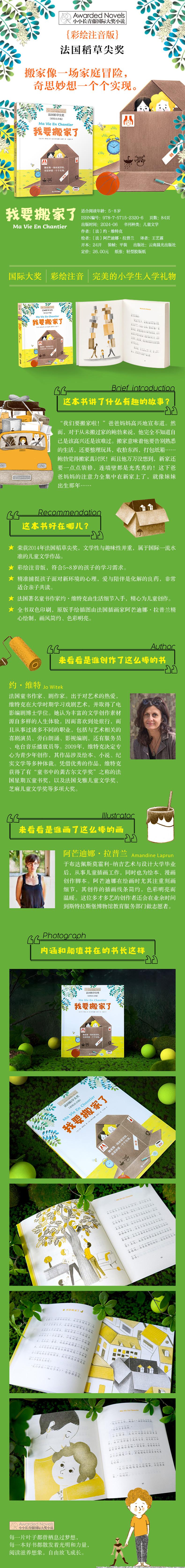 ★大奖之作,有品质的儿童文学:《我要搬家了》荣获2014年法国稻草尖奖,文学性与趣味性并重,属于不错水准的儿童文学作品。★彩绘注音版,满足“识字拼音相辅相成”的学习需求:全书彩绘、注音,符合5~8岁的孩子的学习需求。国际大奖小说保证了故事的经典性与可读性,能够让孩子在上学之初即与世界孩子站在同一起跑线上。★精准捕捉孩子面对新环境的心理,亲子共读佳作:搬家在孩子眼里意味着要去适应未知的新环境,《我要搬家了》精准地捕捉到了孩子面对变动和未知时既期待又担忧的矛盾心理,展现了孩子在家长的爱与陪伴下收获成长的过程,非常适合亲子共读。★国际知名作家由生活细节入手,精心创作:作者约·维特克是法国著名童书作家、剧作家,曾荣获多项文学大奖,包括有“童书中的龚古尔文学奖”之称的法国星期五童书奖、法国戈雅儿童文学奖、芝麻儿童文学奖等。★图文并茂,丰富阅读体验:全书采用双色印刷,原版手绘插图由法国插画家阿芒迪娜·拉普兰精心绘制,画风简约、色彩明亮,与故事内容相得益彰。