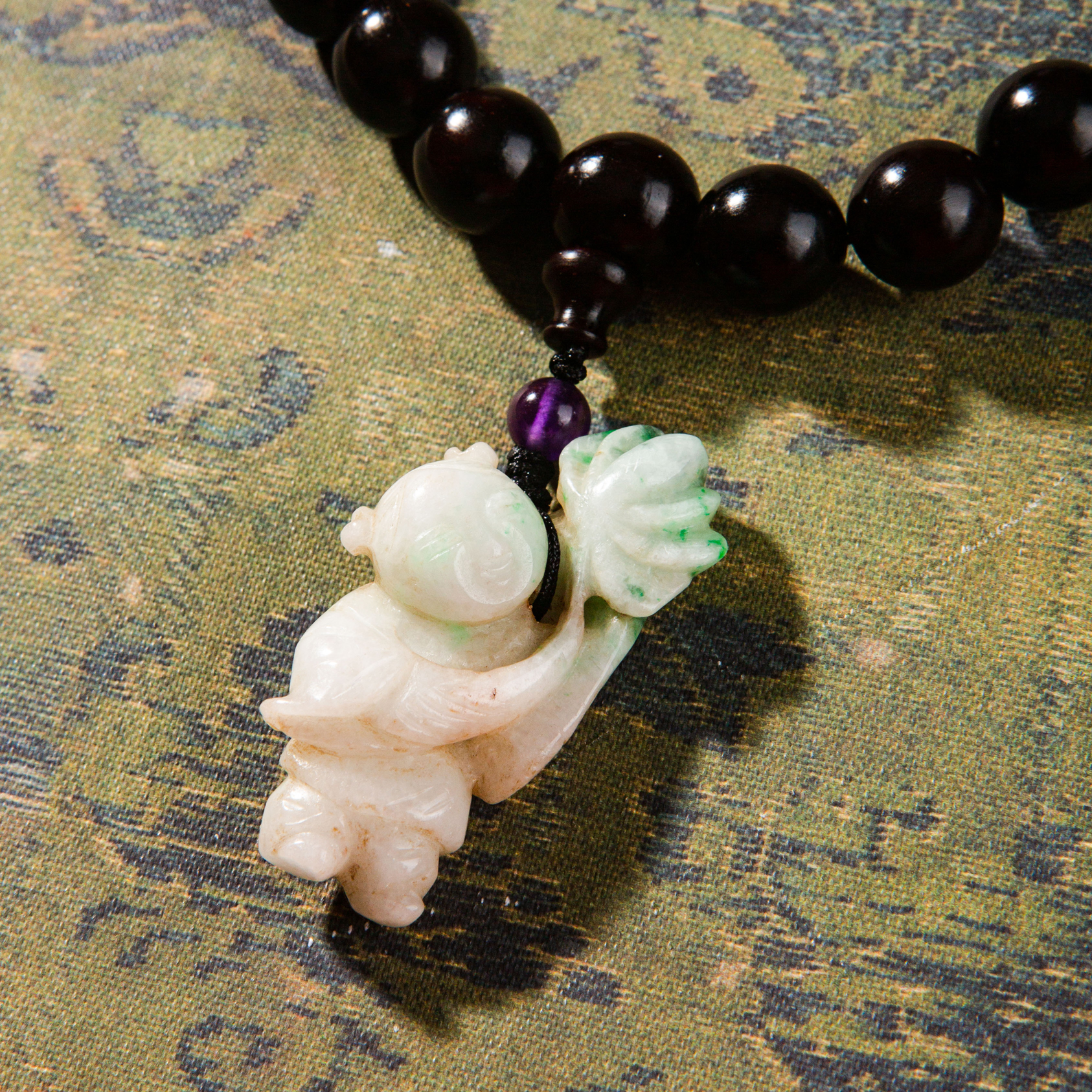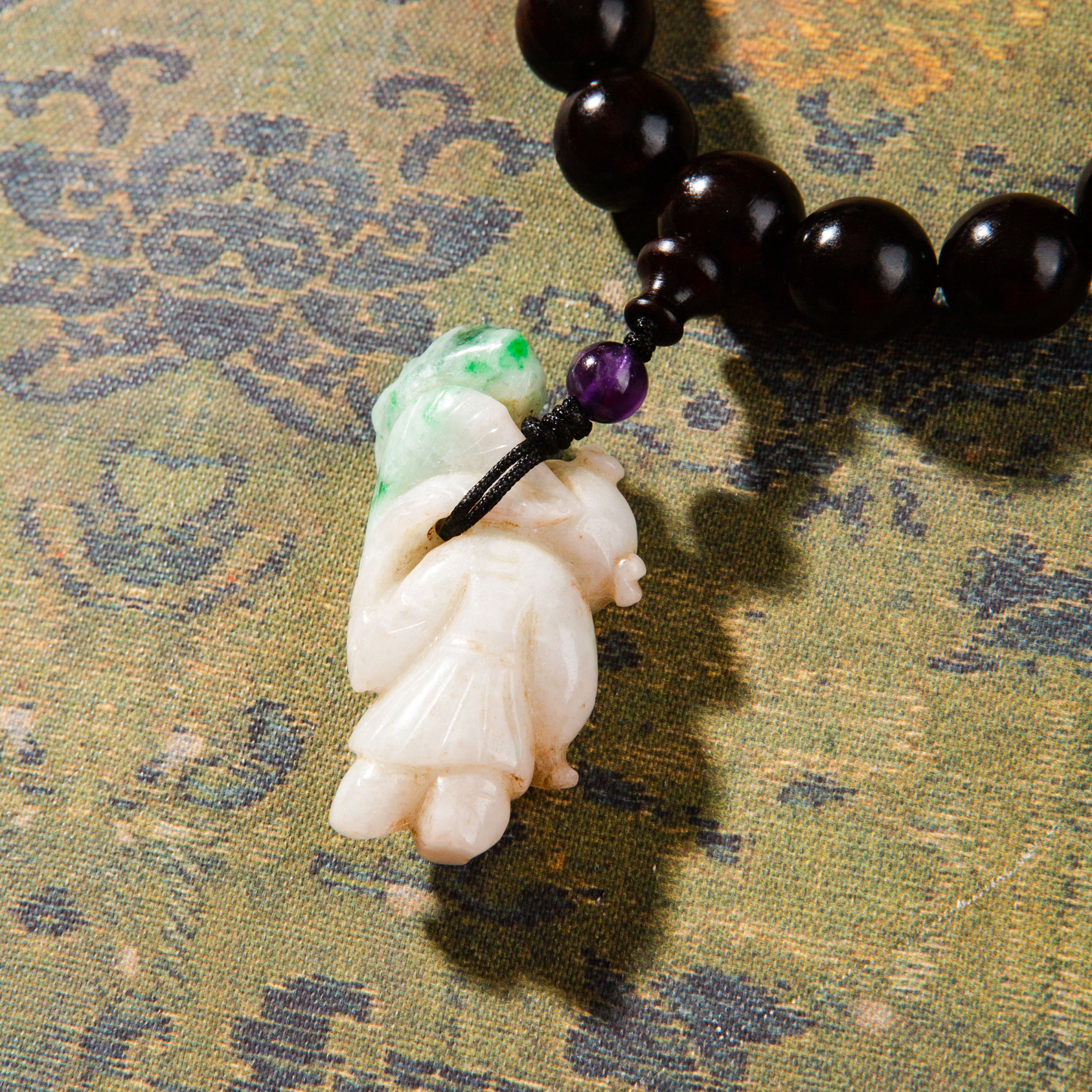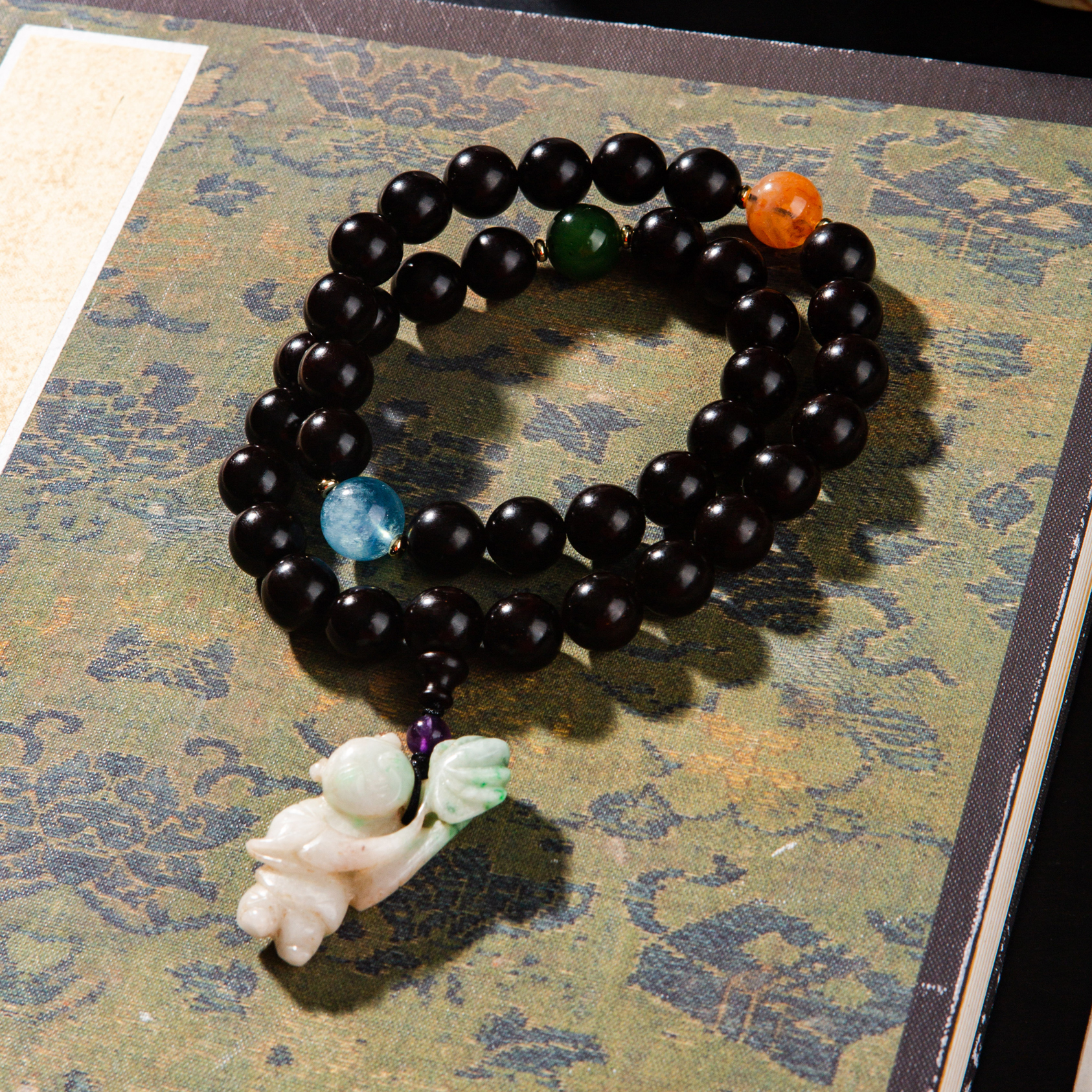 清代紫檀家具老料制手持,百年紫檀老料气息沉稳、油性大、密度高,气息古朴沉稳,手工制珠精细至极,并配有老翡翠、海蓝宝、碧玉、雪花幽灵、紫水晶珍稀材质,整体呈现雍容华贵而又古朴沉稳之气息,是难得的文人清玩之物。
