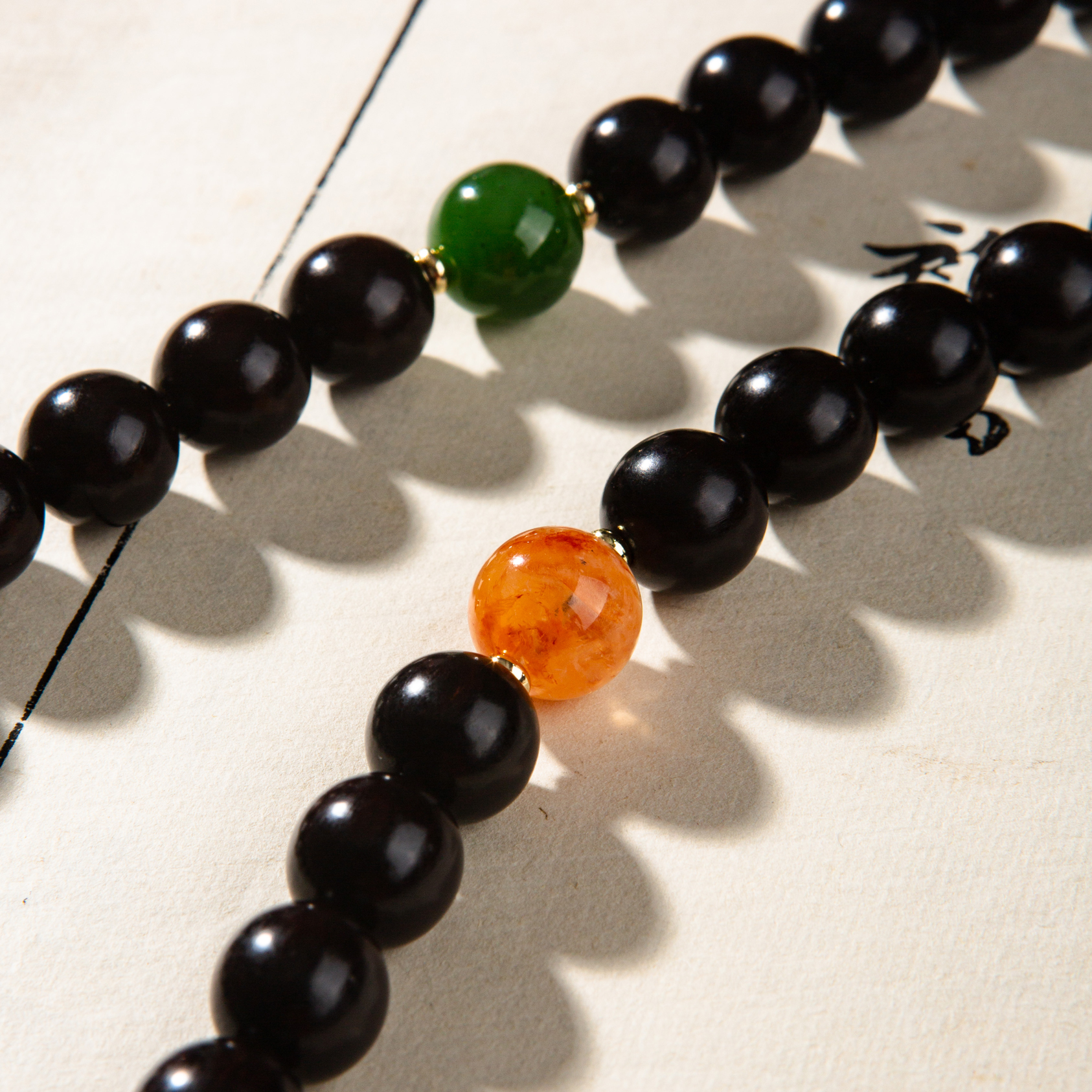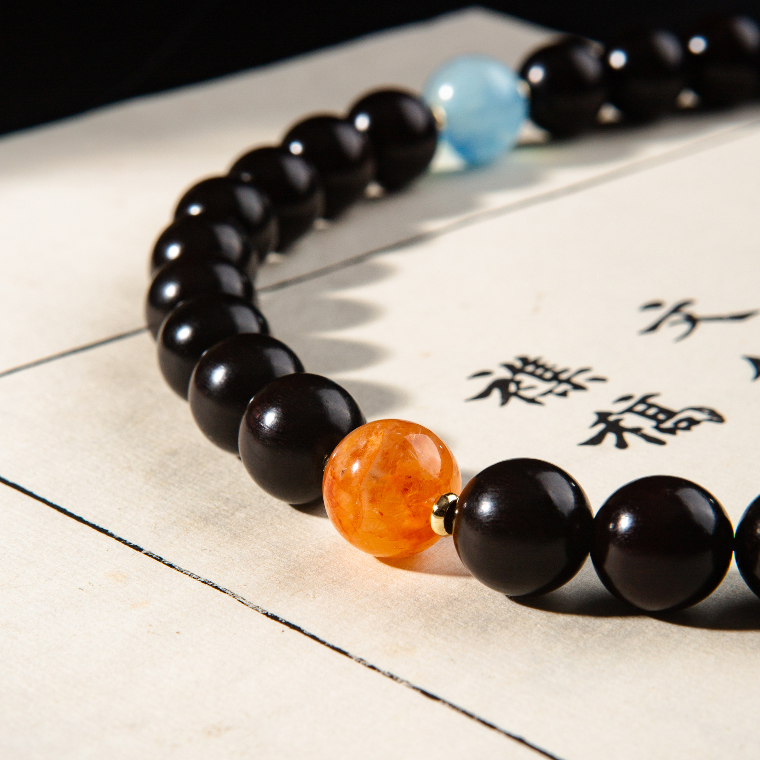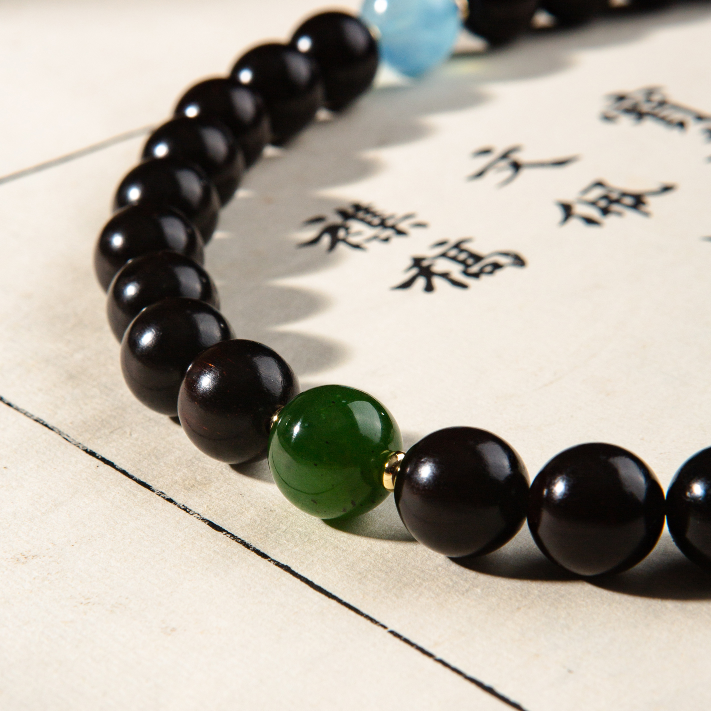 清代紫檀家具老料制手持,百年紫檀老料气息沉稳、油性大、密度高,气息古朴沉稳,手工制珠精细至极,并配有老翡翠、海蓝宝、碧玉、雪花幽灵、紫水晶珍稀材质,整体呈现雍容华贵而又古朴沉稳之气息,是难得的文人清玩之物。