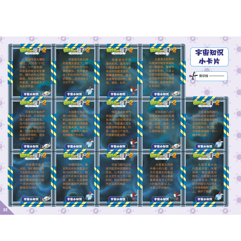 内容推荐:《植物大战僵尸2奇妙时空之旅酷手工·未来世界漫游记》利用风靡全球的电脑游戏“植物大战僵尸2”中的素材,设计制作。小读者可用附赠的剪刀和双面胶制作3个立体的植物形象,3个立体的僵尸形象,2个未来世界场景,1款宇宙栅栏电影和14张正面为考眼力游戏反面为太空知识的卡牌,让小读者:《植物大战僵尸2奇妙时空之旅酷手工·未来世界漫游记》利用风靡全球的电脑游戏“植物大战僵尸2”中的素材,设计制作。小读者可用附赠的剪刀和双面胶制作3个立体的植物形象,3个立体的僵尸形象,2个未来世界场景,1款宇宙栅栏电影和14张正面为考眼力游戏反面为太空知识的卡牌,让小读者在未来世界尽情漫游。