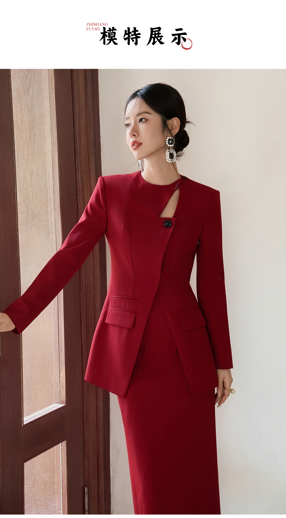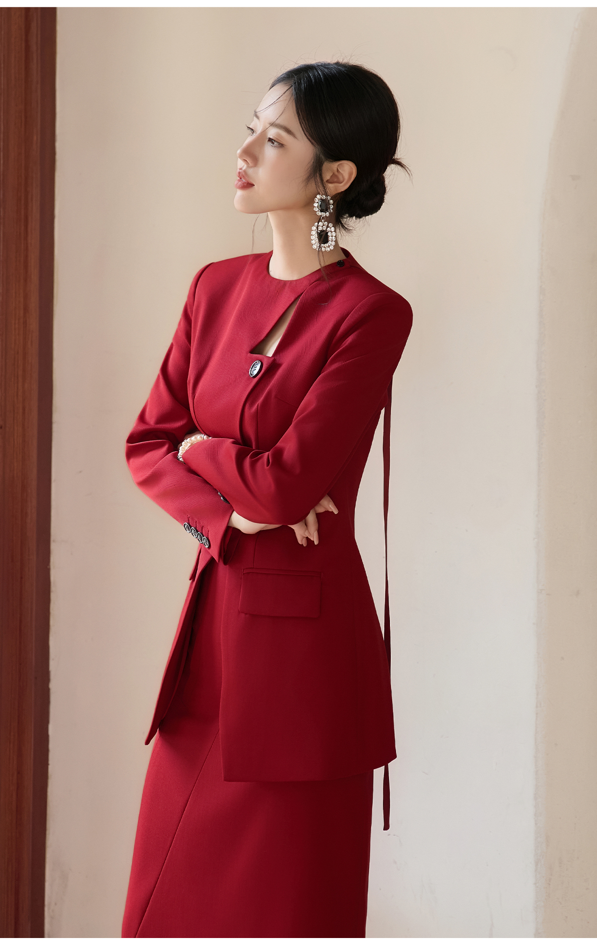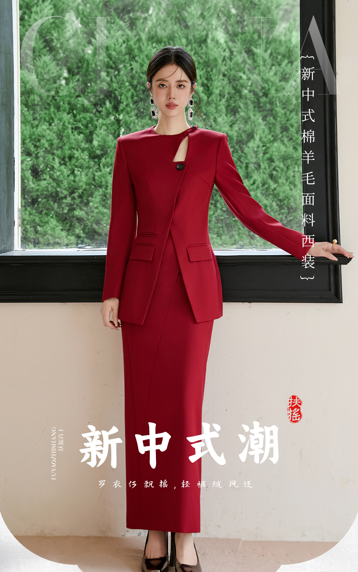 FUYAO扶摇 羊毛西装外套女红色国风设计感西服镂空领中长款上衣冬
