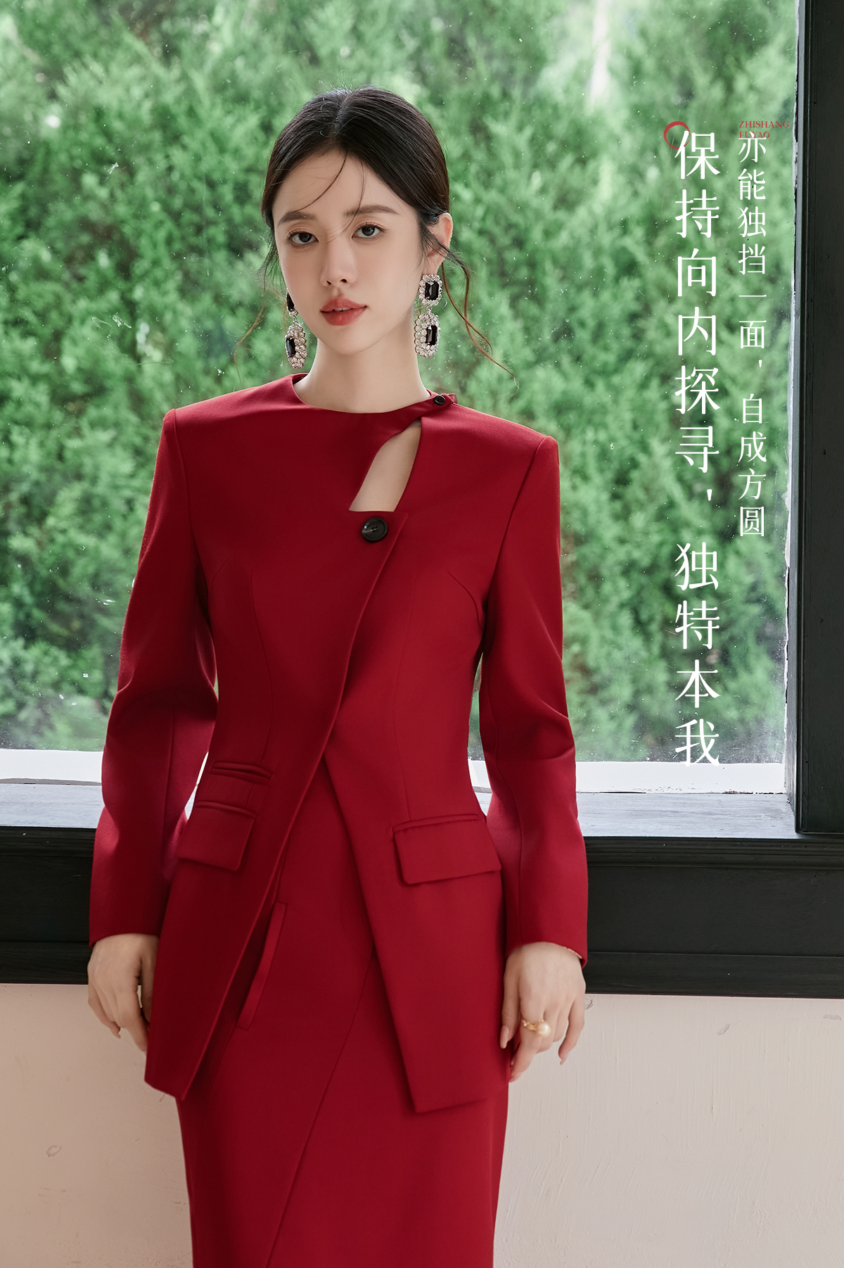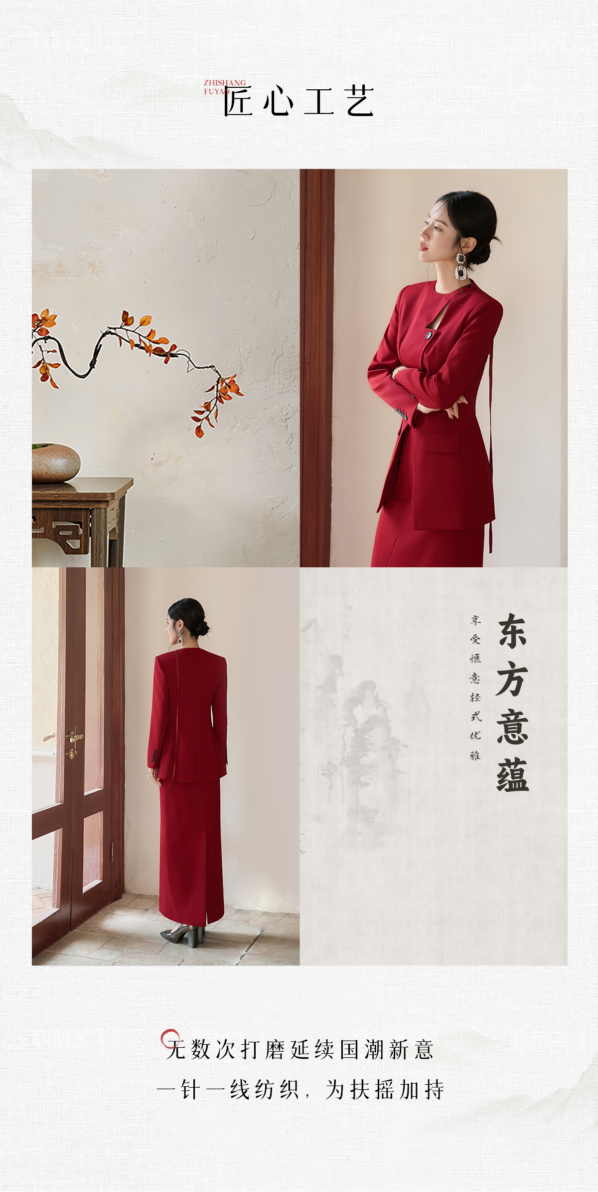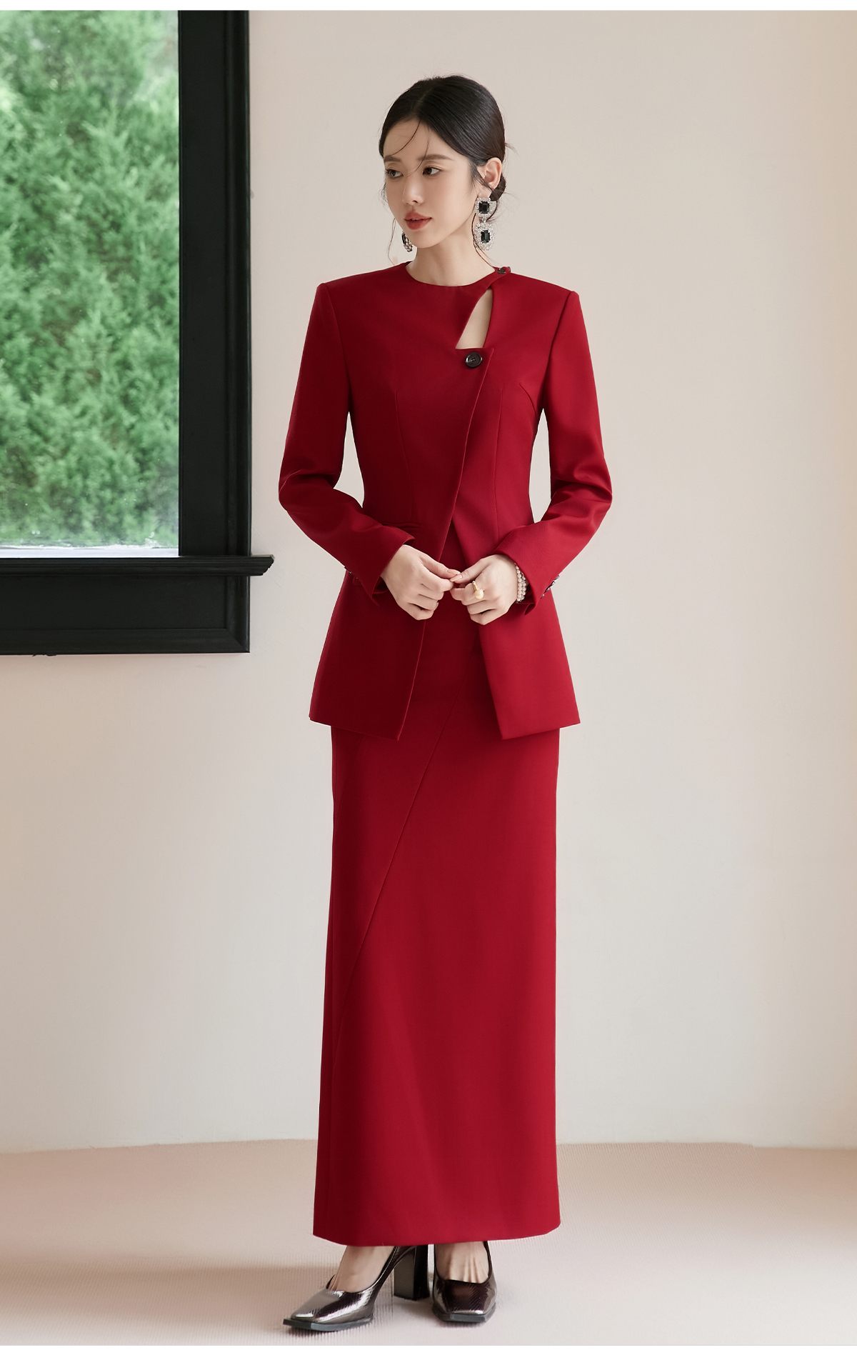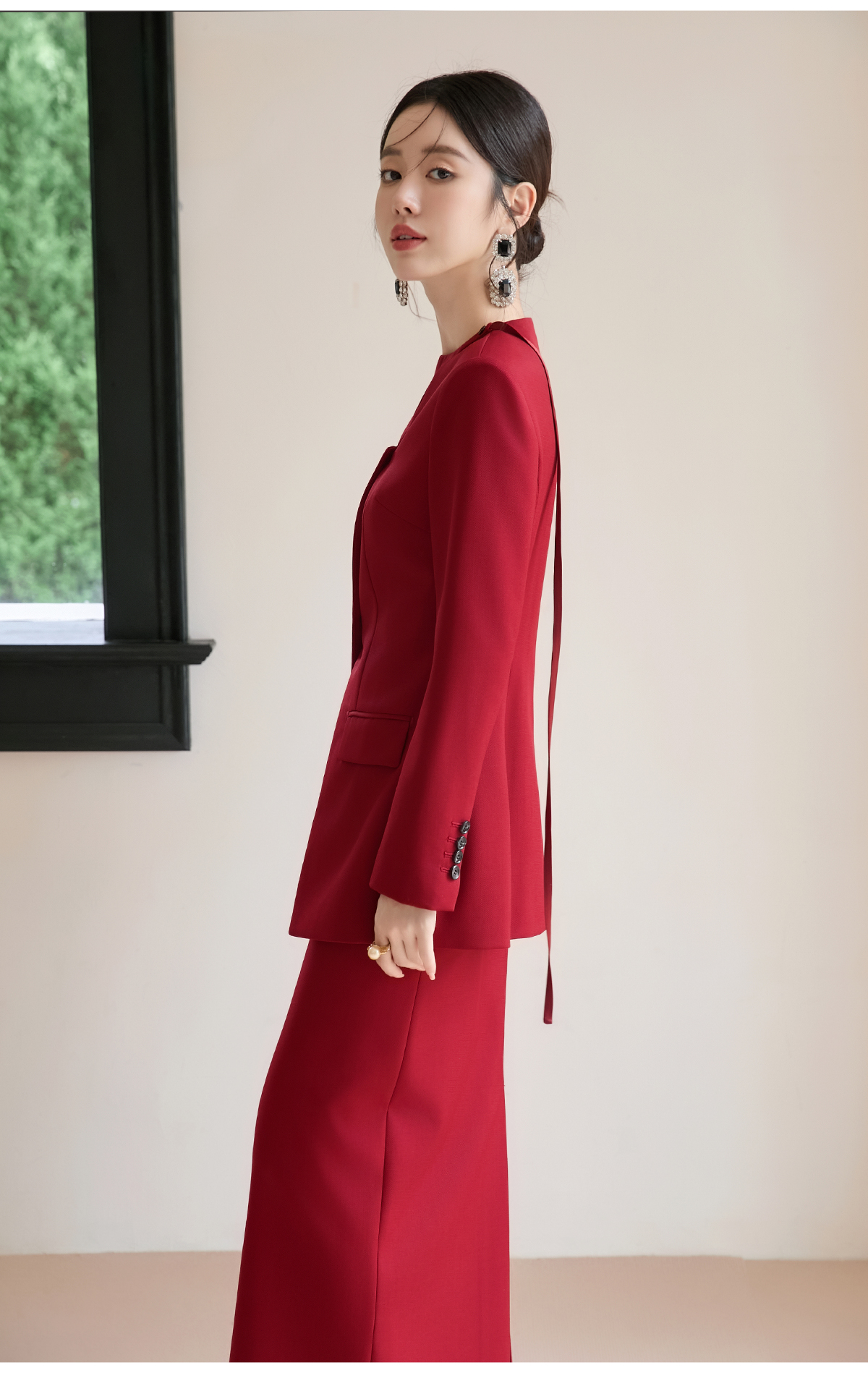 FUYAO扶摇 羊毛西装外套女红色国风设计感西服镂空领中长款上衣冬