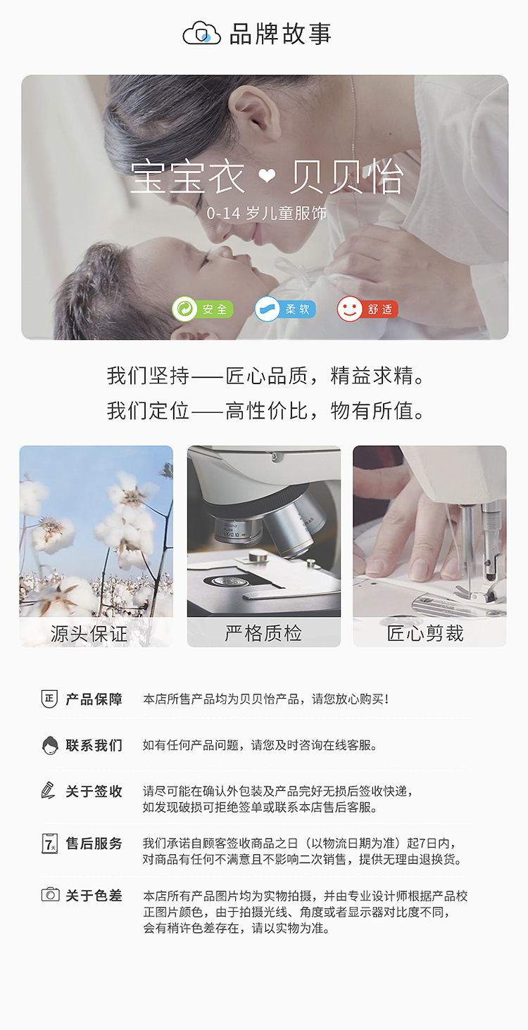 - 贝贝怡专注0-6岁婴幼儿服饰,坚持安全、柔软、舒适的产品理念,为千万中国家庭提供超高品质、安全可靠的婴幼儿服饰产品,妈妈放心,宝宝开心!