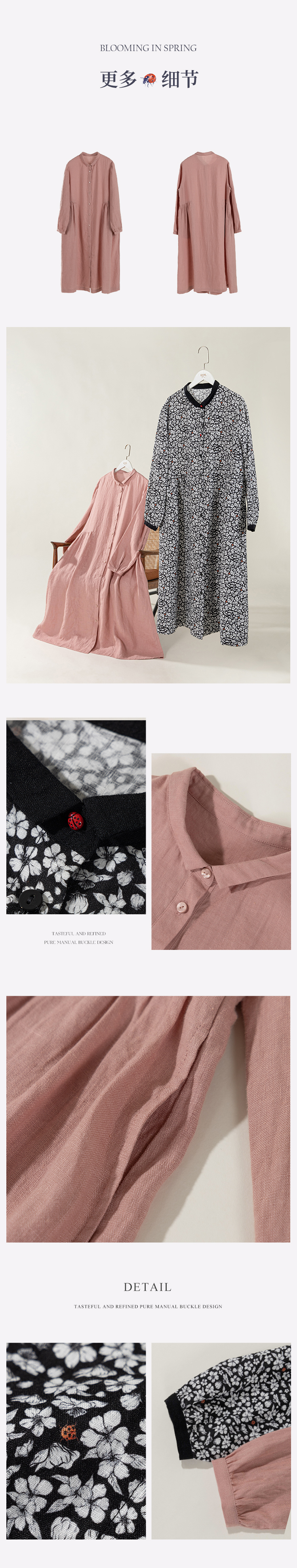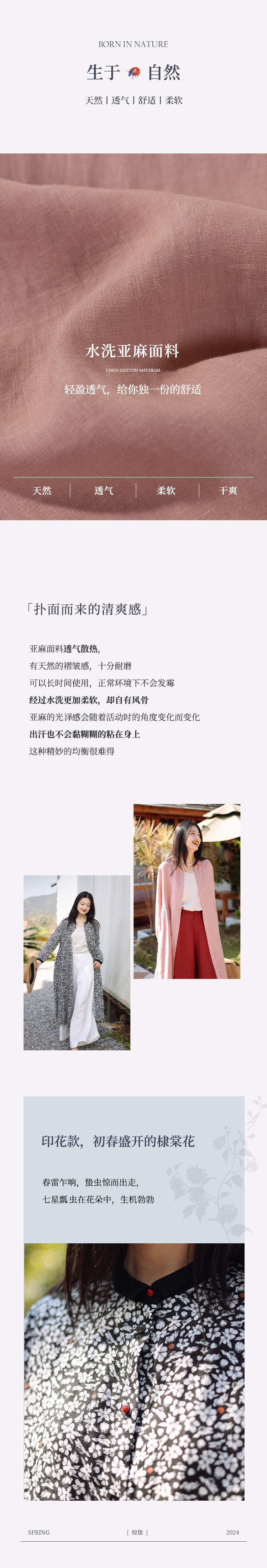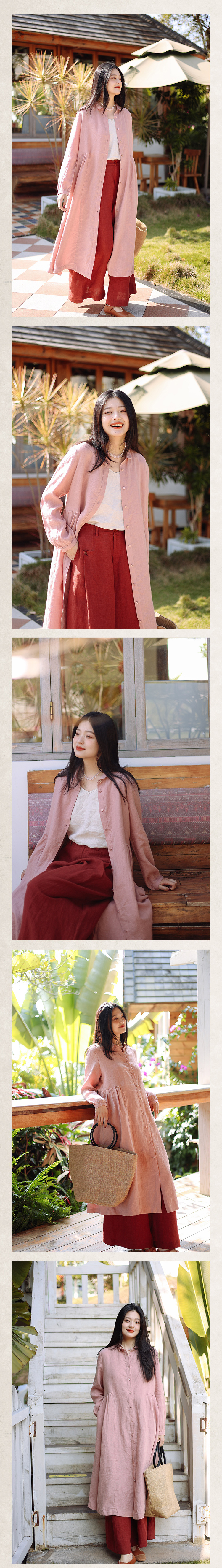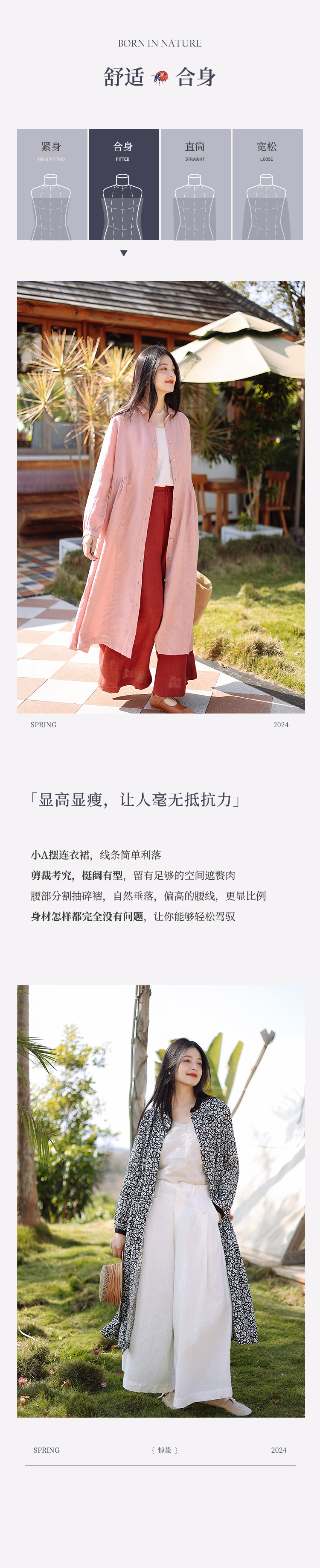 绽放098朵/桃夭两穿风衣连衣裙高端砂洗亚麻翻领显瘦长袖棉麻裙子