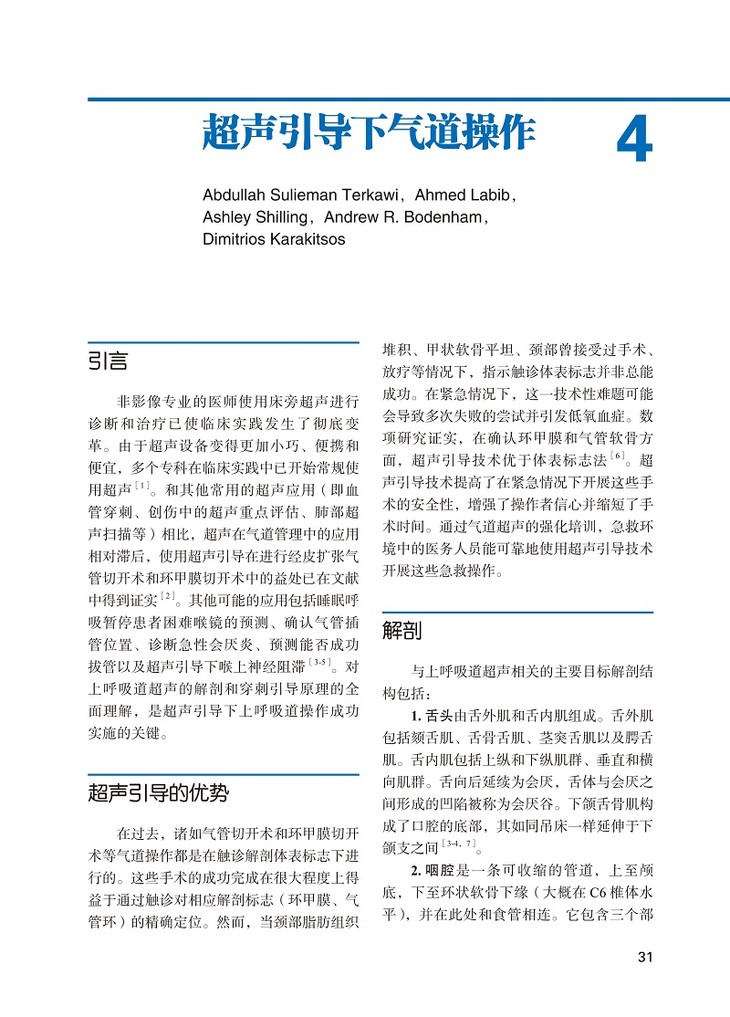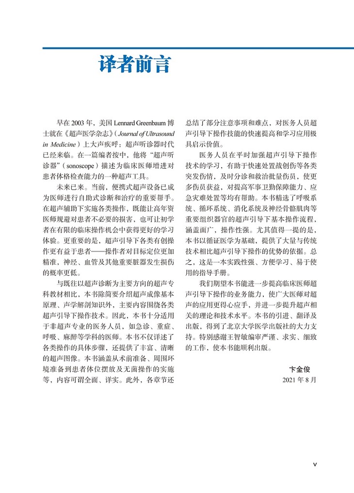本书精选了呼吸系统、循环系统、消化系统及神经骨骼肌肉等重要组织器官的超声引导下基本操作流程,涵盖面广,操作性强。本书除简要介绍超声成像基本原理、声学解剖知识外,主要内容围绕各类超声引导下操作的技术。本书不仅详述了各类操作的具体步骤细节,还提供丰富清晰的超声图像,涵盖从术前准备、周围环境准备到患者体位摆放及无菌术的实施等,各章节还总结了部分注意事项和难点。本书以循证医学为基础,提供了大量与传统技术相比超声引导下操作的优势的依据。