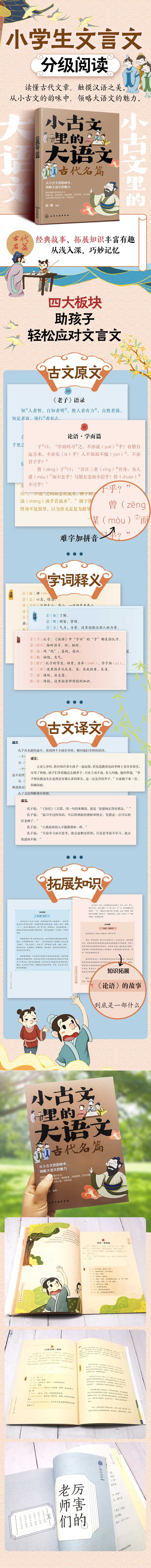 【前言】面对课本里的文言文,我们常常遇到三种烦恼。 第一种是孩子的烦恼:如何让古文变简单,让古文变有趣? 第二种是家长的烦恼:如何先让自己搞懂,再去辅导孩子? 第三种是老师的烦恼:如何降低学习难度,提高学习热情? 这套小古文亲子读物;小古文里的大语文,希望能够解决孩子们与文言文相处时的烦恼。书中精选了100 多篇短小有趣、朗朗上口的文言文,从民国课本里的佳作到历史名人故事,涉及面广泛、丰富。 这套书共有五个分册,分别以;传统文化;神话故事;成语故事;历史故事和;古代名篇为主题,从易到难,循序渐进。 书中遴选的文章,包含了《三字经》《弟子规》《论语》和《世说新语》等出现在部编版语文教材中的蒙学经典和大家耳熟能详的历史故事、成语故事,这些作为孩子们文言文的启蒙阅读再合适不过。 每一篇文言文,除了原文之外,还有;注释;译文和;拓展故事三个栏目,从所有疑难字的意思,到所有句子的白话译文,再到整篇文言文的解读和诠释,尽可能地做到完整、详尽,让家长和孩子共同阅读的时候能够做到双方的无障碍交流、沟通。 另外,书中还为部分文言文特别设置了;知识拓展栏目,讲述与文章相关的知识和故事。让孩子们能在一套书中尽情领略中华文明的博大精深和中国文人的风骨神韵。 这套书包含了部编版小学语文教材中的全部必背文言文,结合小学现阶段语文教材的新变化和语文教学大纲的新要求,以及作者十余年的国学研究经验,将古文学习与课本教材相结合。同时,将丰富的中国传统文化常识融汇其中,通过;文白对读的学习方法,在一;文一;白的对比阅读中,让孩子爱上古文,提高学习的效率。 读懂古代文章,触摸汉语之美。从小古文的韵味中,领略大语文的魅力。让我们一起开始这趟轻松愉快的;小古文之旅吧!
