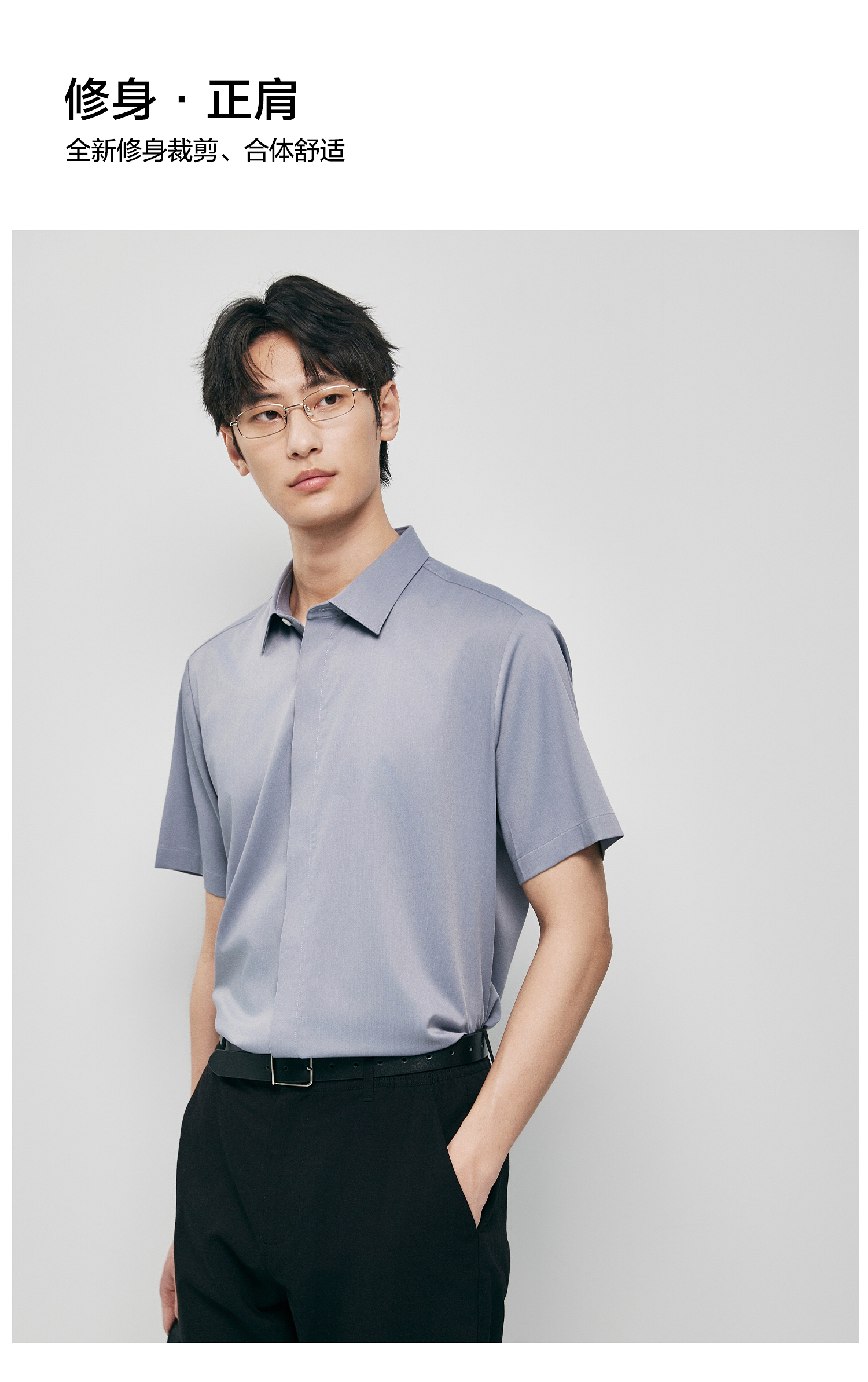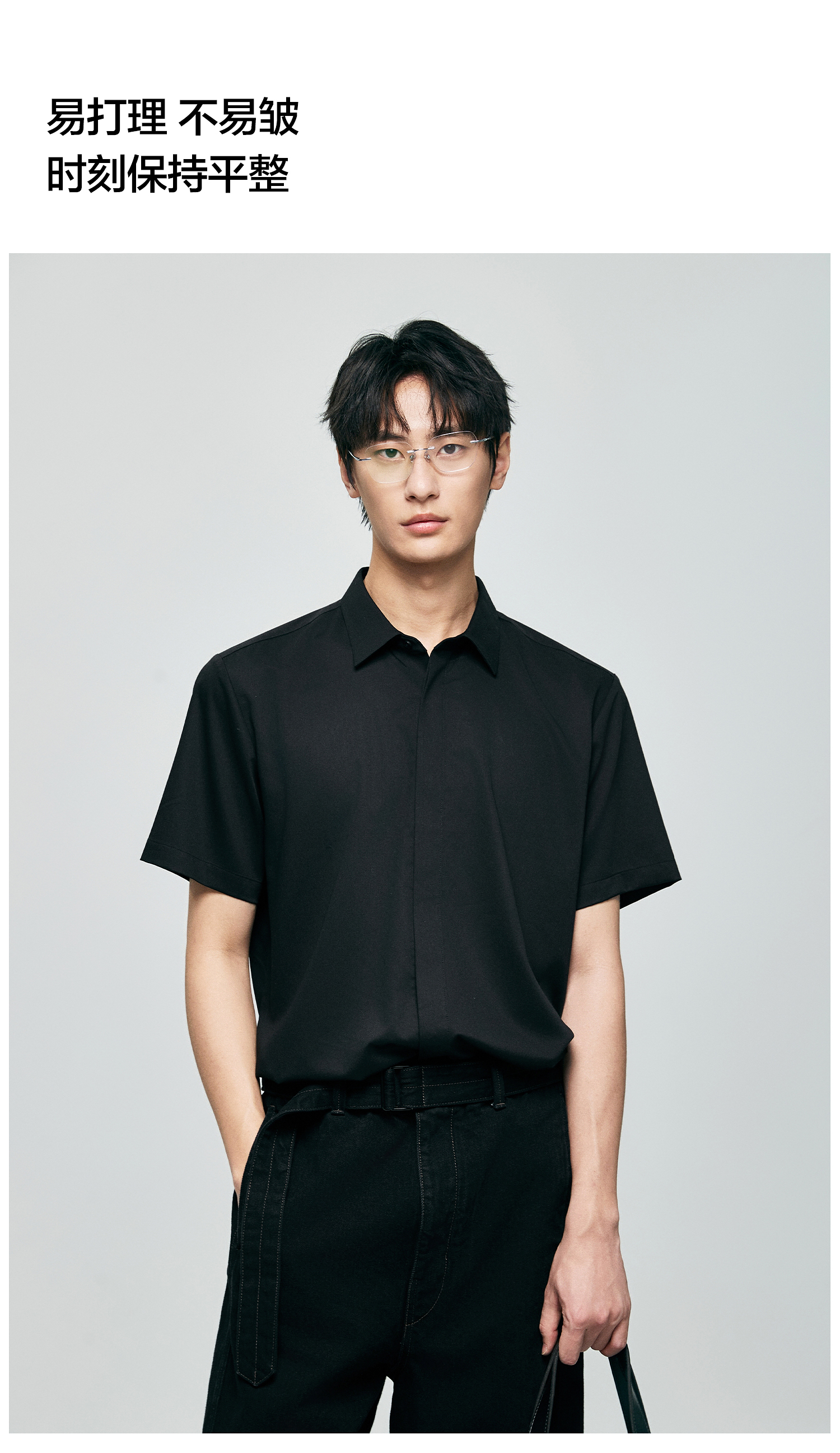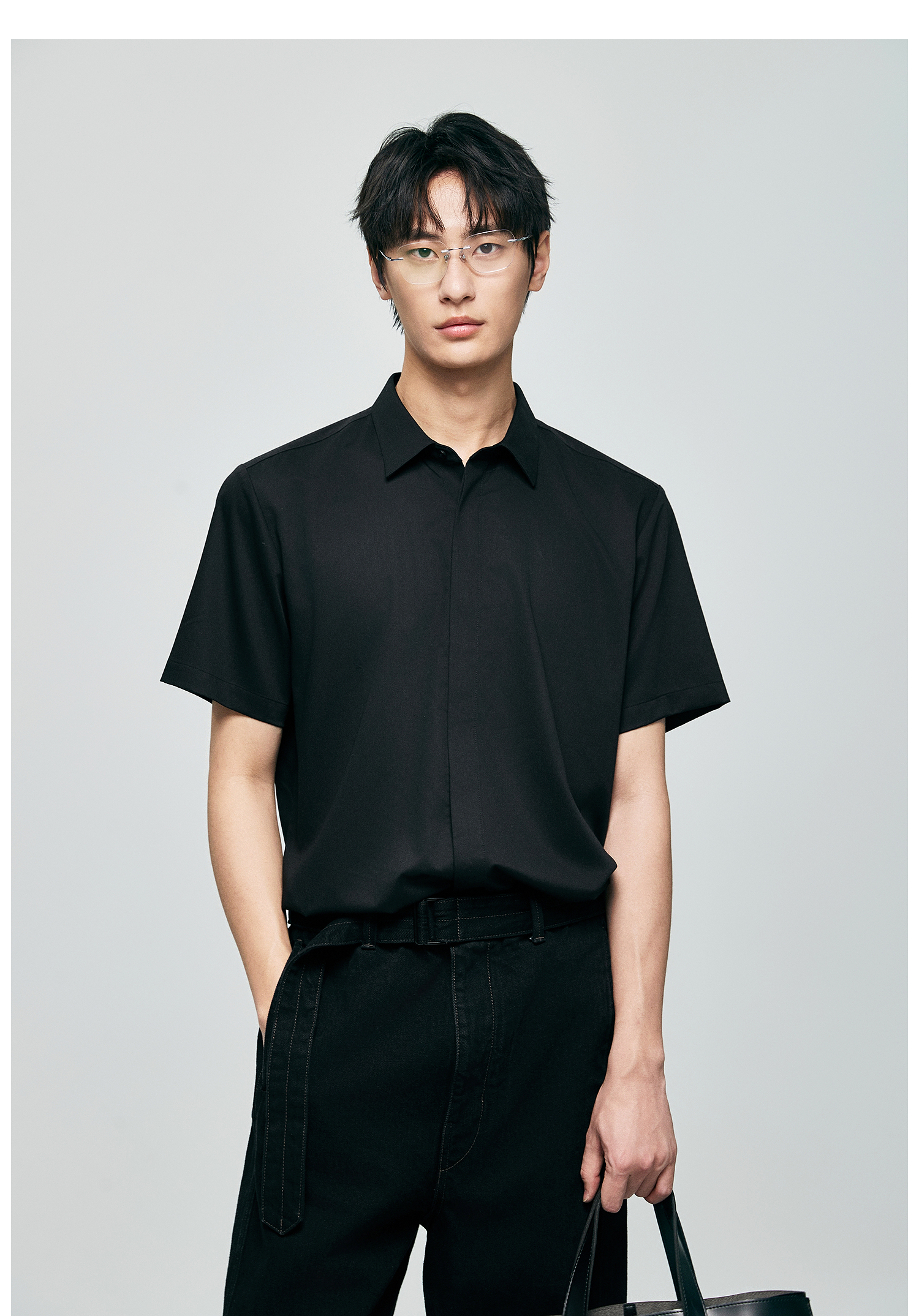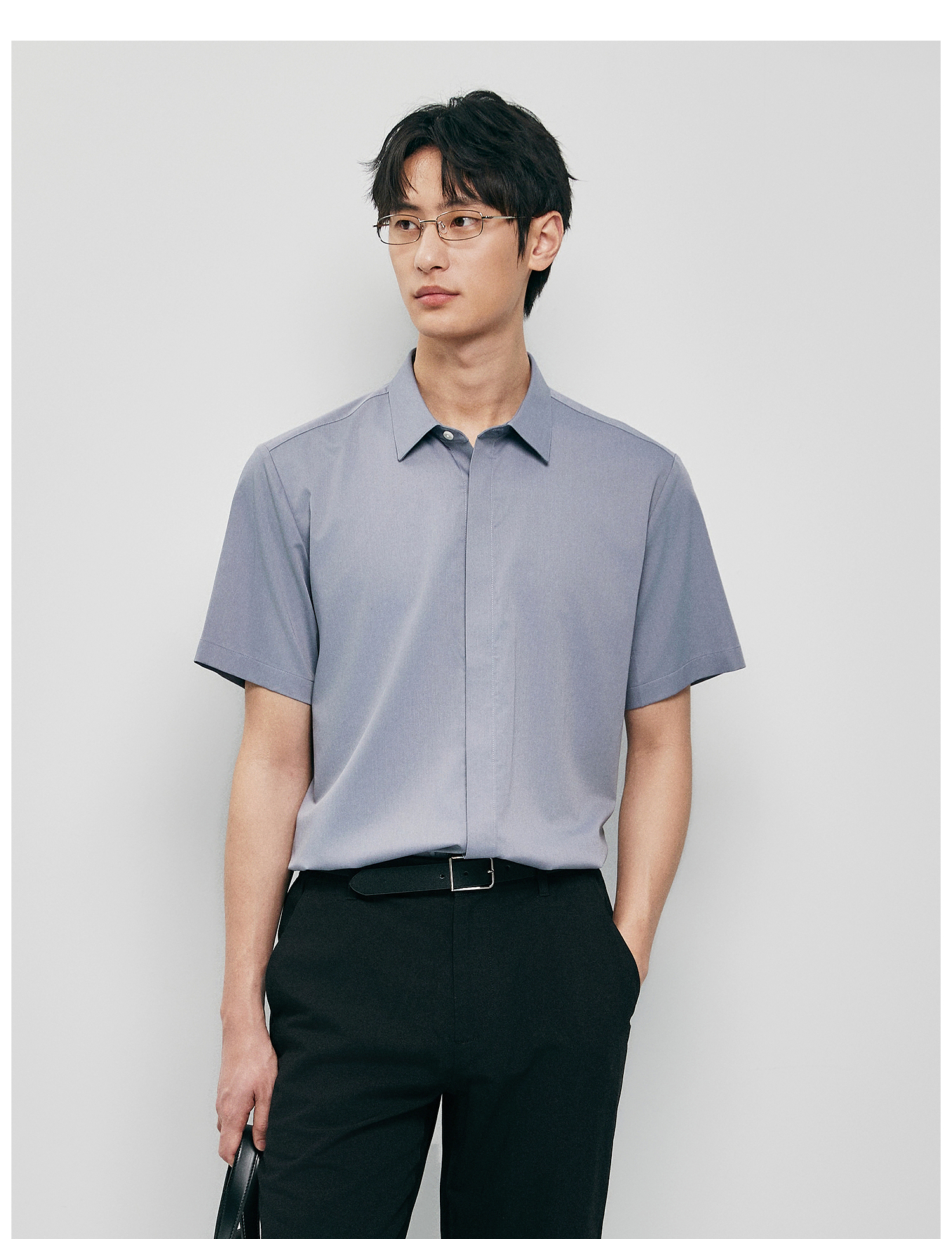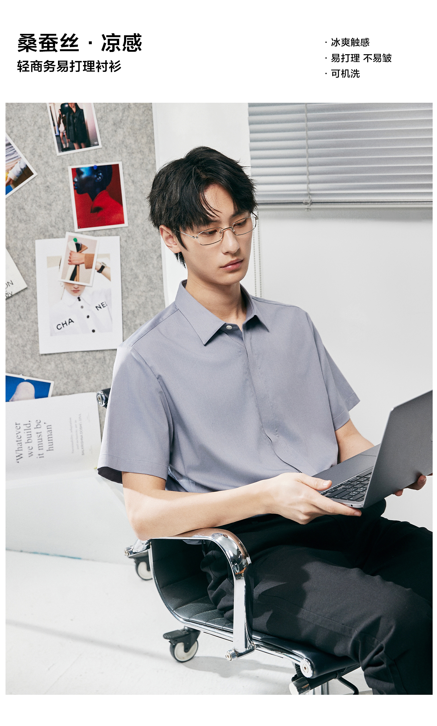 棉仓363804005-正肩桑蚕丝竹纤维暗门襟翻领短袖衬衫