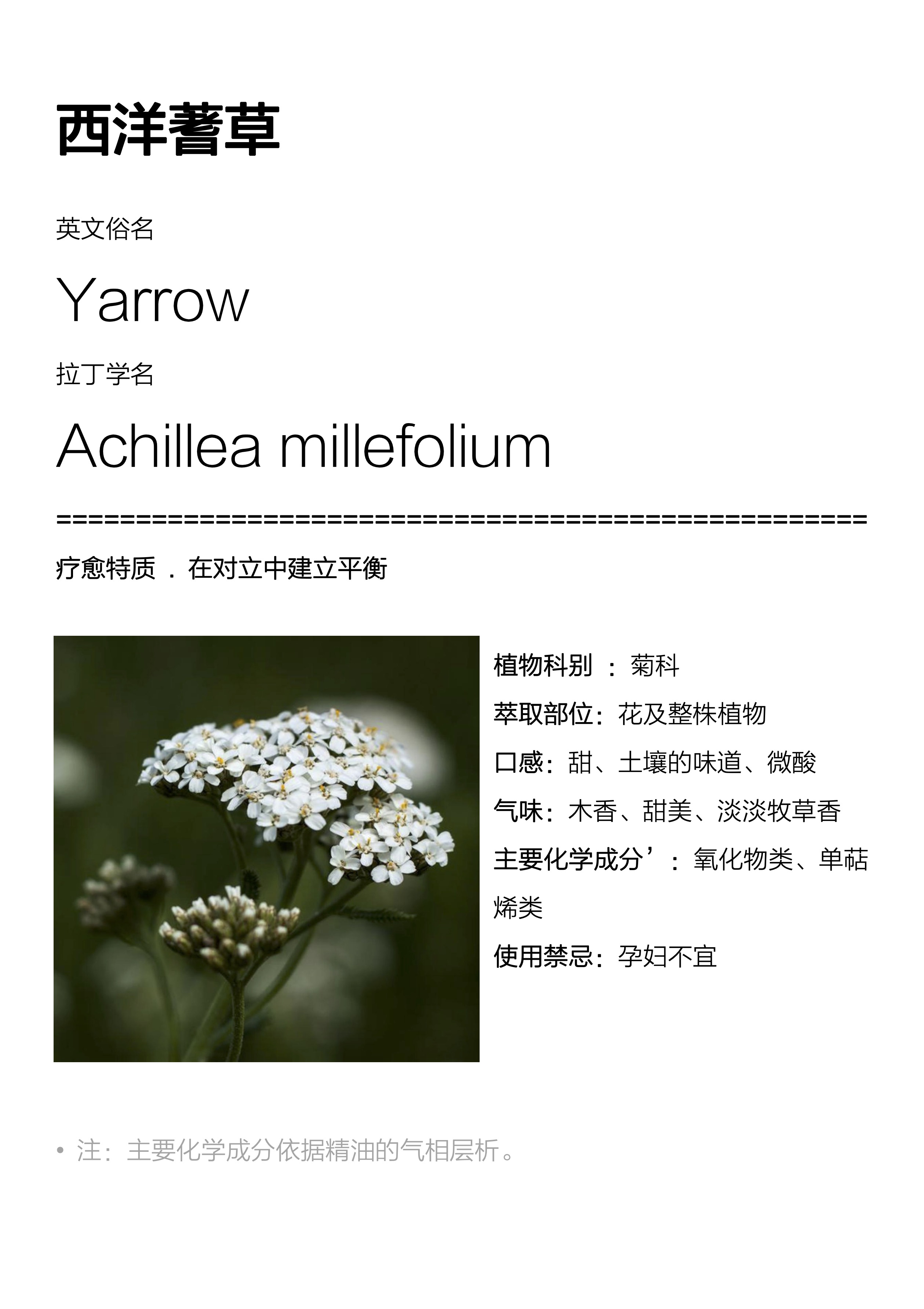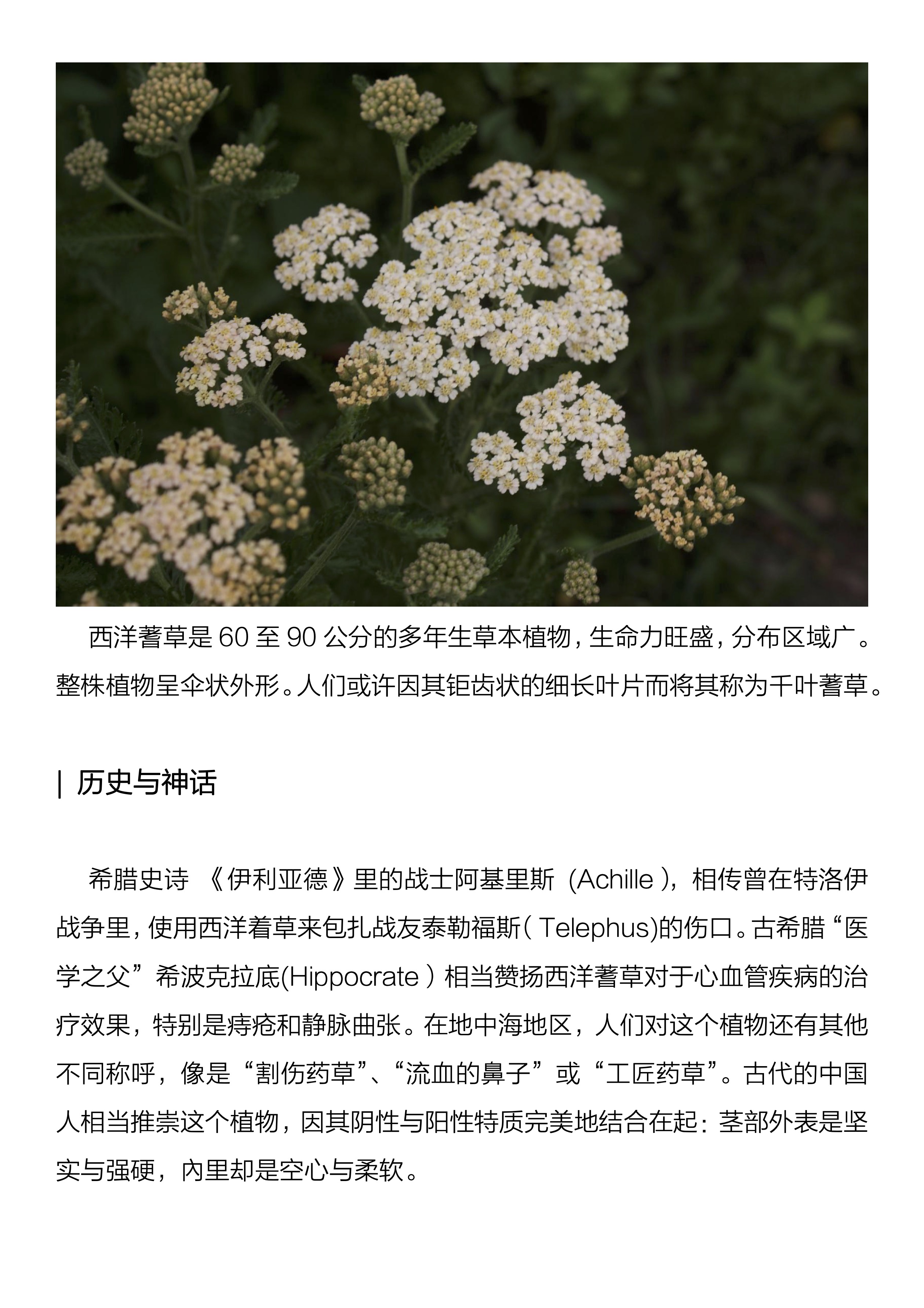 西洋蓍草,学名Achillea millefolium,这种植物属于菊科,是一种生命力旺盛的多年生草本植物。希腊史诗《伊利亚德》里的战士阿基里斯 (Achille),相传曾在特洛伊战争里,使用西洋蓍草来包扎战友泰勒福斯( Telephus)的伤口。古希腊“医学之父” 希波克拉底(Hiopocrate)相当赞扬西洋蓍草对于心血管疾病的治疗效果,特别是痔疮和静脉曲张。在地中海地区,人们对这个植物还有其他不同称呼,像是“割伤药草”、“流血的鼻子”或“工匠药草”。在我国古代,因其阴性与阳性特质完美地结合,亦相当受人推崇。西洋蓍草精露是从西洋蓍草的花和整株植物中萃取出来的。它的主要成分包括氧化物类和单萜烯类,不仅赋予了它独特的香气,还拥有了强大的疗愈特性。