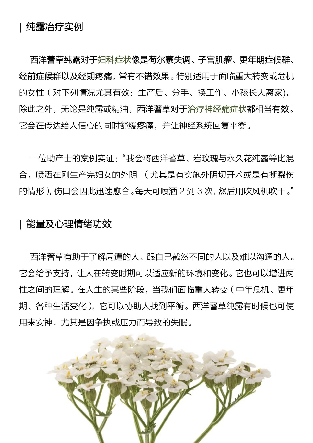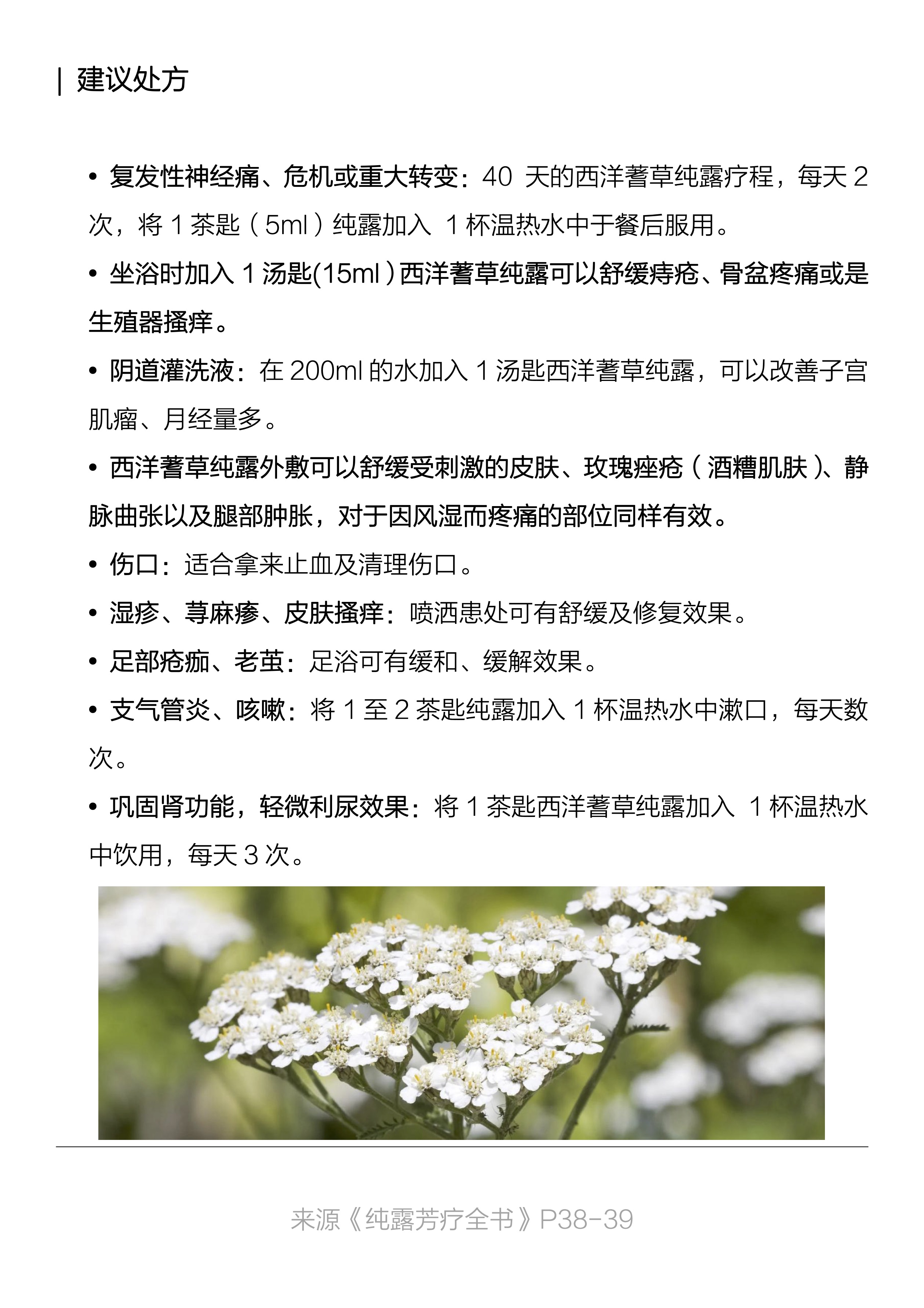 复发性神经痛、危机或重大转变:可以试试40天的西洋蓍草精露疗程,每天2次,将5ml纯露加入1杯温热水中于餐后服用。