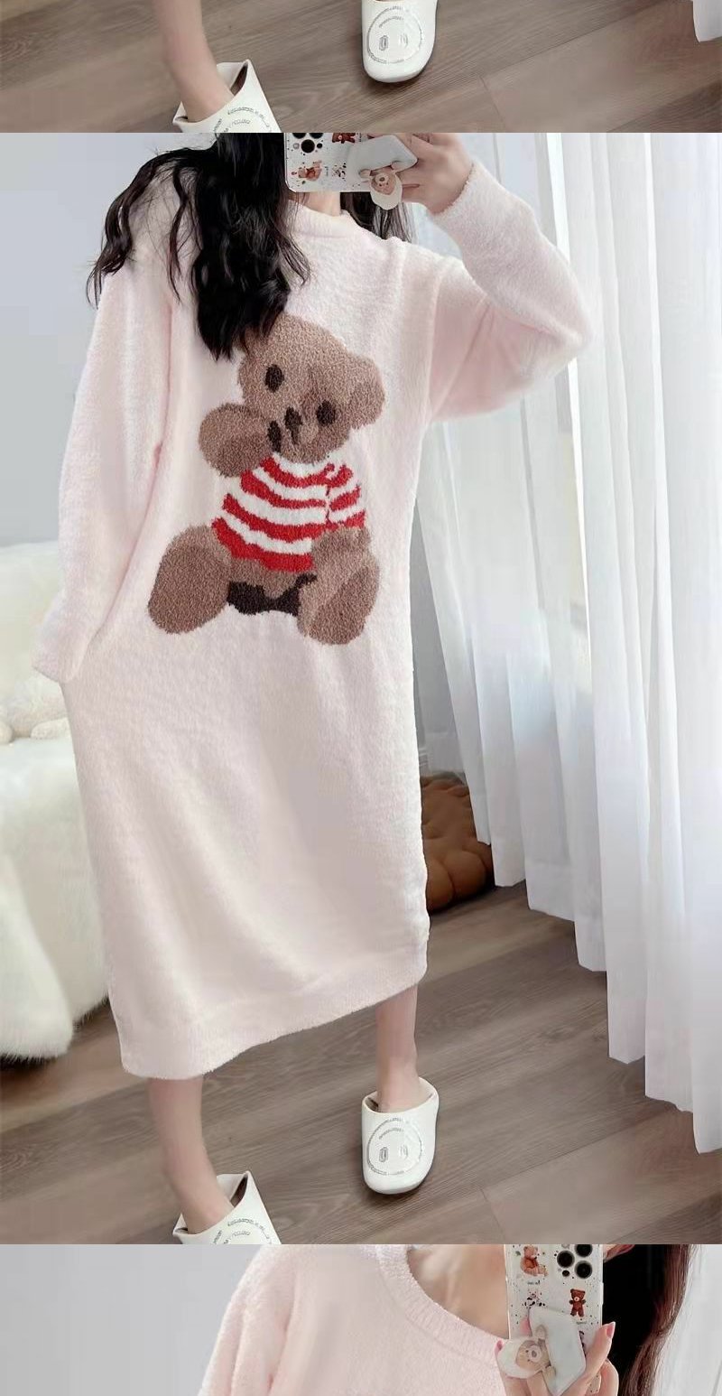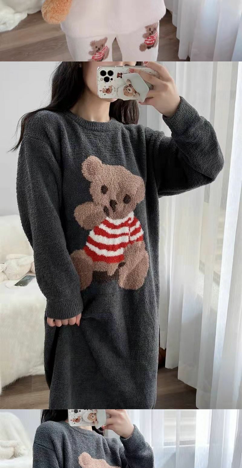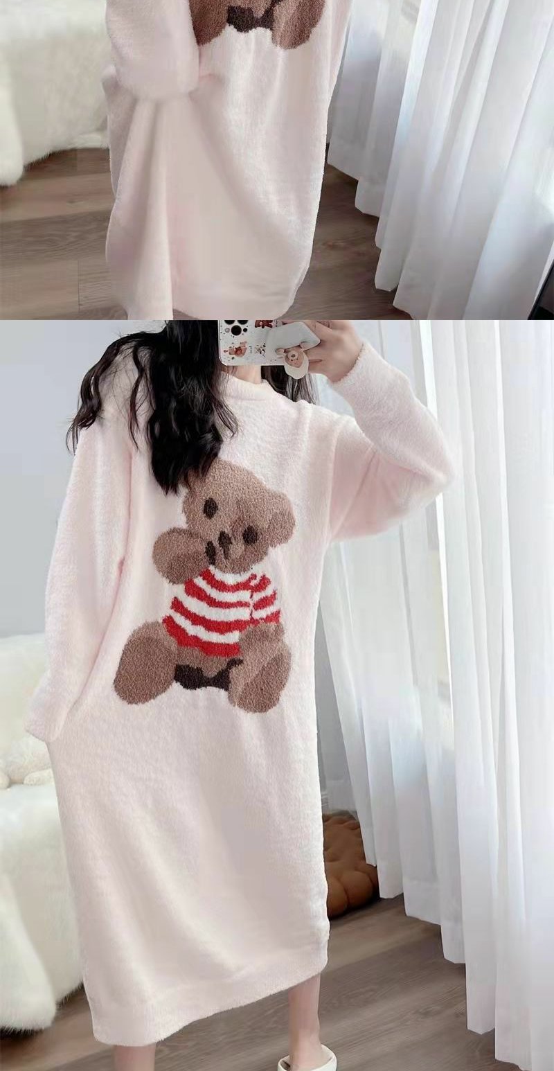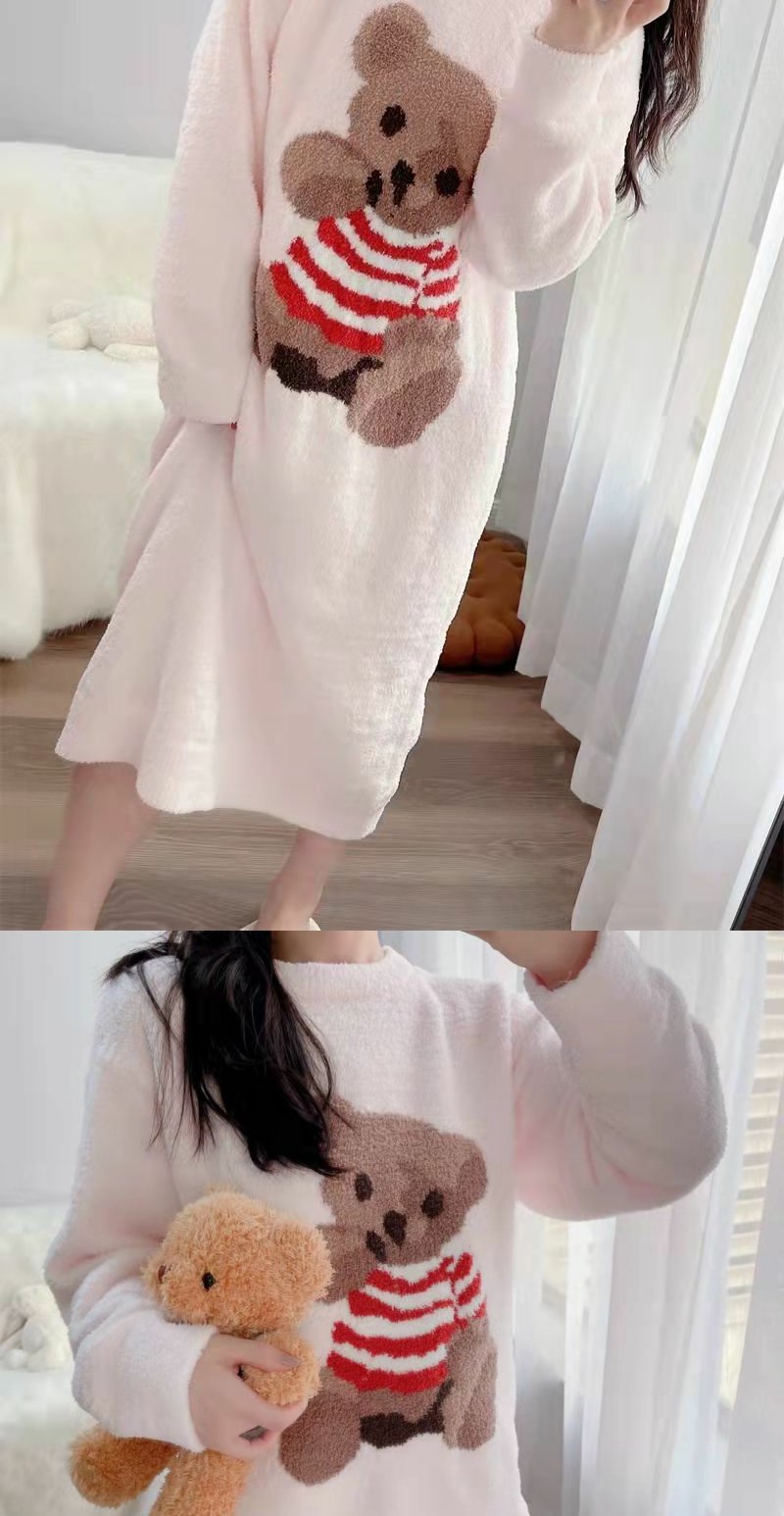 睡衣女秋冬季长款珊瑚绒加绒加厚小熊宽松睡裙学生宿舍家居服套装